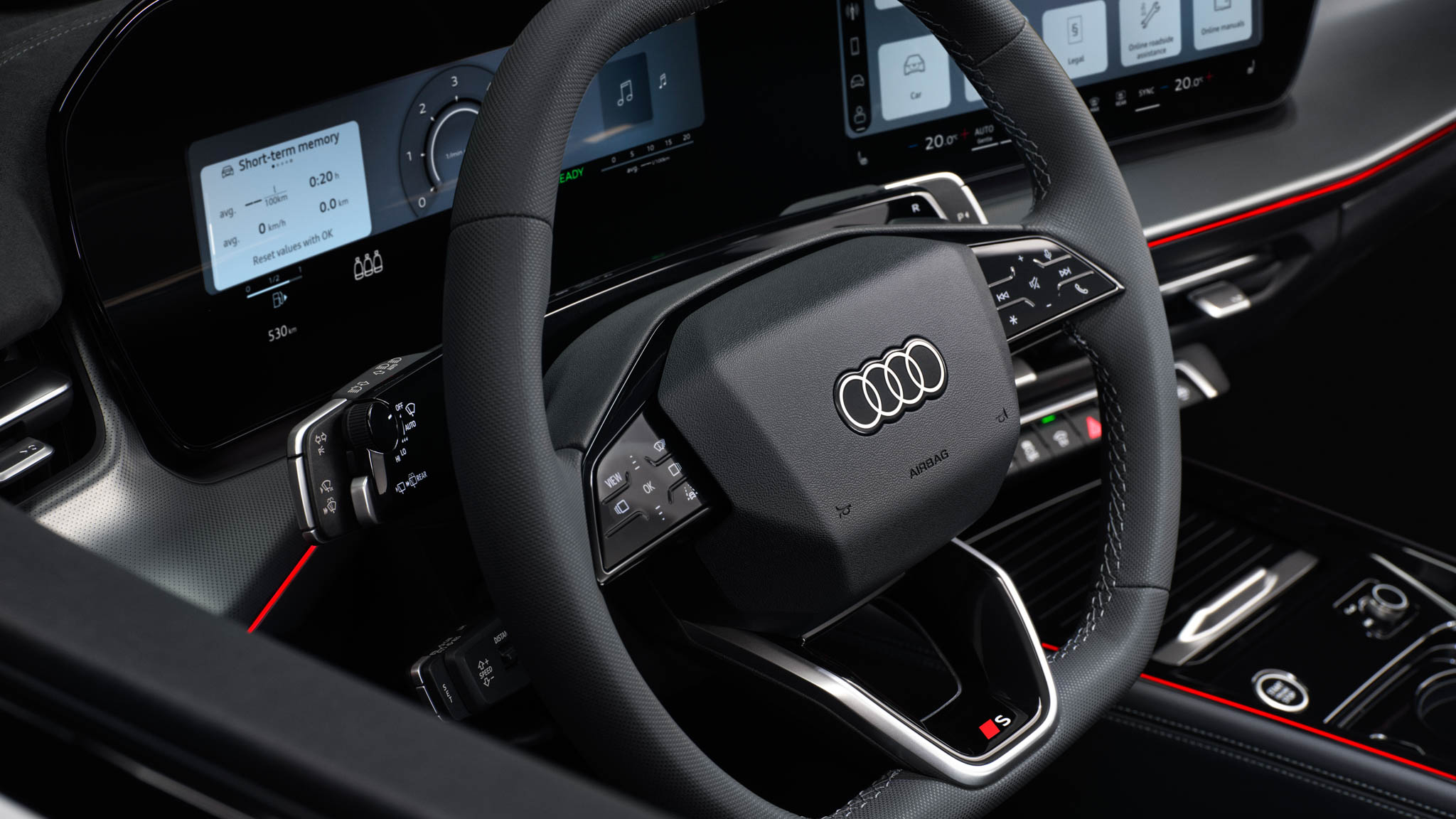 El volante, específico para el acabado S Line, tiene retroiluminación y botones capacitivos, mientras que los asientos combinan piel natural y sintética, con opciones deportivas en microfibra que mejoran la transpirabilidad. Da una buena sensación de ajuste y la calidad de los materiales es excelente, con plásticos suaves y textiles de microfibra en las puertas traseras.