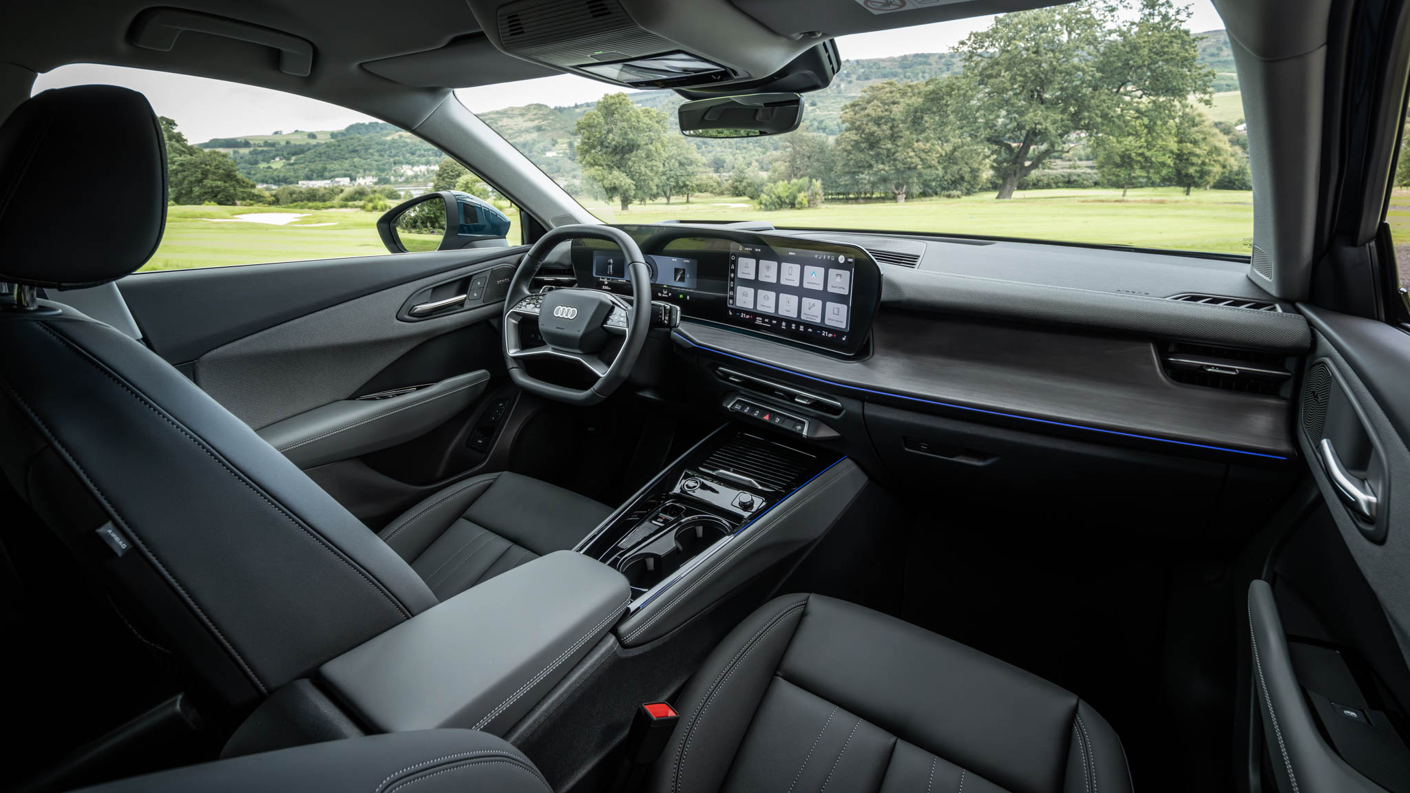 Entre los asientos delanteros, encontramos una consola central con bastante espacio para bebidas y una base de carga inalámbrica para el móvil. Sin embargo, notarás que el selector de marchas ahora está montado en la columna de dirección. Este ingenioso sistema integra de forma limpia el selector de marchas, los intermitentes y los limpiaparabrisas en un panel elegante detrás del volante. Ya hemos probado este sistema en el nuevo Q3 SUV y hemos comprobado que está bien posicionado y es fácil de usar, además de liberar más espacio en el habitáculo.