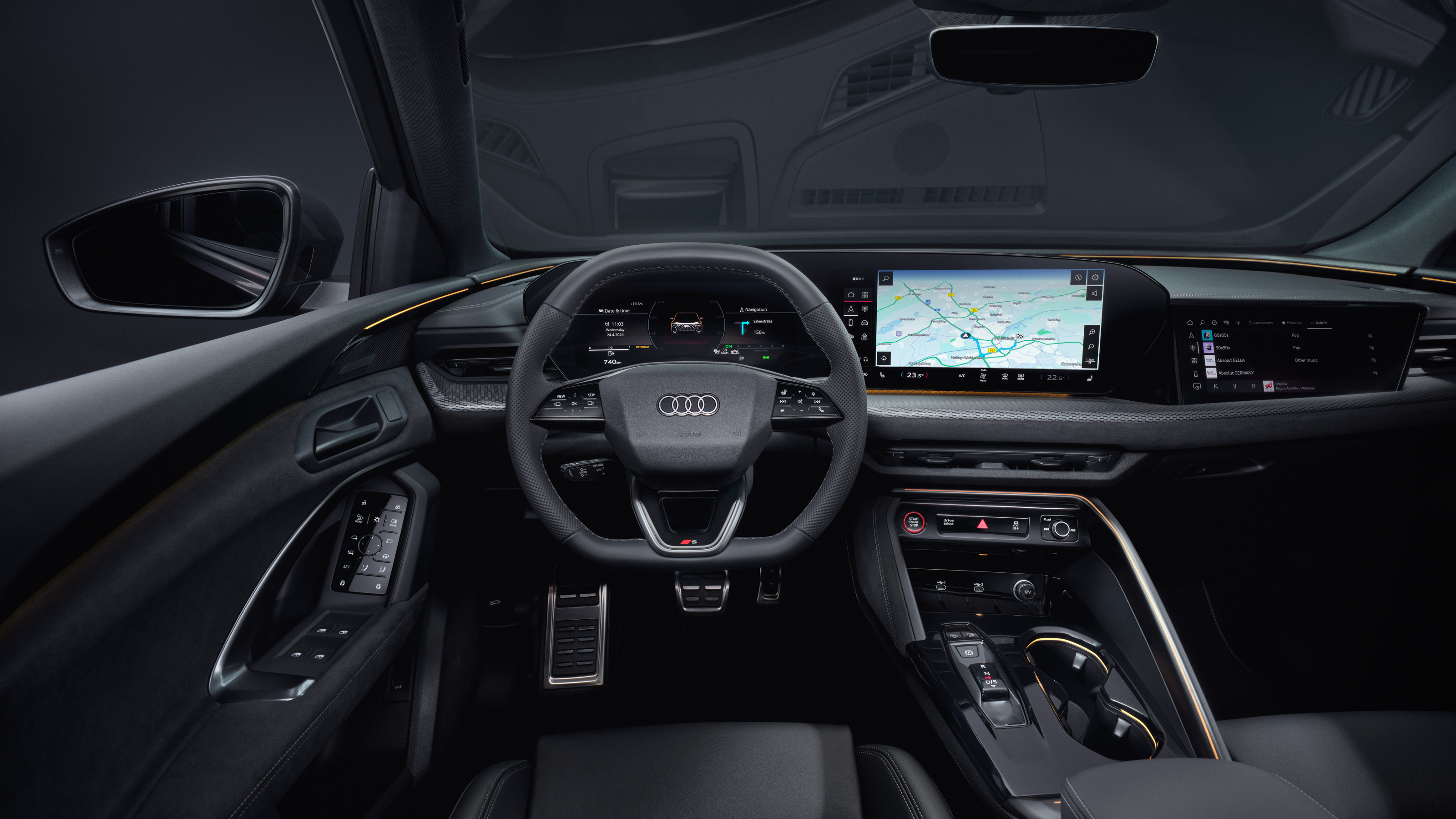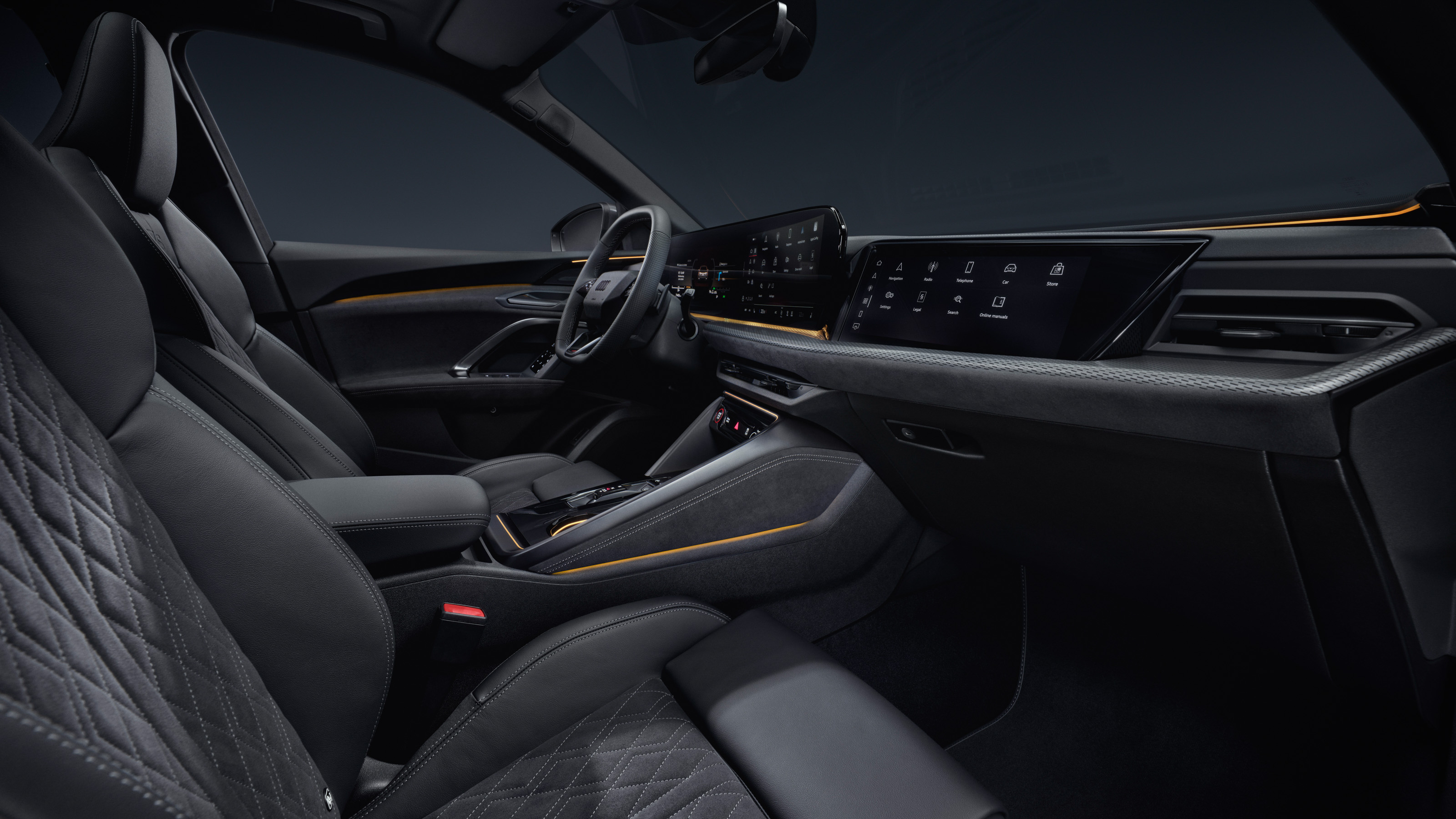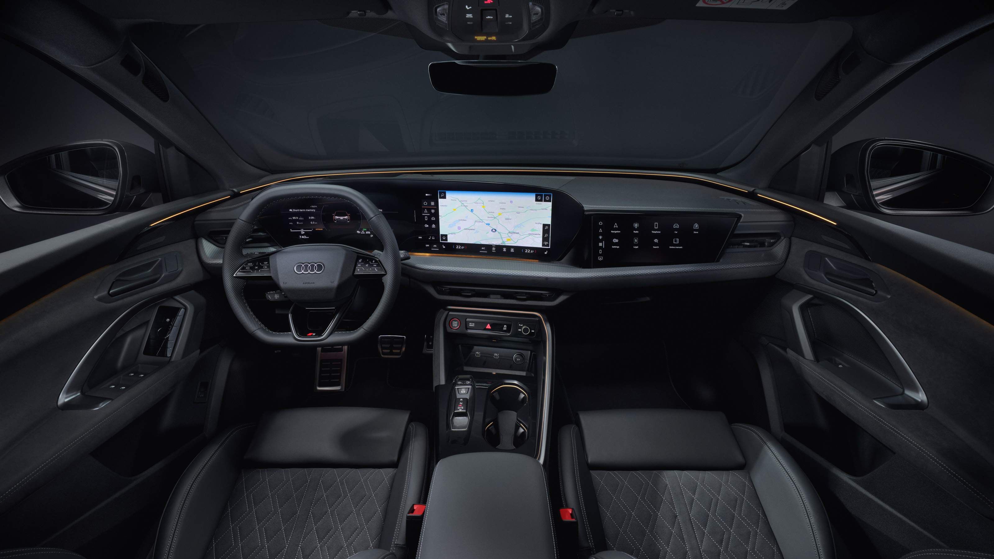 El interior del Audi Q5 está diseñado para ofrecer una experiencia premium, con una combinación de materiales de alta calidad y un enfoque en la comodidad y funcionalidad. El habitáculo cuenta con acabados refinados que pueden incluir materiales como cuero, microfibra sostenible Dinamica y otros tejidos reciclados, siguiendo la filosofía de diseño "Material Driven Design" de Audi. El diseño del salpicadero es limpio y horizontal, con líneas simples que maximizan la sensación de amplitud. Además, detalles como las inserciones en aluminio o madera y la iluminación ambiental crean un ambiente acogedor y moderno.