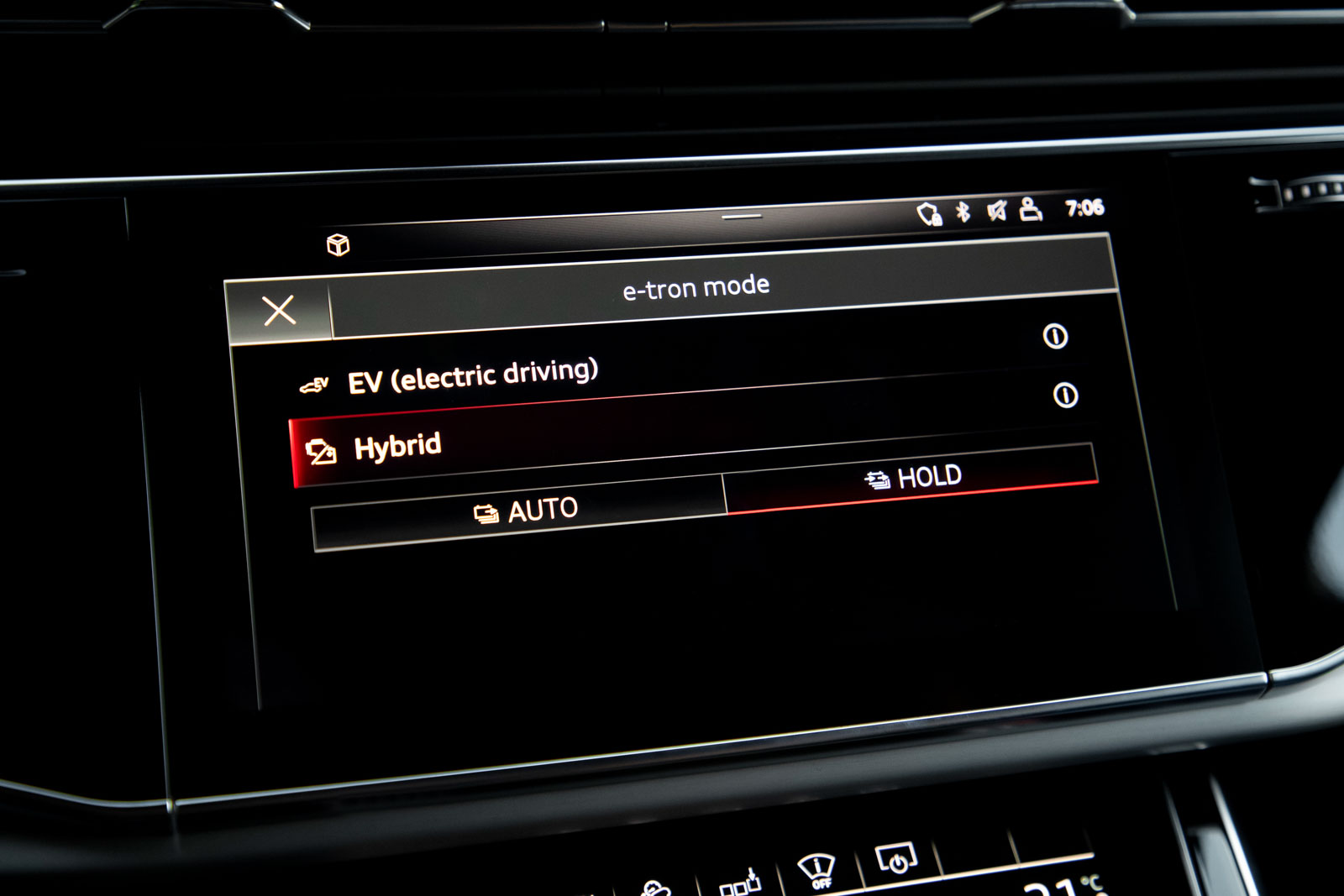 No obstante, el Audi Q7 ha conseguido homologar 55 kilómetros de autonomía únicamente eléctrica. Una cifra, vamos a decir, muy optimista. Tiene tracción a las 4 ruedas de serie y diferentes modos de conducción. Entre ellos, uno que permite mantener la carga de la batería, no recargar con el motor de gasolina, gracias sobre todo a la recuperación de la energía con las frenadas.