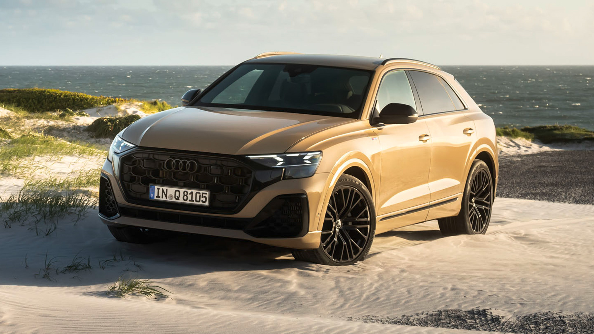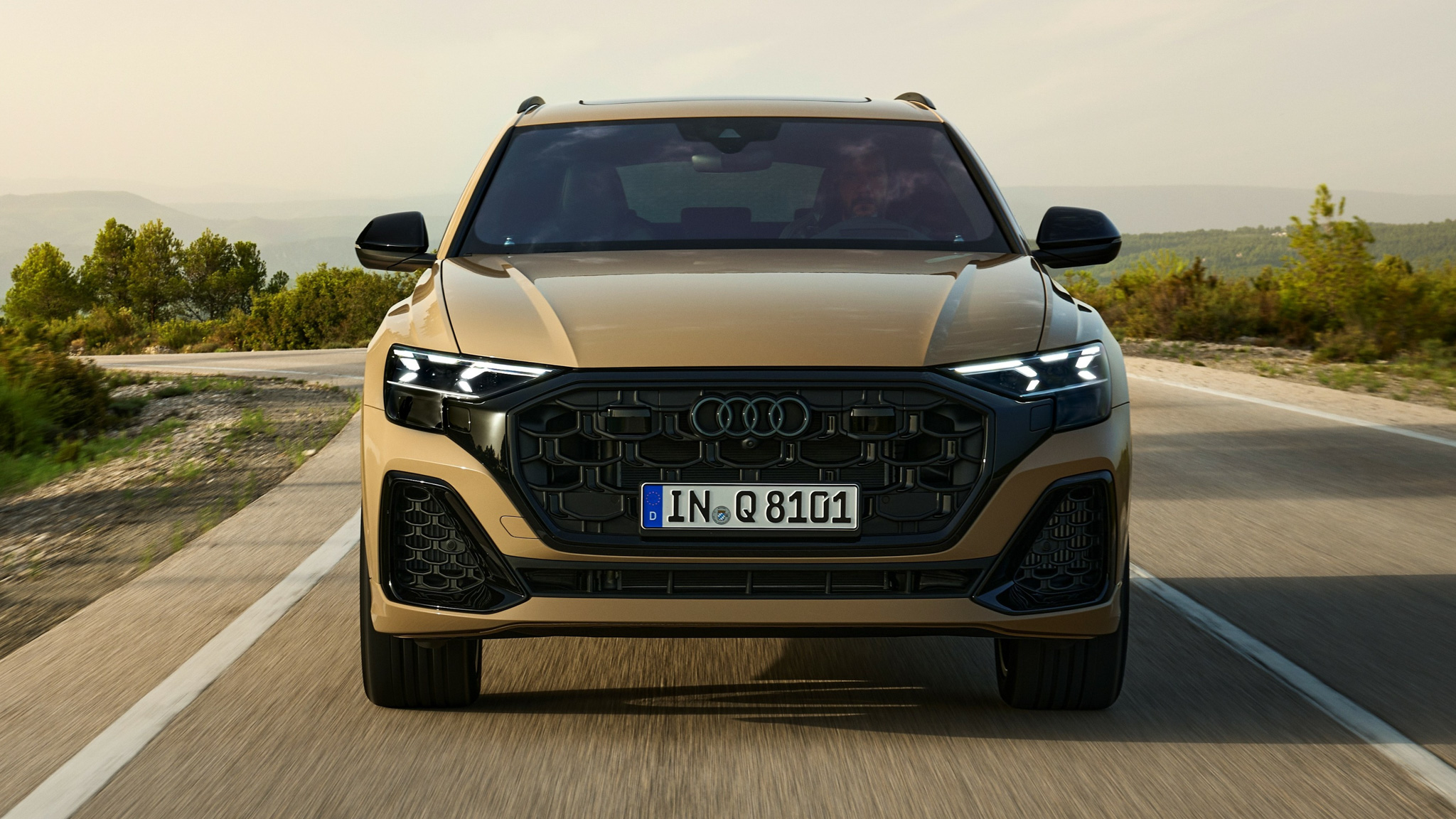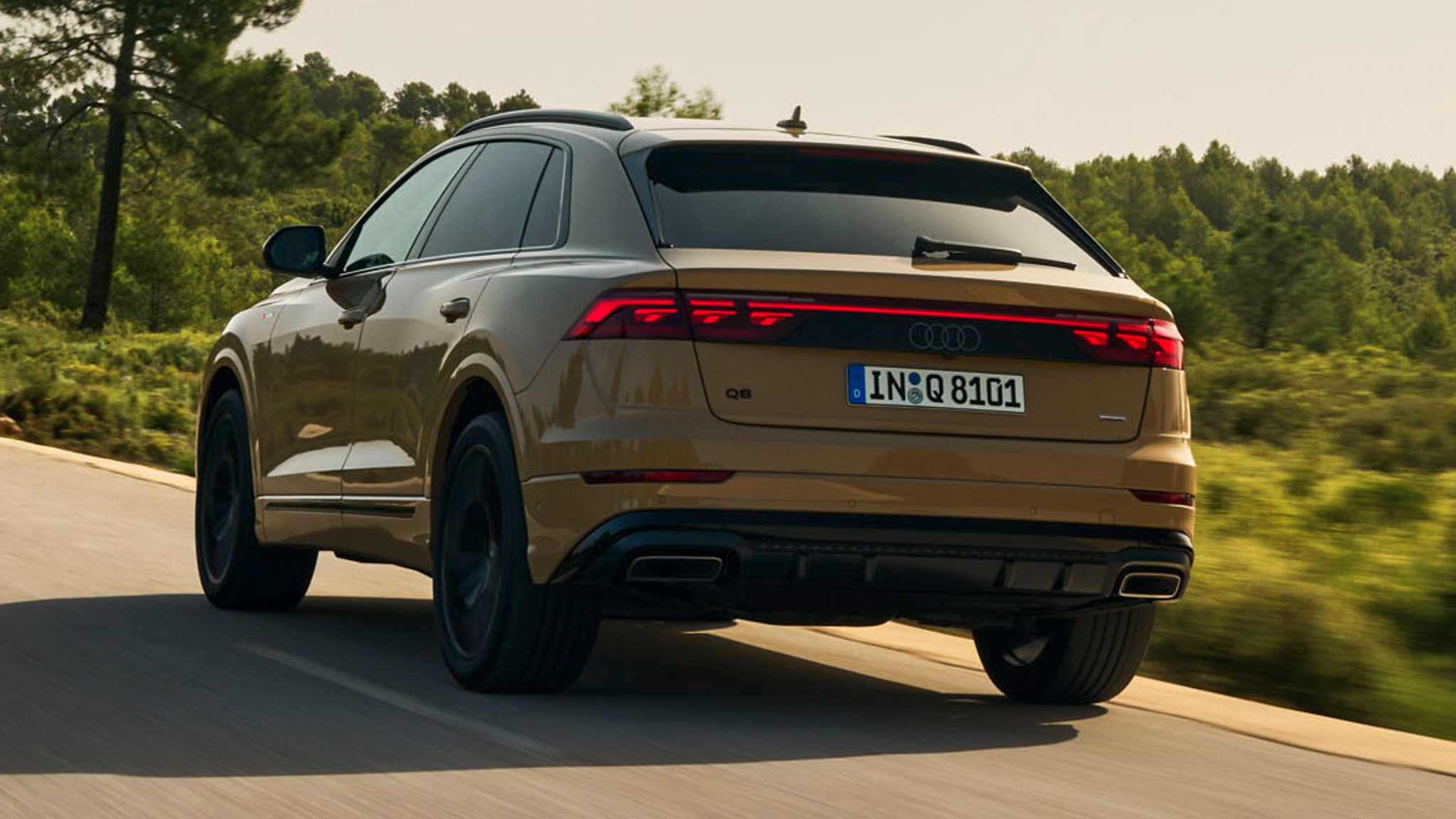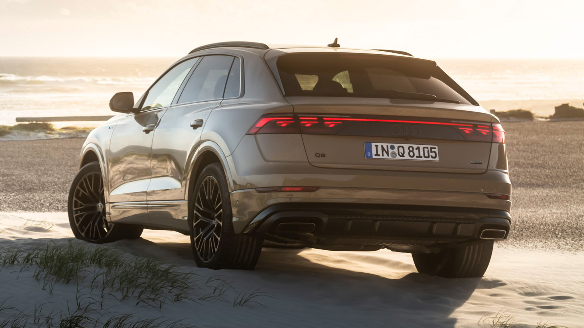 En su última actualización, el Q8 estrena paragolpes rediseñados, faros delanteros HD Matrix LED y luces traseras OLED, además de mejoras en los acabados interiores y en el sistema híbrido enchufable. Ofrece versiones con etiqueta ECO (mild-hybrid), tanto en motores diésel como gasolina, con potencias que van desde los 231 hasta los 507 CV de la versión deportiva SQ8. También hay dos versiones híbridas enchufables de 394 CV y 490 CV con autonomía eléctrica de hasta 84 km. La tracción total quattro y suspensión neumática adaptativa son de serie en todos.