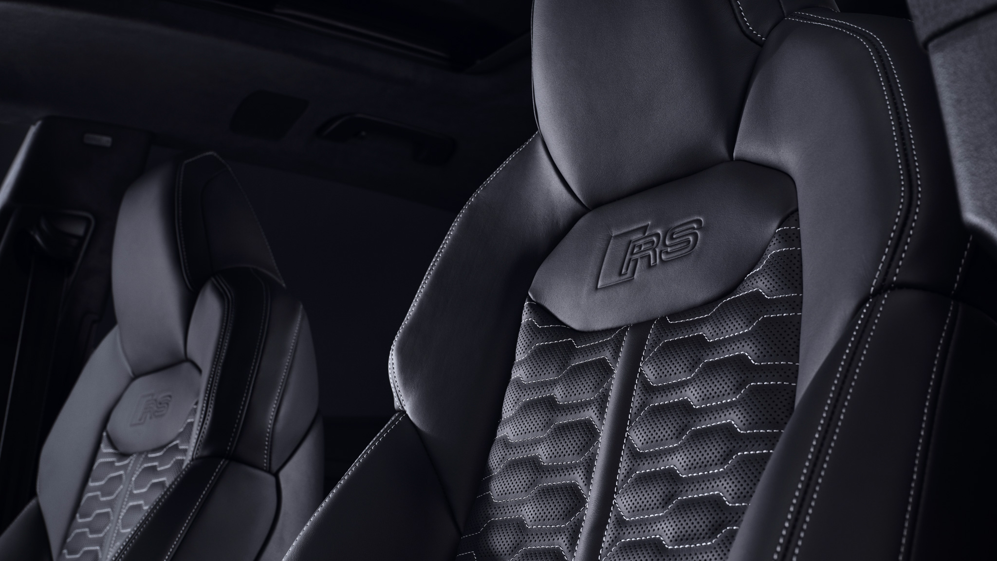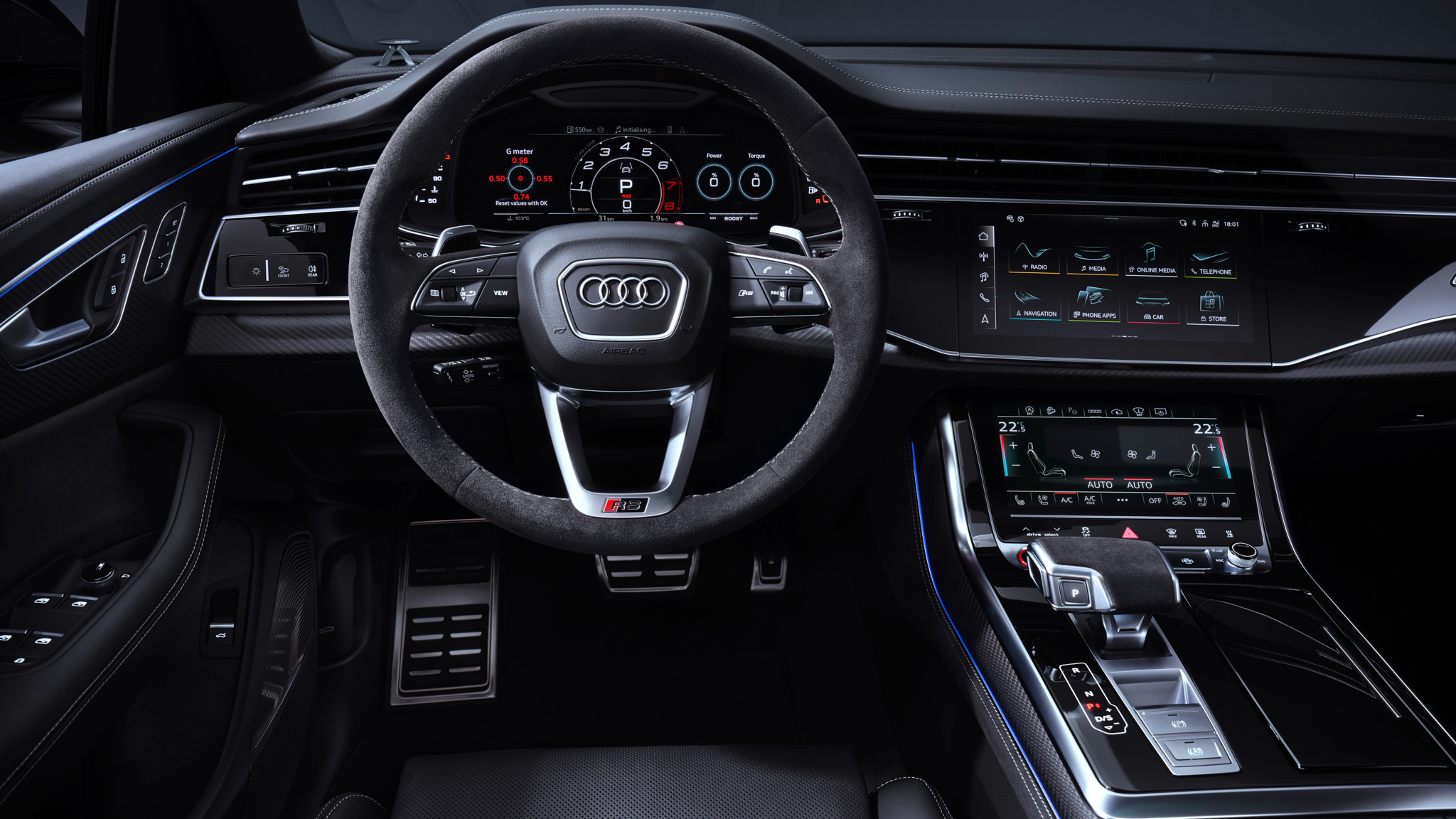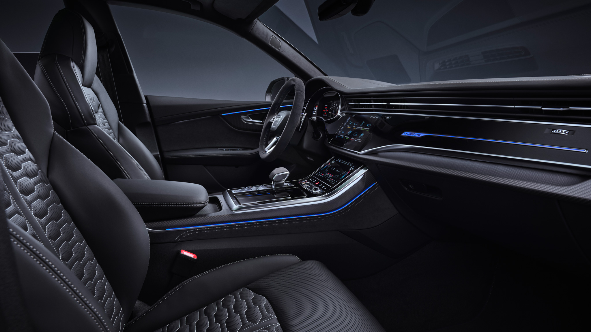 El interior del RS Q8 es un ejemplo de calidad: los materiales predominantes son cuero, Alcantara y fibra de carbono. Los asientos deportivos RS, con costuras en forma de panal, ofrecen un soporte excepcional y están disponibles en diferentes acabados de color, como rojo, azul o gris, dependiendo del paquete RS seleccionado. El diseño del habitáculo es limpio y moderno, con una integración fluida de las pantallas digitales y los controles táctiles. Además, cuenta con detalles como la iluminación ambiental personalizable y los pedales de aluminio.