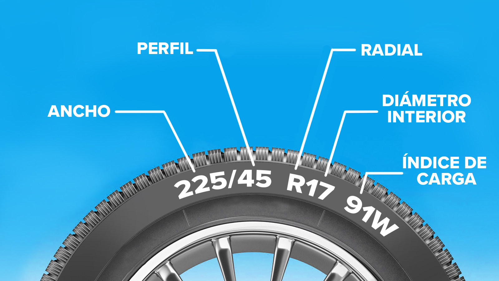 La talla europea de un neumático viene formulada en su flanco exterior como XXX/XX RXX, donde las X son números y la R significa radial, mientras que sus índices se muestran como XXY, donde las X son números y la Y una letra. Cada apartado manifiesta un indicador o una dimensión. Pongamos el ejemplo de una medida 225/45 R17 91W: