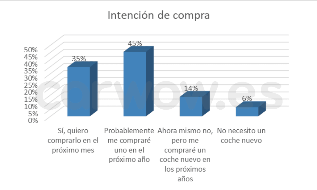 Sobre las previsiones de intención de compra, un 35% de los usuarios potenciales de Carwow comprará un coche en el próximo mes, un 45% lo hará en el próximo año y un 6% asegura que, aunque lo busque, no necesita un coche nuevo ni lo comprará en el corto plazo.