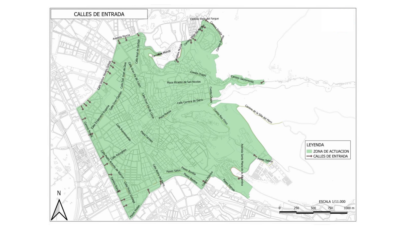 - Zona 2: Zona perimetrada por el área comprendida por Puente Blanco, Acera del Darro, Puerta Real, Reyes Católicos, Plaza Nueva, Carrera del Darro, Cuesta del Rey Chico, Paseo de la Silla del Moro, Paseo de la Sabica, Avenida Santa María de la Alhambra, Paseo de las Palmas (parcialmente), Cuesta Molinos, Puente Verde y Paseo de los Basilios