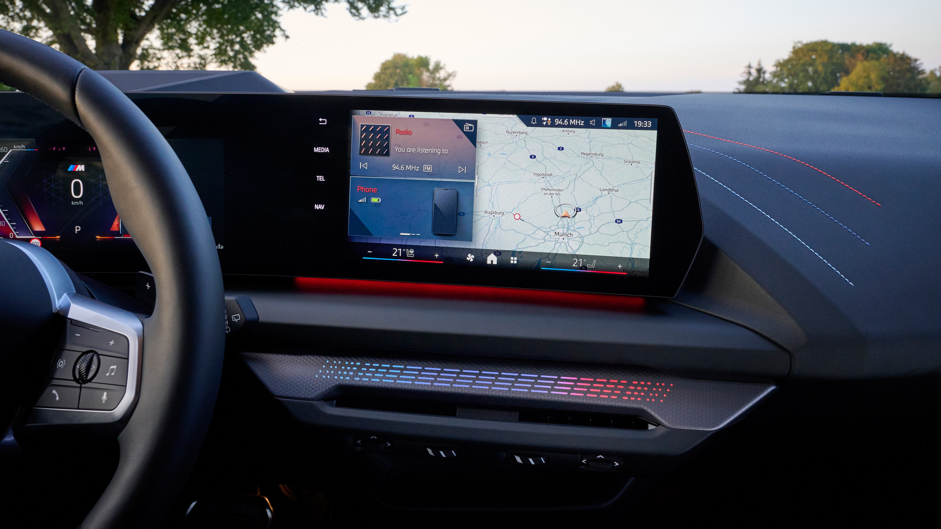 El sistema multimedia del BMW Serie 1 incorpora el nuevo BMW iDrive 9, con acceso rápido a las funciones a través de la pantalla táctil y comandos de voz. Es compatible con Apple CarPlay y Android Auto, permitiendo una conectividad fluida con dispositivos móviles. Además, se ofrece como opción un head-up display y otras características avanzadas como la realidad aumentada para la navegación. Aunque es intuitivo y moderno, algunos usuarios pueden notar cierta lentitud al cambiar entre menús.