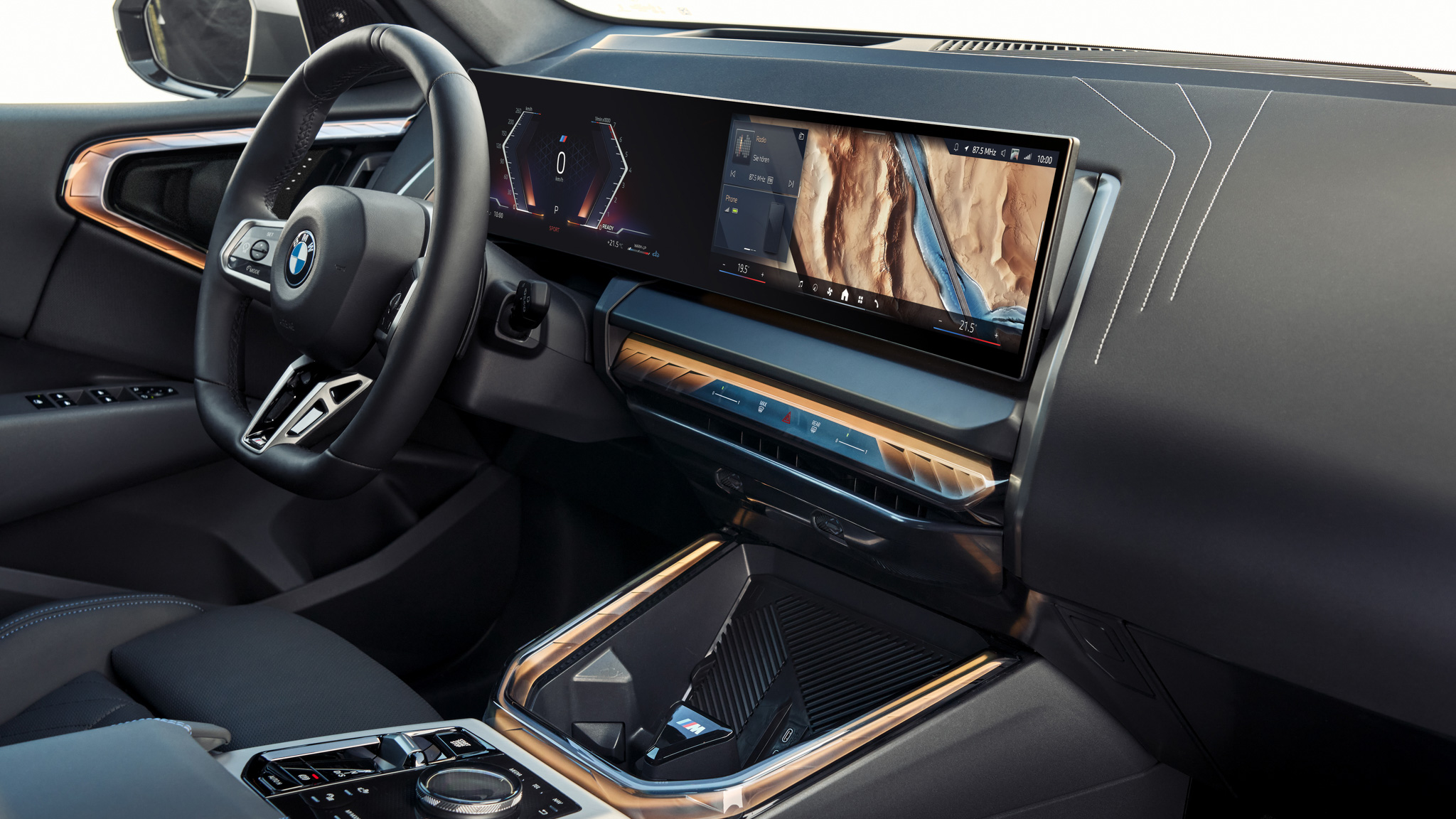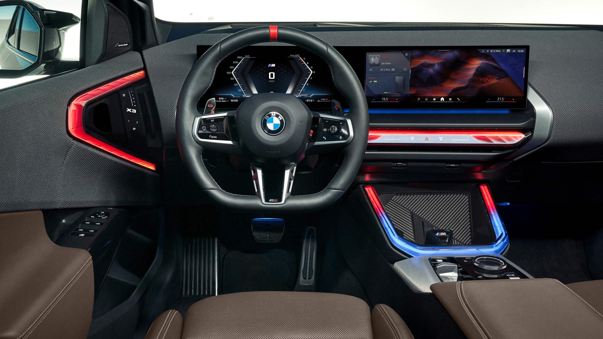 El habitáculo del BMW X3 refleja una clara inspiración en el diseño de modelos eléctricos como el BMW iX, apostando por una estética minimalista y tecnológica. Uno de los elementos visuales más llamativos es el conjunto de pantallas digitales integradas en una superficie curva, que recorre buena parte del salpicadero, así como la barra de interacción retroiluminada. Este se puede configurar en diferentes materiales, desde cuero sintético hasta tejido reciclado, con opciones de color que aportan personalización.