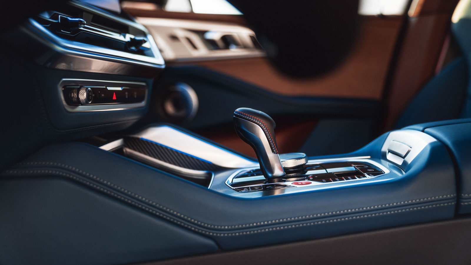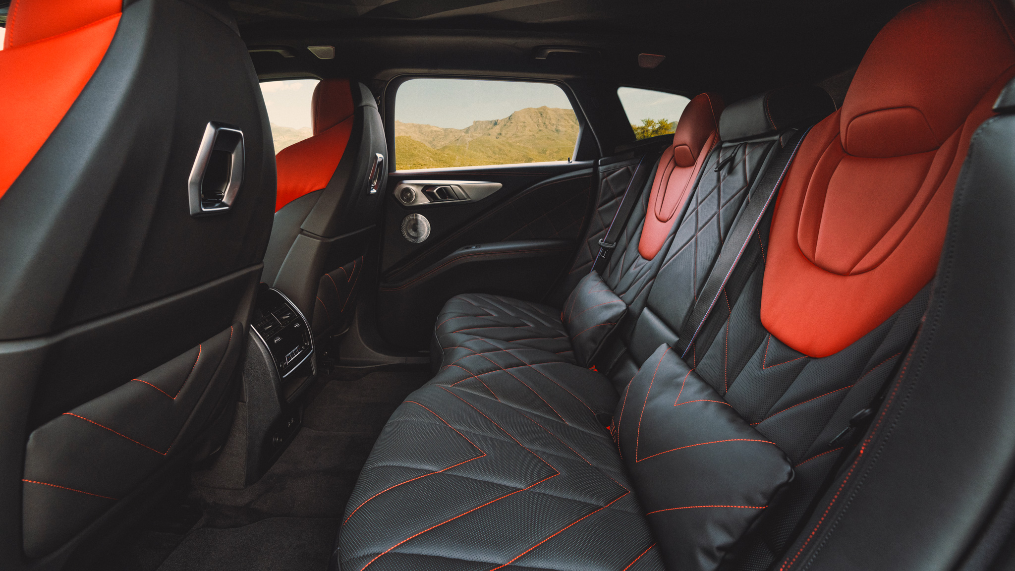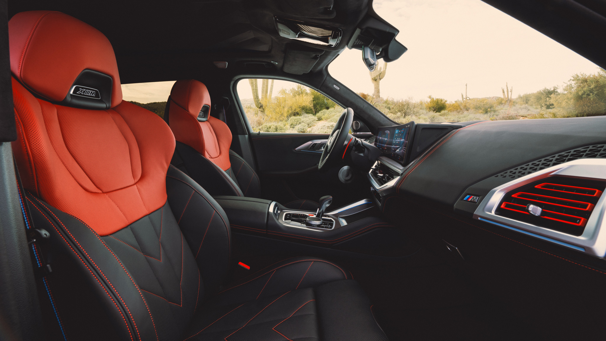 El interior del BMW XM Label Red se diferencia del XM estándar por su carácter más exclusivo y deportivo, con detalles específicos como las costuras en contraste de color rojo presentes en la tapicería de cuero Merino, el cuadro de instrumentos, los paneles de las puertas y la consola central, así como los bordes rojos en los aireadores. Además, los asientos multifunción M incluyen detalles únicos como el distintivo "XM" en color rojo en los reposacabezas, y las molduras interiores en fibra de carbono satinada cuentan con hilos rojos y azules. En el caso de la edición limitada "Label Red Limited", se incluye una placa con la inscripción "1 de 500", que subraya la exclusividad de esta variante.