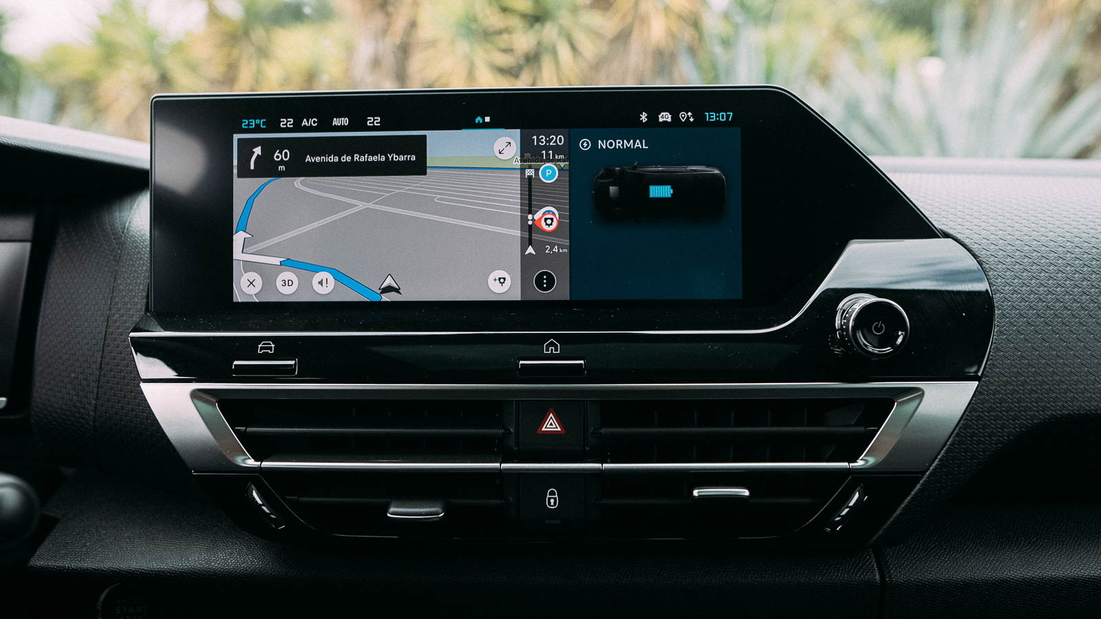 El reconocimiento por voz puede realizarse con un lenguaje natural, tiene conectividad con Apple CarPlay y Android, una bandeja de carga y cuatro tomas USB de tipo A y C, dos delante y dos detrás.