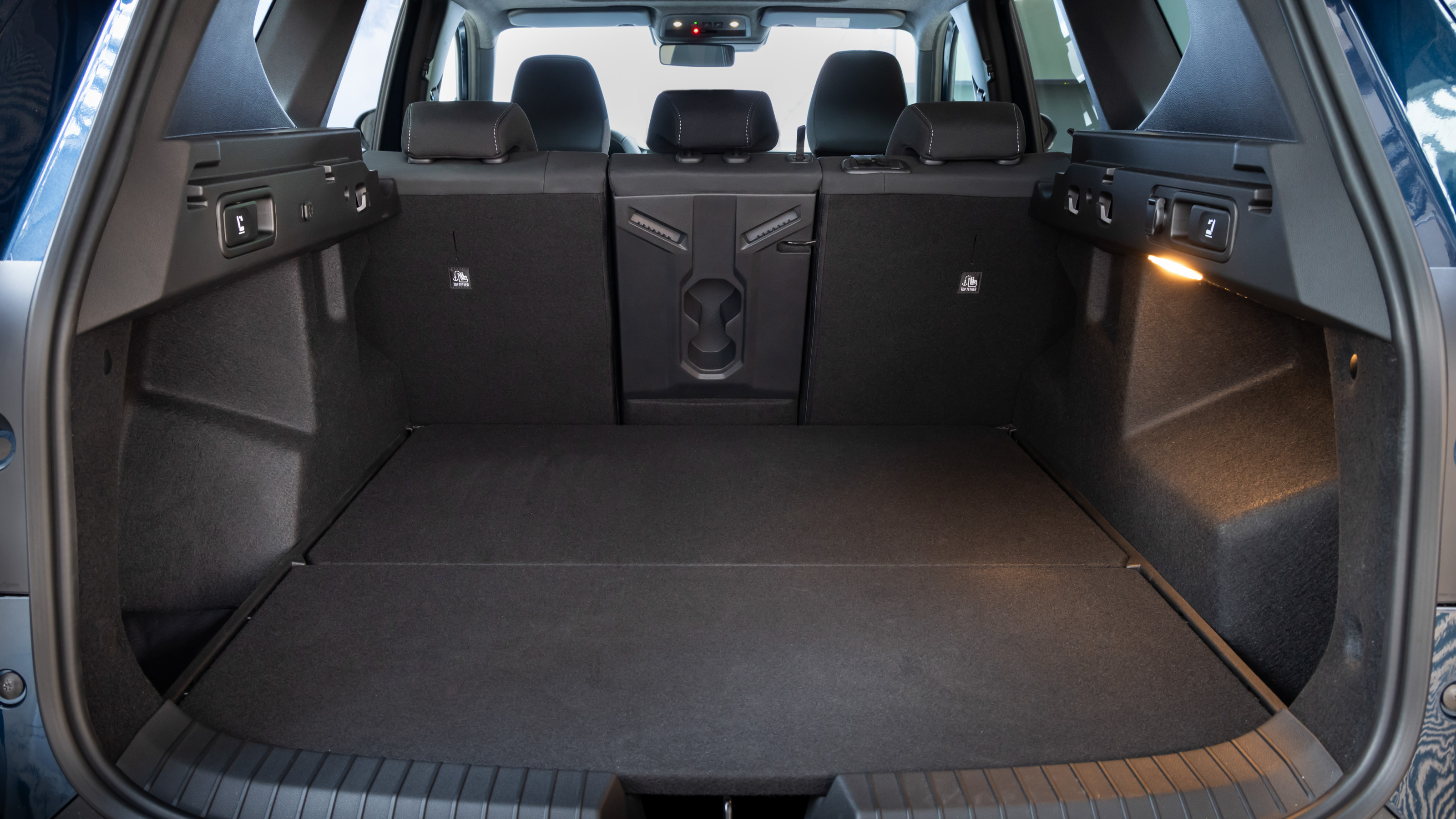 El acceso se realiza mediante un portón con accionamiento eléctrico, una novedad en Dacia, y el sistema permite abatir los respaldos traseros (en proporción 40/20/40) desde un mando situado en el propio maletero, dejando un piso completamente plano y permitiendo cargar objetos de hasta 2,7 metros de largo.