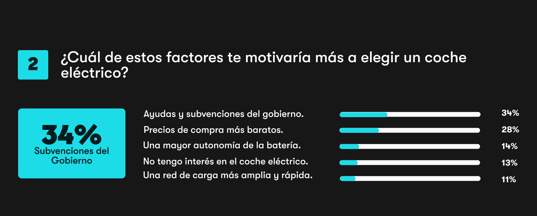 Alrededor del 33% de los conductores asegura que elegiría un coche eléctrico si hubiera ayudas del gobierno, mientras que un 69% afirma que los subsidios les harían más propensos a comprar uno. Esto demuestra que el apoyo económico sigue siendo un factor importante a la hora de valorar la decisión. Las subvenciones e incentivos ayudan a reducir el coste inicial, y eso hace que los coches eléctricos resulten más accesibles para quienes ya están pensando en pasarse a la movilidad eléctrica.