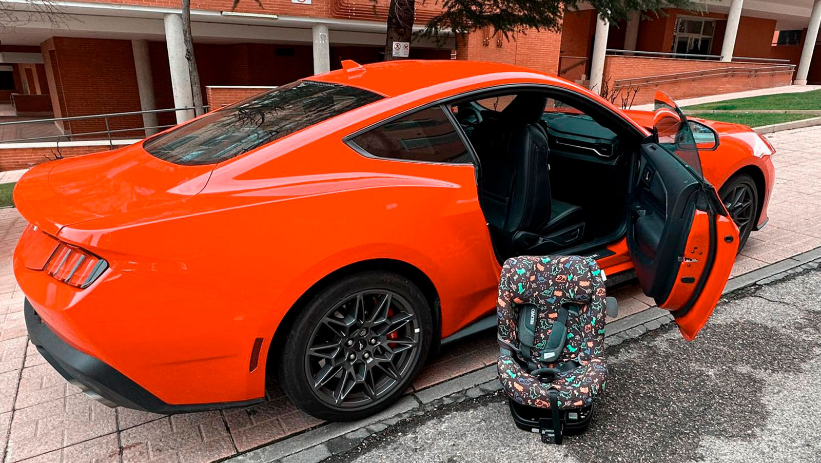 El Mustang cuenta con ISOFIX, así que instalar la sillita es posible, aunque no tan fácil como en un SUV como puede ser un Ford Kuga, -por compararlo con un coche del mismo fabricante- donde el acceso a las plazas traseras es mucho más cómodo. Aquí los asientos no abaten tanto hacia adelante, lo que complica un poco colocar o sacar al bebé. Sin embargo, una vez instalada, esos pequeños inconvenientes se olvidan en cuanto arrancamos el motor. El sonido del V8 compensa todo, haciendo que cada trayecto sea una experiencia única.
