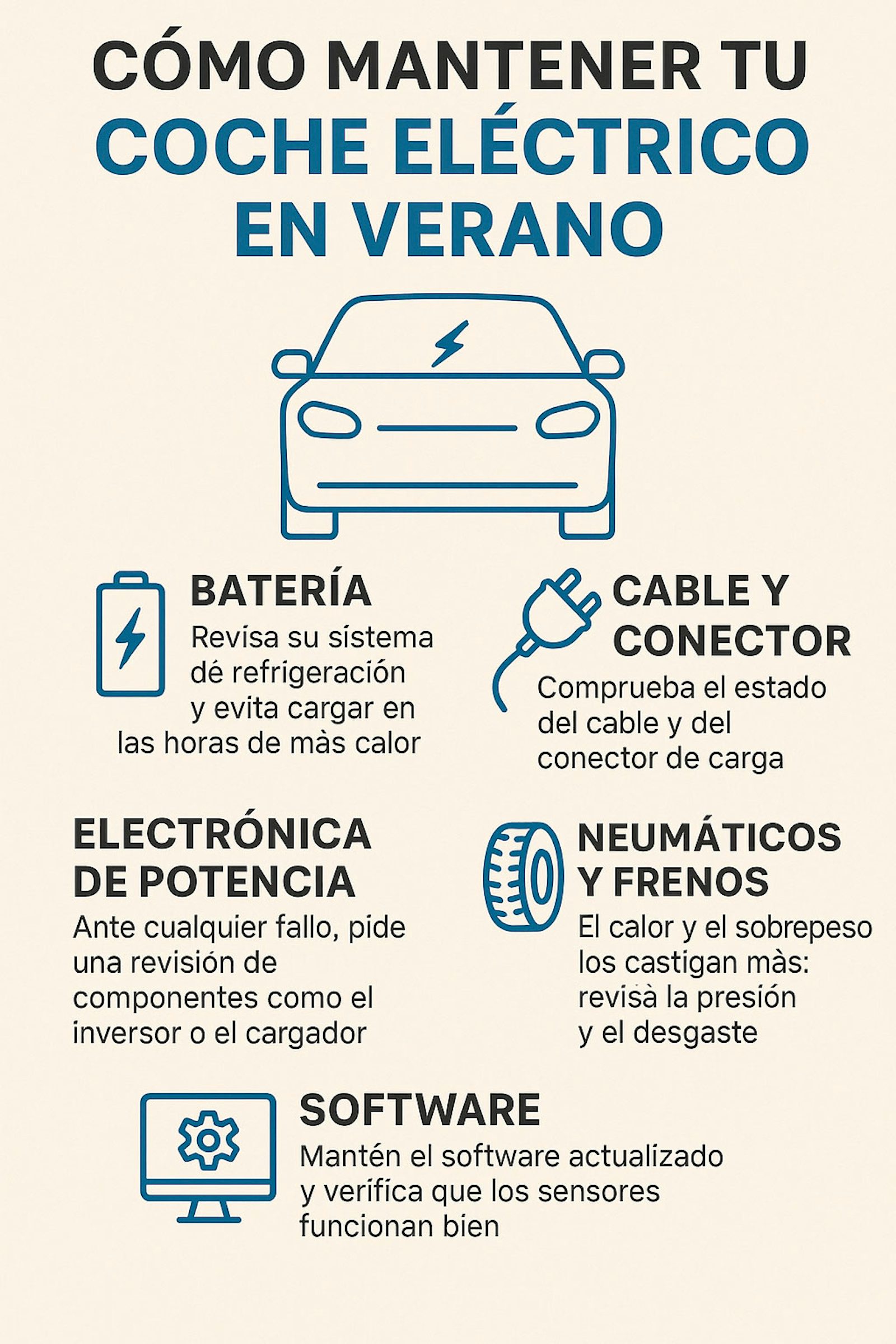 Componentes como el inversor o el cargador interno trabajan con altas temperaturas. El calor ambiental eleva aún más su temperatura de funcionamiento y podría provocar pérdidas de potencia, mensajes de error o problemas puntuales. Si detectas cualquier comportamiento extraño, conviene hacer una revisión preventiva.