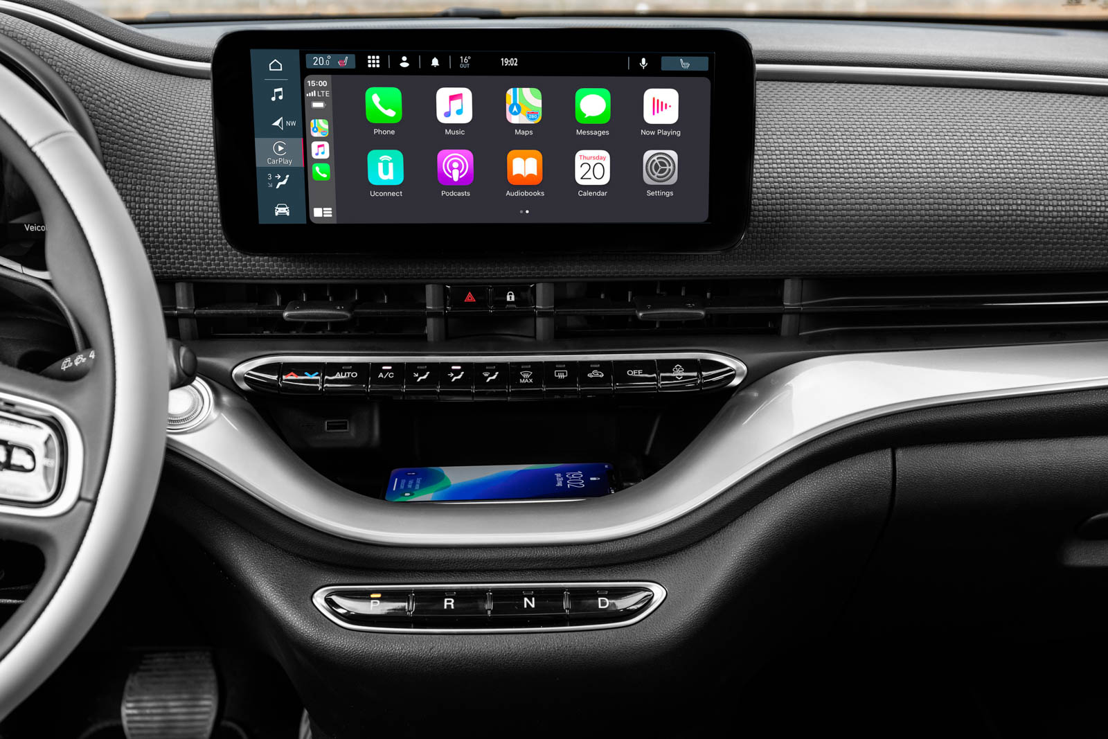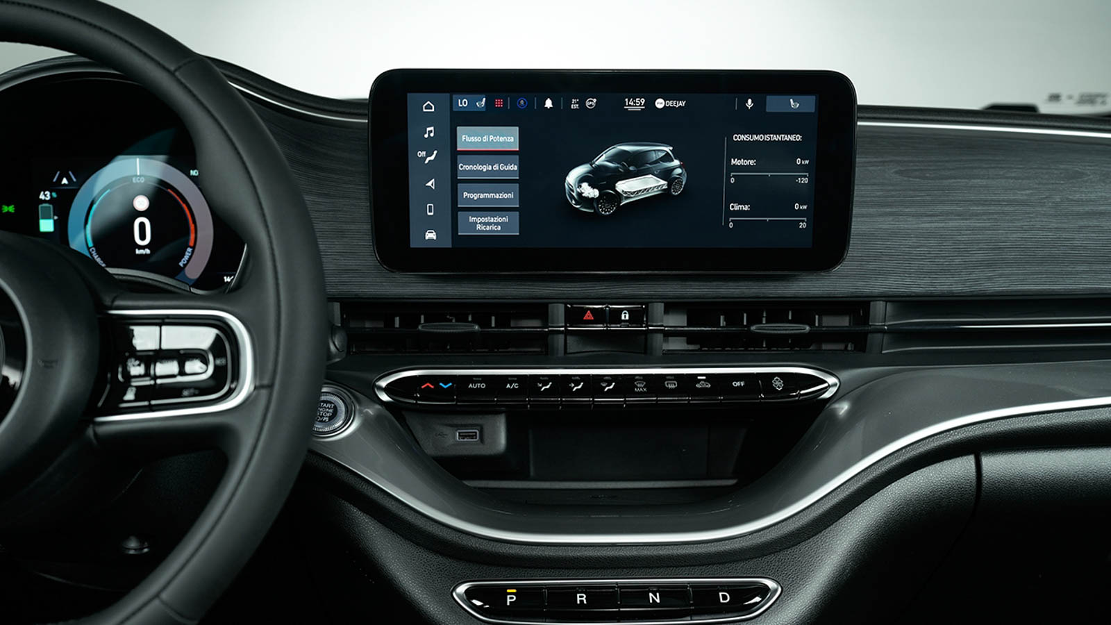 El Fiat 500e no tiene pantalla multimedia en el acabado básico Action, sino que usamos el móvil para operar el sistema de sonido. Si la pedimos en opción, por 1.000 €, puede montar pantalla de 7” con conectividad Apple CarPlay (por cable) y Android Auto. Los acabados Icon y La Prima ya tienen la pantalla de 10,25”. Todos montan de serie un cuadro de mandos totalmente digital con pantalla de 7”. Existe un puerto USB y un cargador inalámbrico para smartphones en la consola central. Los mandos para el climatizador son físicos, como también lo son los controles para el selector de marchas, operado mediante botones y no mediante una palanca tradicional.