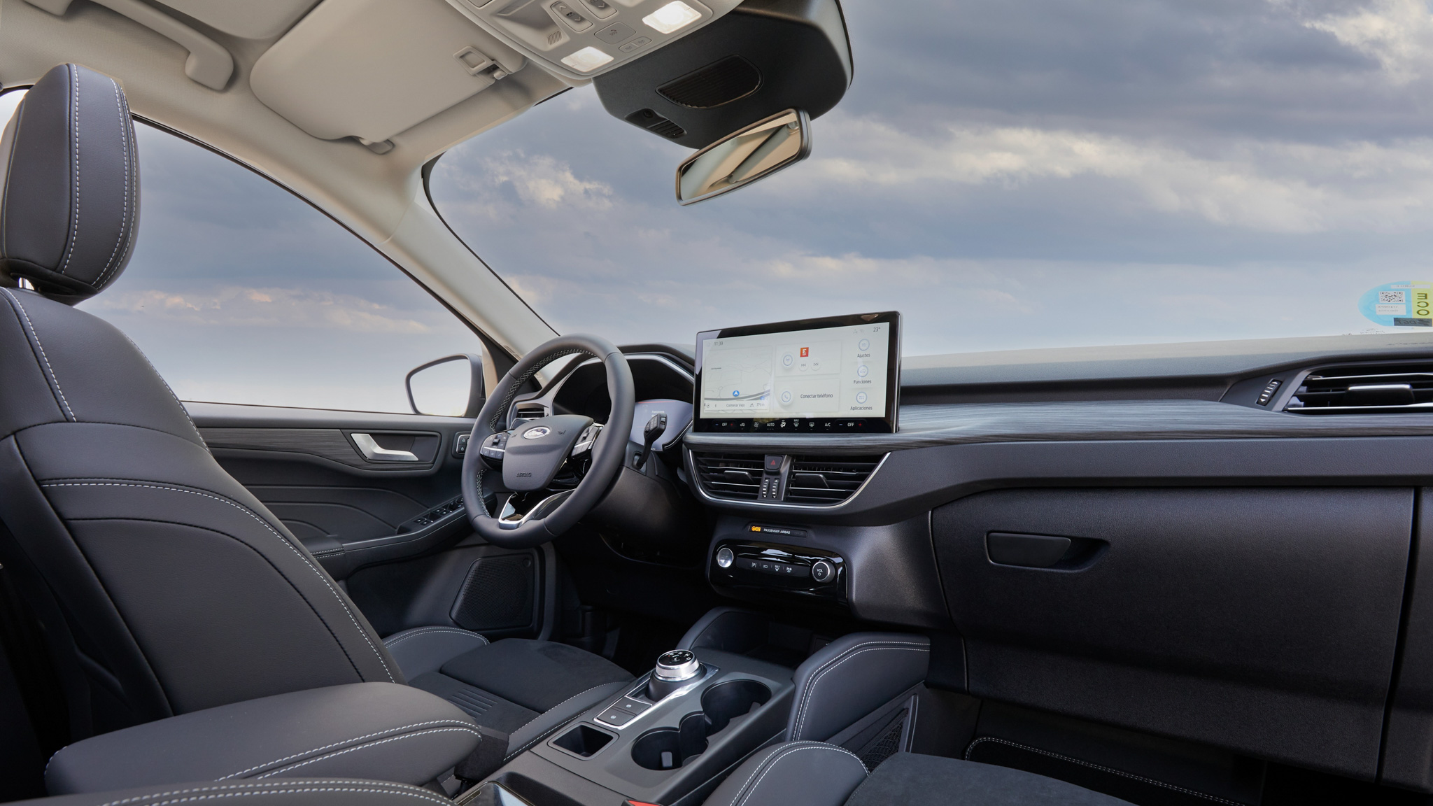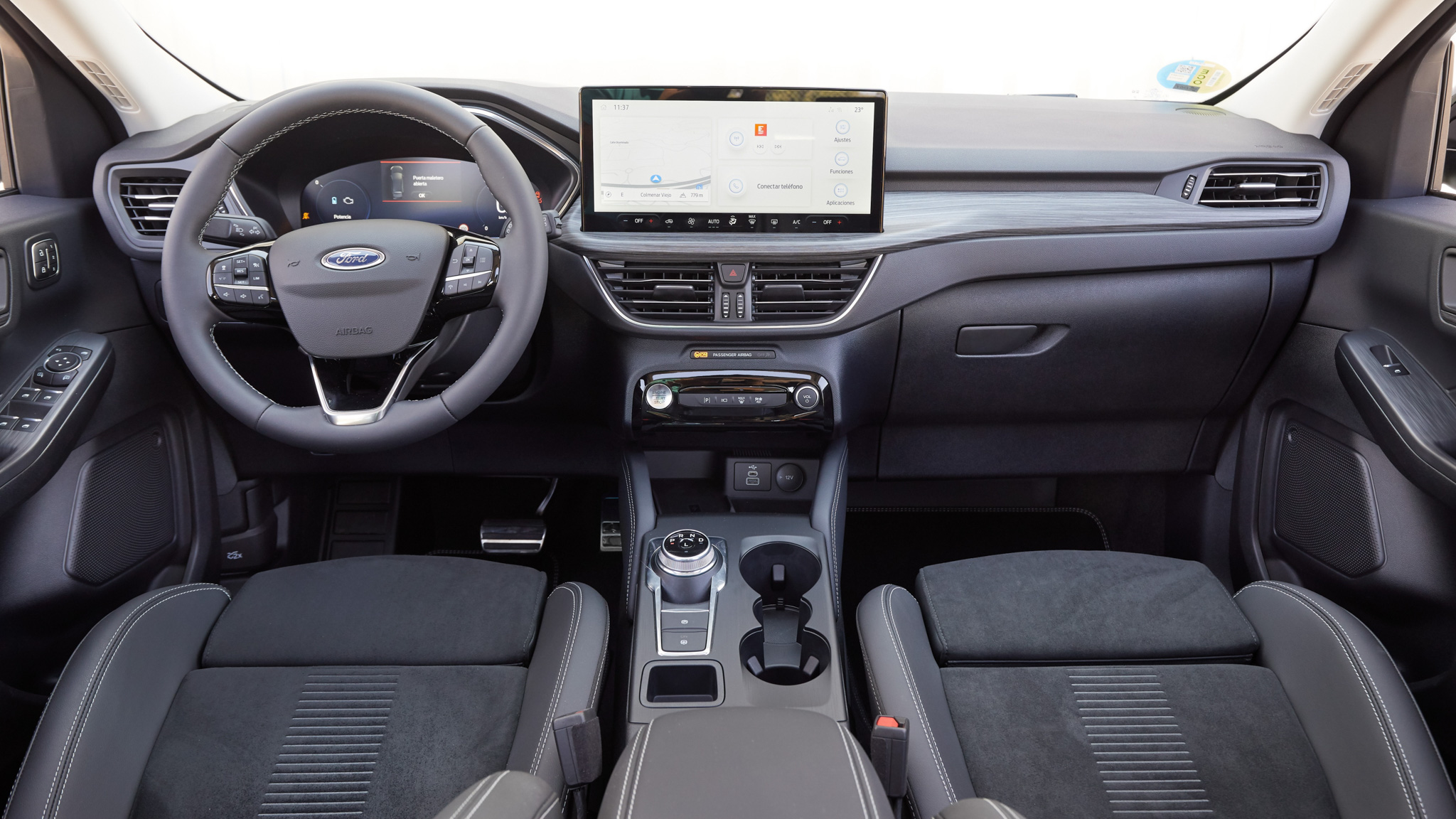 La configuración del salpicadero es moderna y limpia, dominada por una gran pantalla táctil central de 13,2 pulgadas y acompañada de un cuadro de instrumentos digital. Este diseño otorga al Kuga un aspecto tecnológico, aunque algunos materiales utilizados, como los plásticos duros en paneles de puertas y zonas bajas, desmerecen la percepción de calidad en comparación con rivales como el Hyundai Tucson o el KIA Sportage, que ofrecen interiores más refinados. En los acabados superiores, como el ST-Line X, se añaden detalles como costuras en contraste para dar un toque más exclusivo.