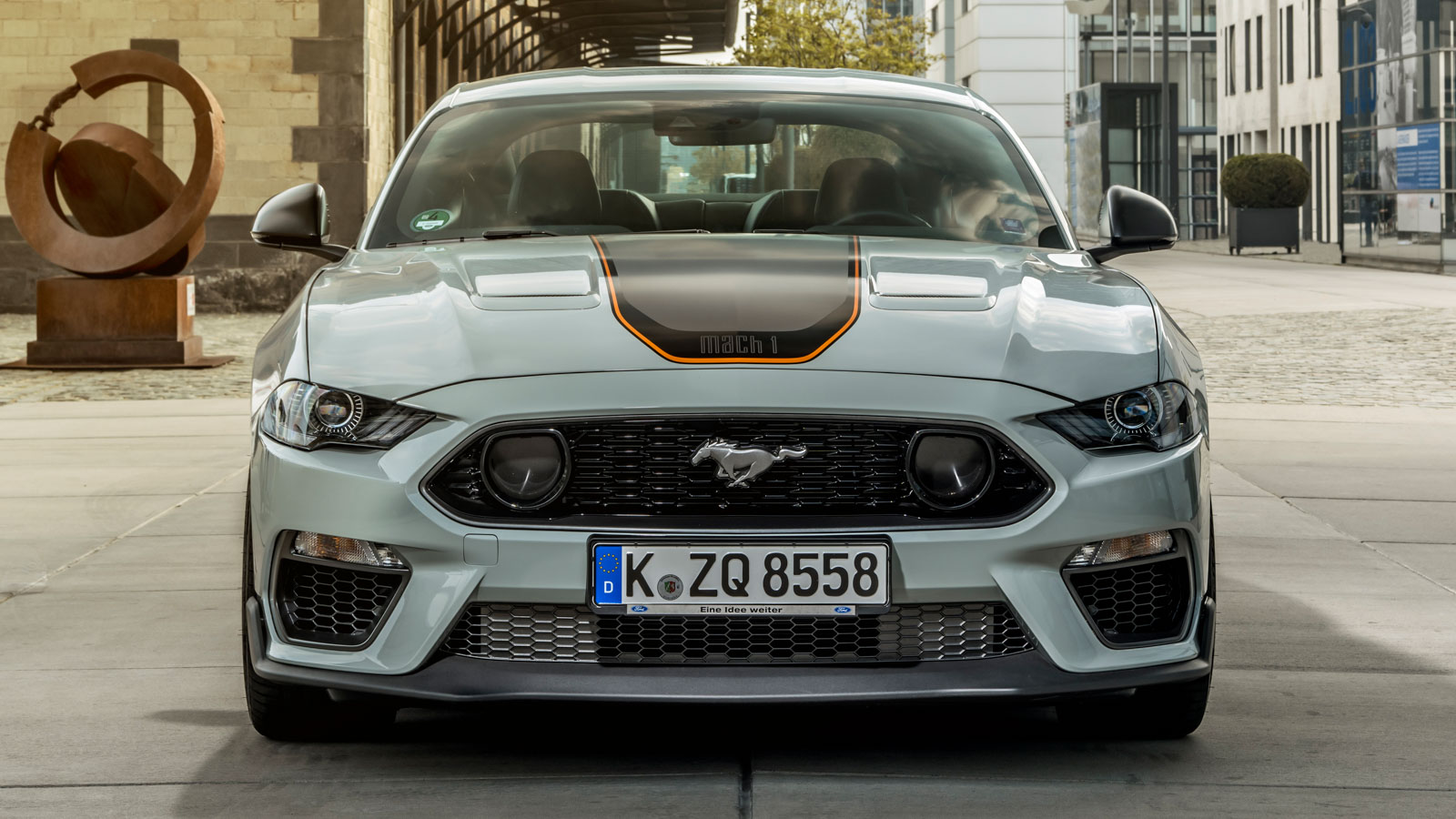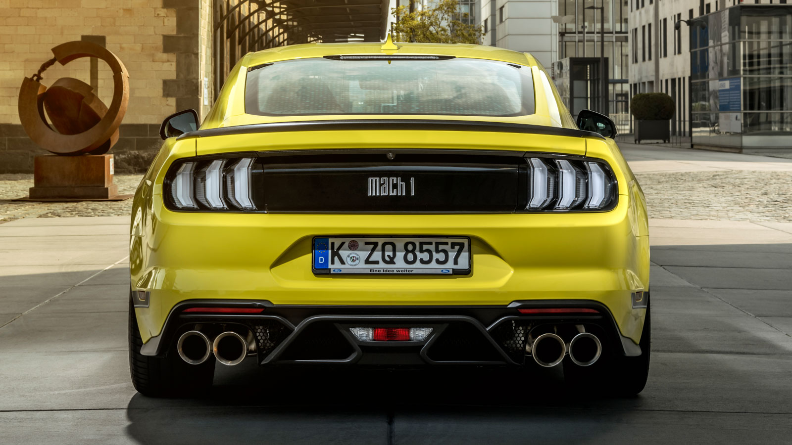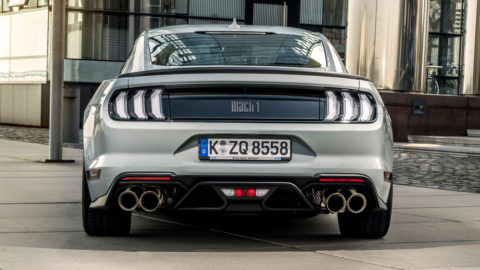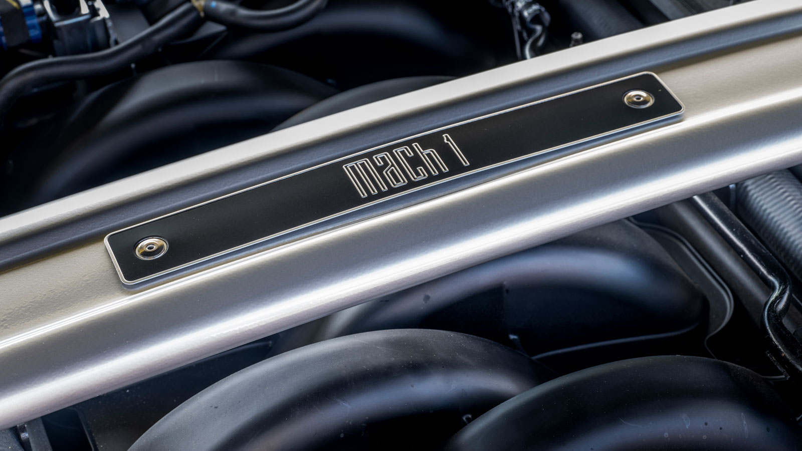 En la versión Mach 1, la caja de cambios manual cuenta con unos desarrollos claramente más cerrados en las cinco primeras marchas y una palanca de cambios de recorrido más corto y, en el caso de la automática, recibe una calibración distinta. También se añade un radiador de aceite para ambas transmisiones (la caja automática además cuenta con un segundo radiador aire-aceite) y otro para el diferencial, de manera que lo hace más capaz para una conducción en circuito evitando posibles sobrecalentamientos. En cualquier caso, es de propulsión trasera e incorpora de serie un diferencial autoblocante.