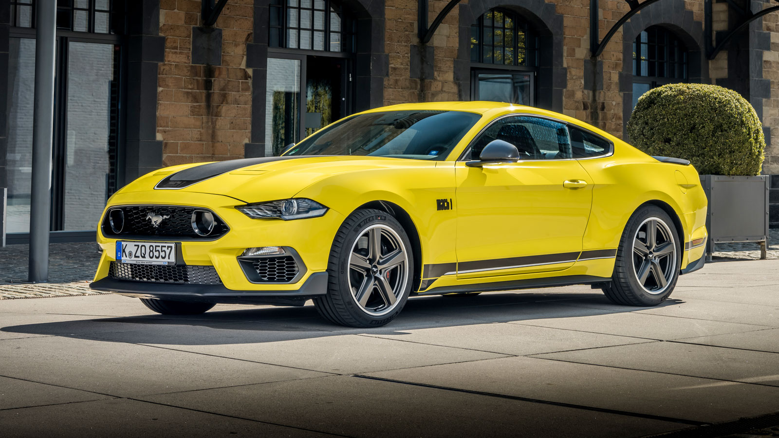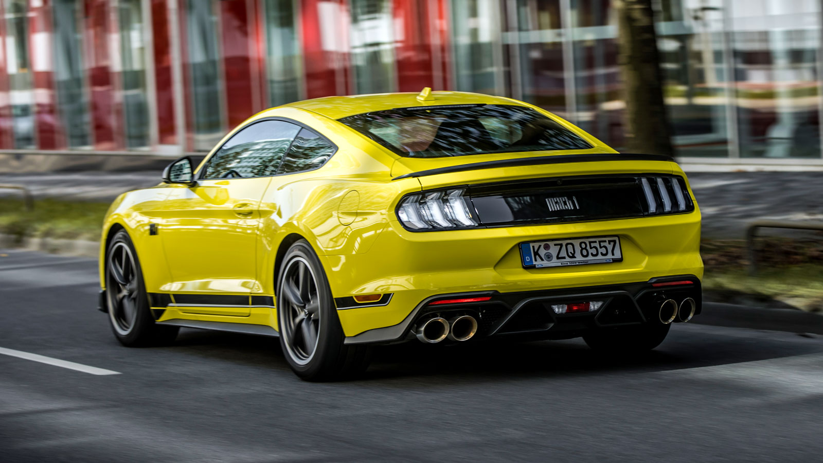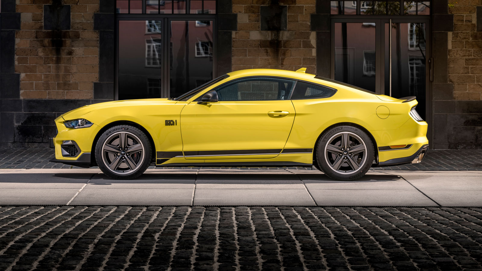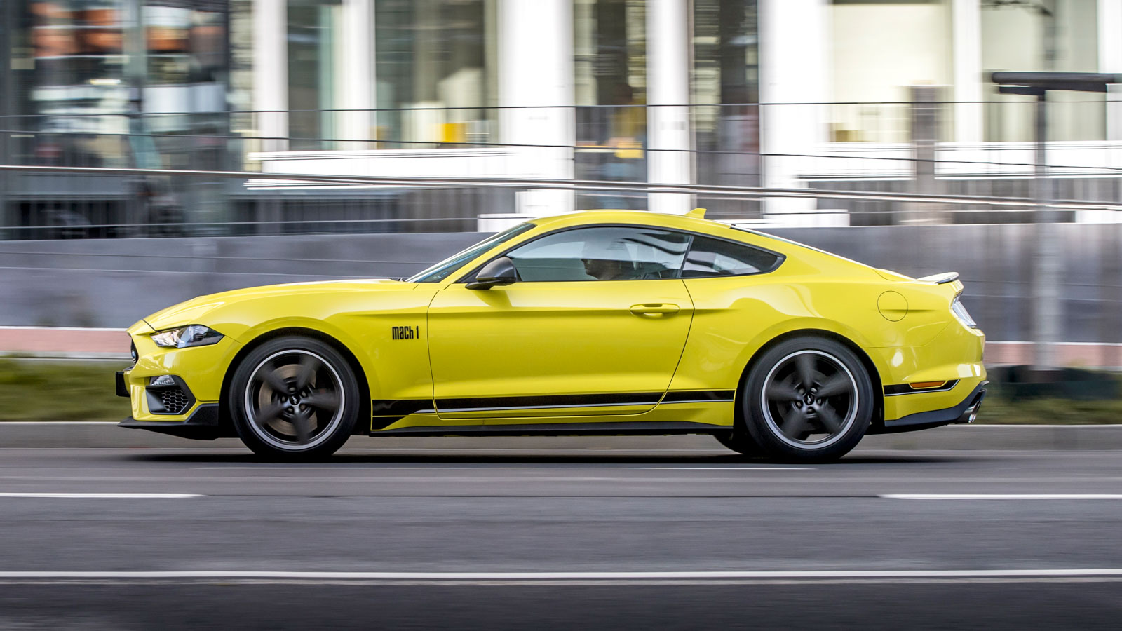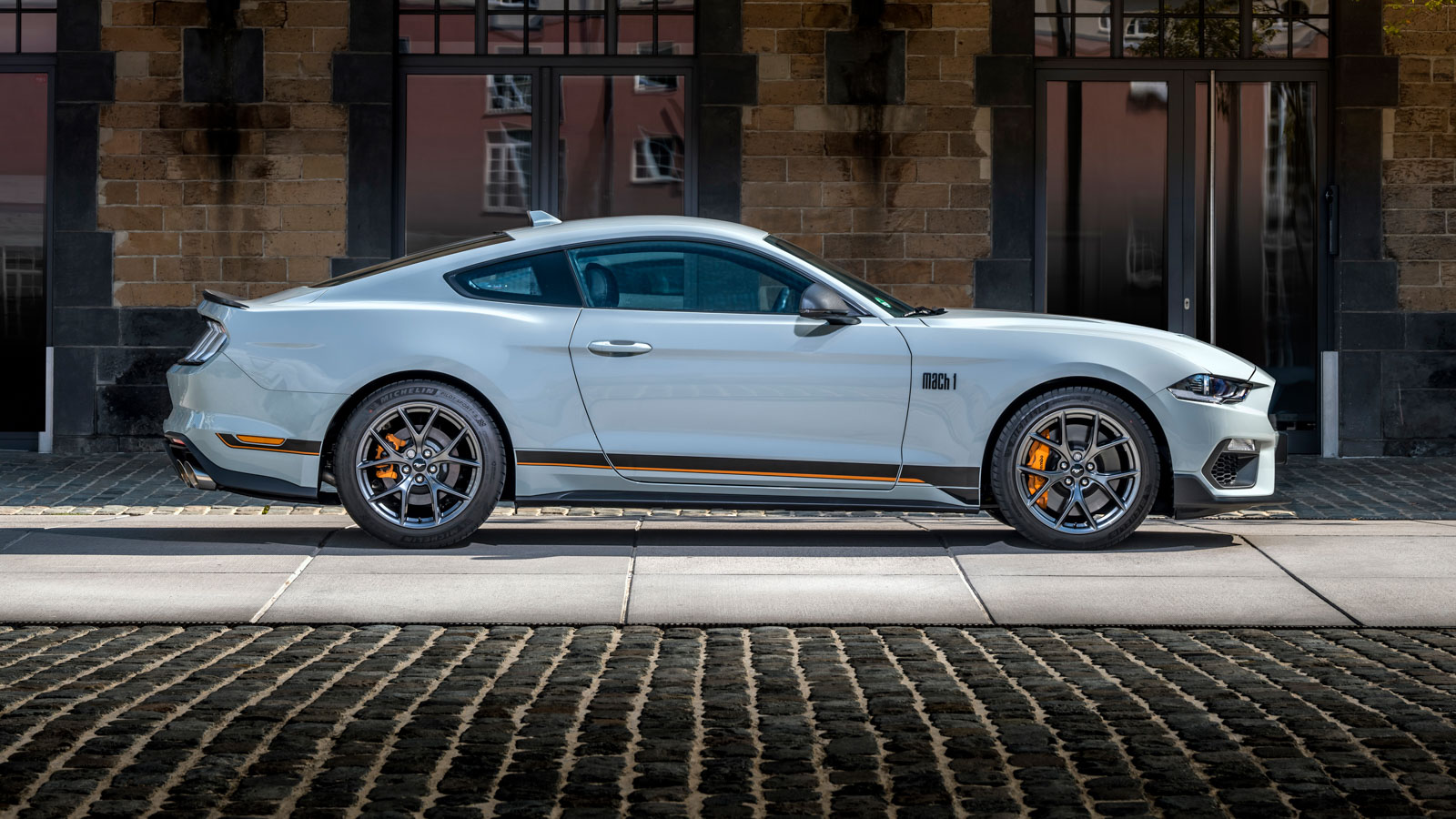 En la versión Mach 1, la caja de cambios manual cuenta con unos desarrollos claramente más cerrados en las cinco primeras marchas y una palanca de cambios de recorrido más corto y, en el caso de la automática, recibe una calibración distinta. También se añade un radiador de aceite para ambas transmisiones (la caja automática además cuenta con un segundo radiador aire-aceite) y otro para el diferencial, de manera que lo hace más capaz para una conducción en circuito evitando posibles sobrecalentamientos. En cualquier caso, es de propulsión trasera e incorpora de serie un diferencial autoblocante.