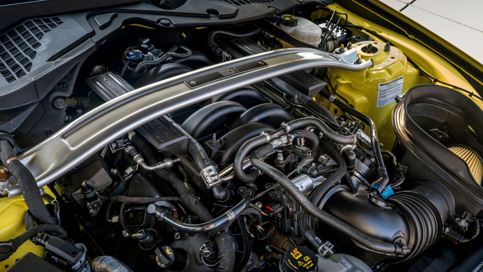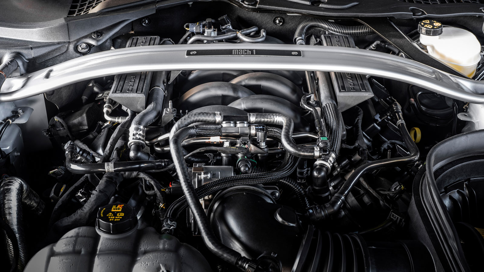 El único motor disponible es el elemento protagonista y distintivo del Ford Mustang, un bloque de 8 cilindros en V de 5.0 litros, con un sistema de inyección dual y que desarrolla 450 CV de potencia y 529 Nm de par en la versión GT, y 460 CV en la versión Mach 1, que consigue elevar la potencia por un aumento del régimen de revoluciones del motor y una admisión mejorada, de forma que mantiene la cifra de par inalterada, un método de potenciación típico de los motores de carreras.