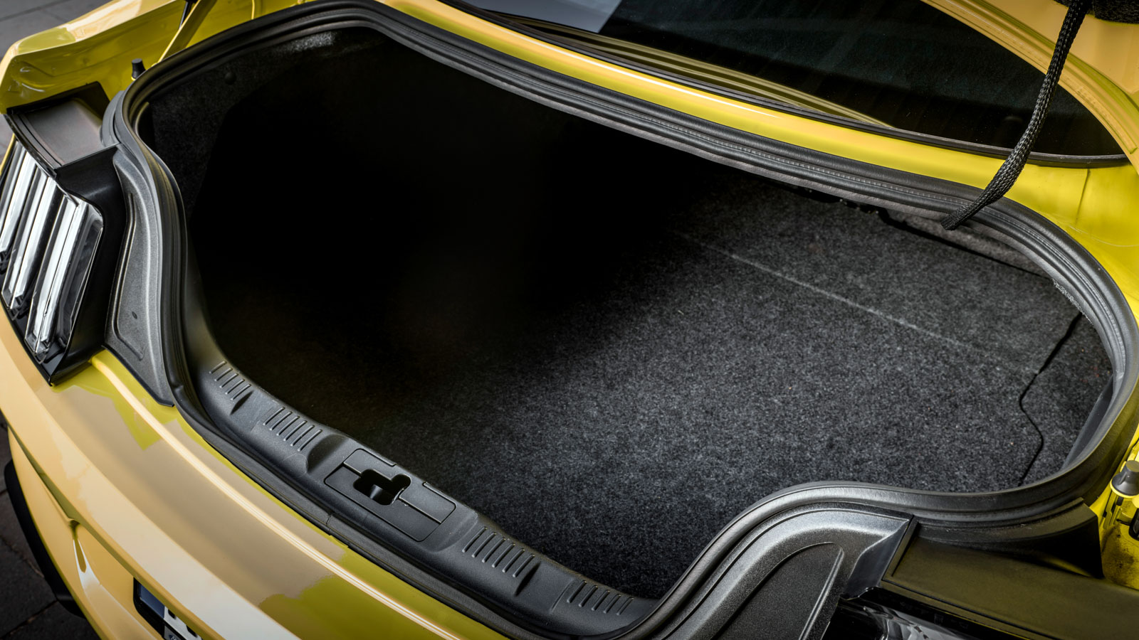 La capacidad de maletero del Ford Mustang es correcta para su tamaño en el caso de la versión coupé, aunque es algo más escasa si es descapotable en comparación a sus rivales. El volumen disponible de maletero del Ford Mustang es de 408 litros (332 para la versión descapotable), 32 menos que un BMW Serie 4 Coupé (53 menos si lo comparamos con el cabrio), pero bastante más espacioso que otro rival deportivo más puro, como el Porsche 718 Cayman (312 l).