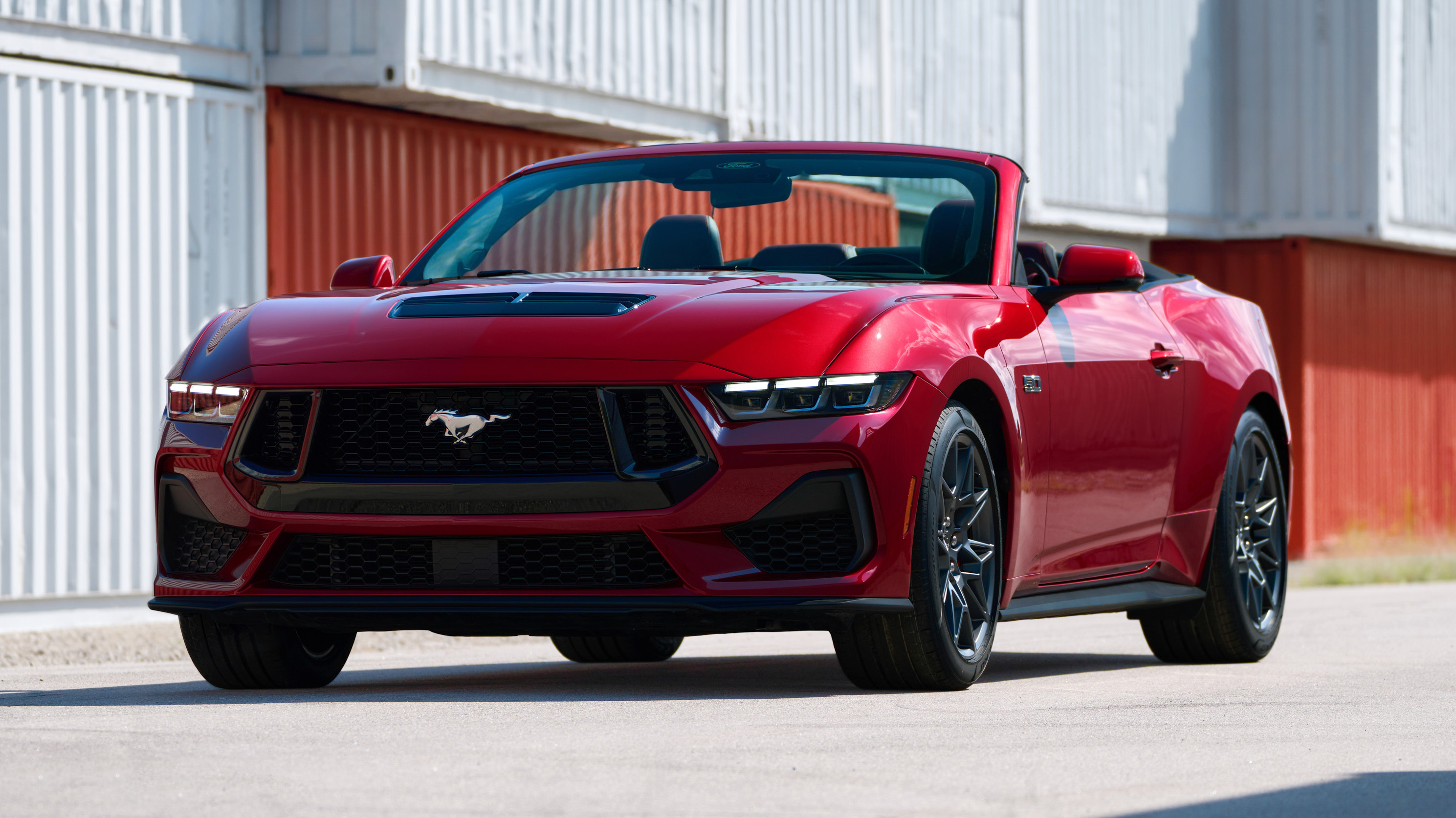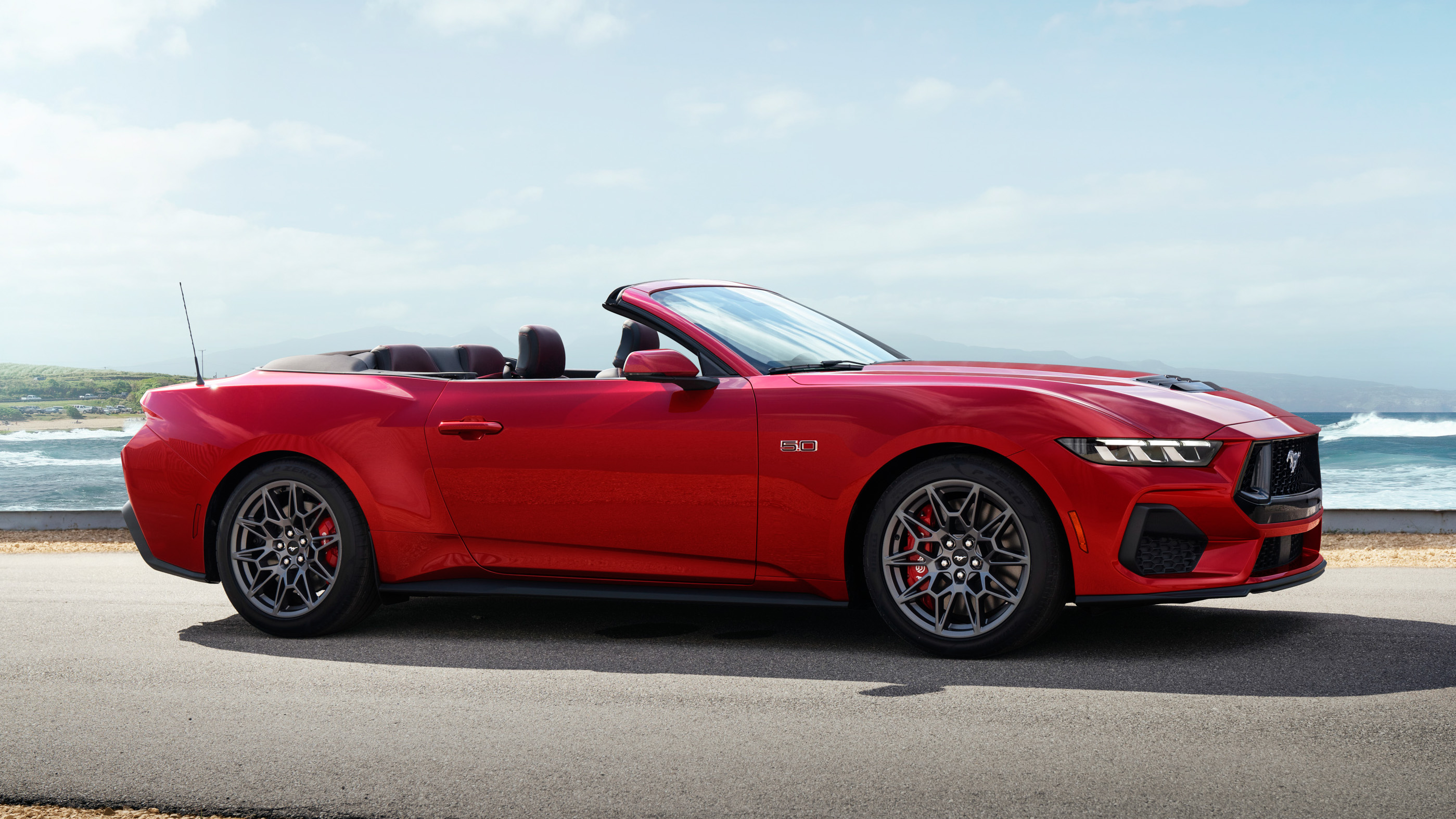 El Mustang descapotable tiene un techo de lona de accionamiento semi automático y está disponible con un motor V8 de 5,0 litros y un EcoBoost de 2,3 litros y cuatro cilindros.