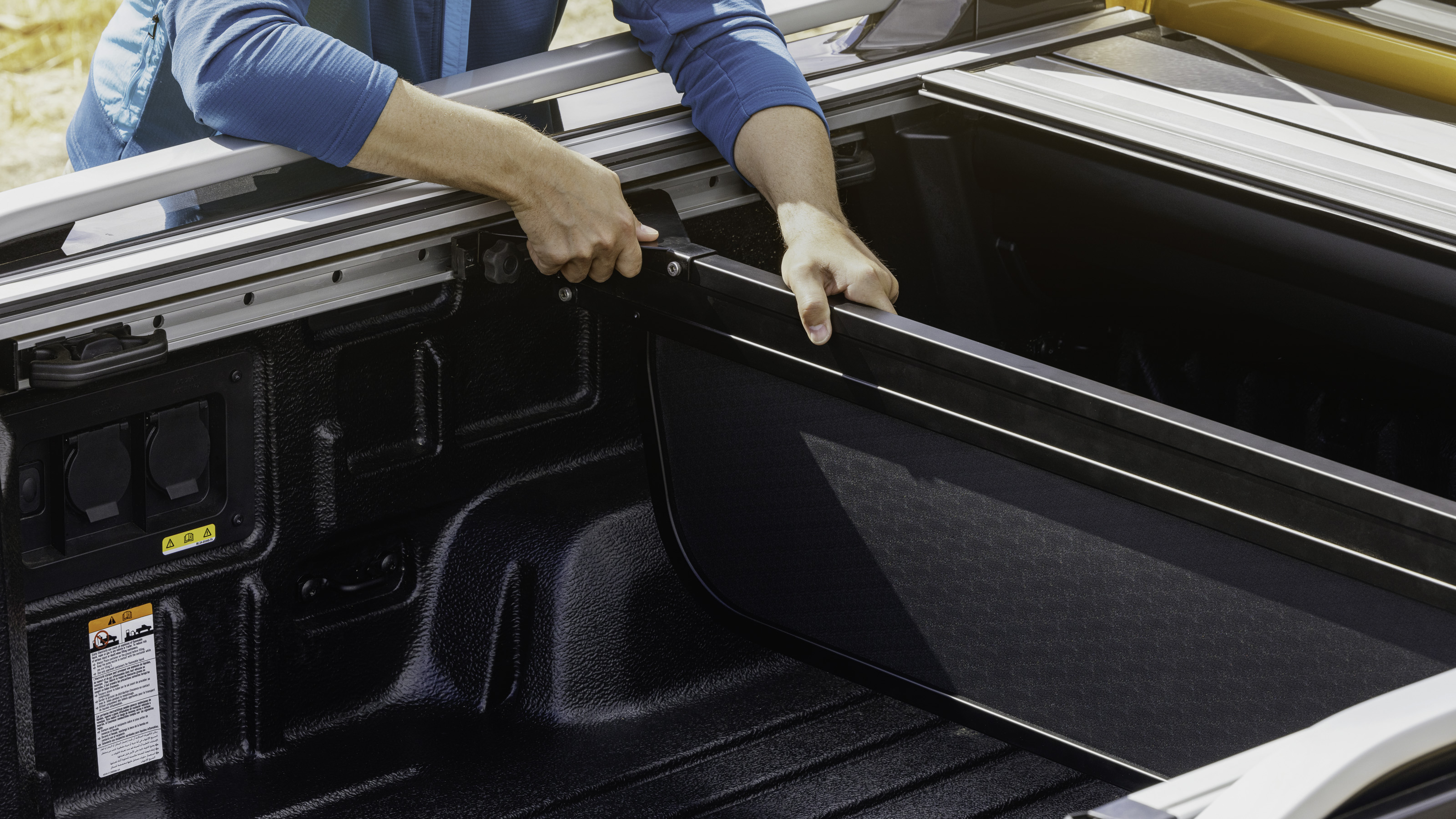 Como ya vimos en el último F 150, la cara interior de la portezuela se ha diseñado para usarse como mesa de trabajo, con una regla incorporada. Como opción, se puede instalar una cortinilla metálica eléctrica para tapar el contenido de la caja.