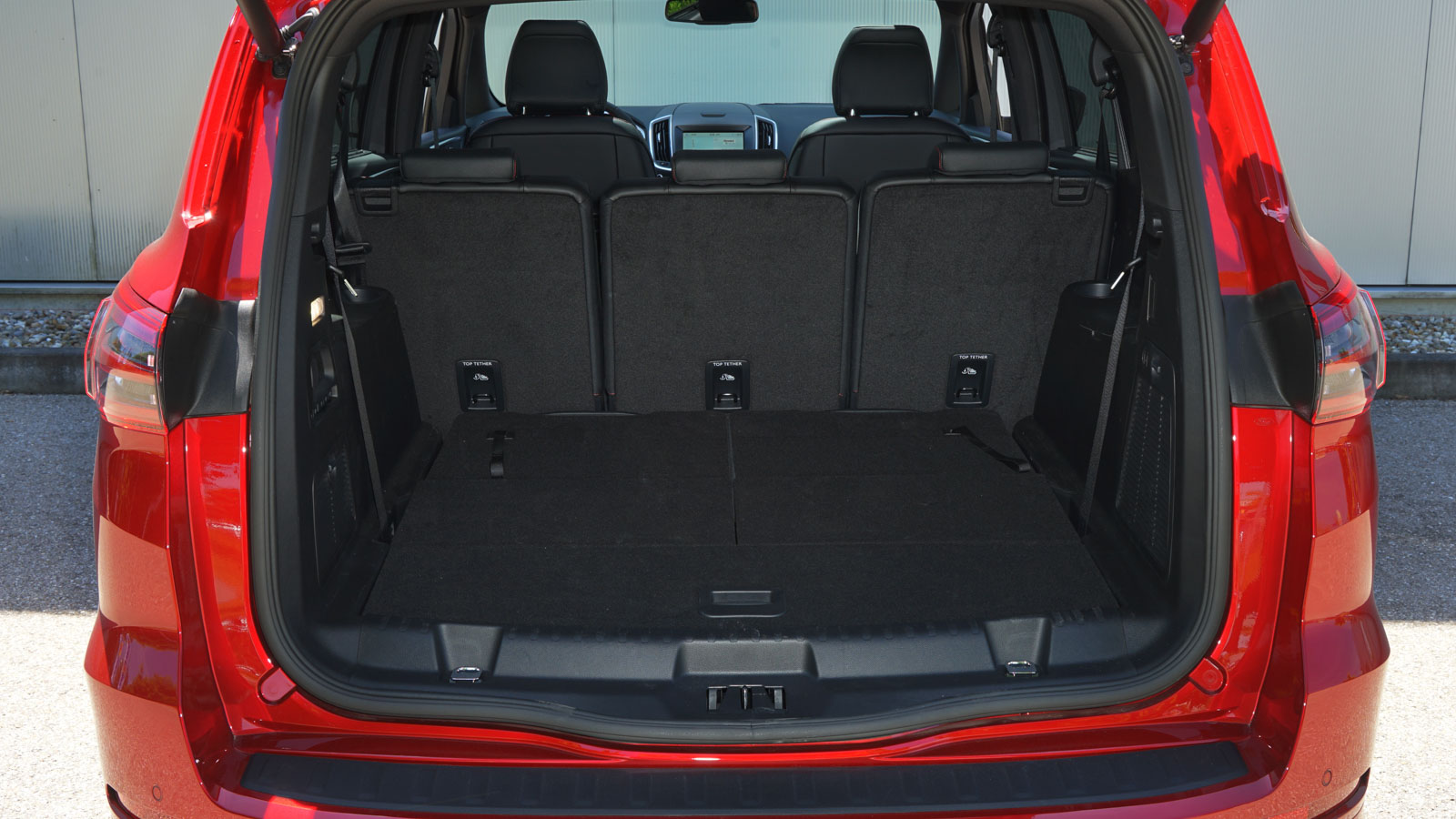 El maletero del Ford S-Max Híbrido no sacrifica espacio para ubicar la batería, ya que está instalada debajo del suelo. Tiene un volumen de 185 litros con las tres filas de asientos disponibles, de 630 litros con dos y un máximo de 2.020 litros sólo con la primera fila. Es de los más espaciosos de su segmento, donde tenemos alternativas como el Renault Grand Scénic (533 l) o el CitroËn C4 SpaceTourer (645 l), pero no es una cifra destacable si tenemos en cuenta su longitud de carrocería.