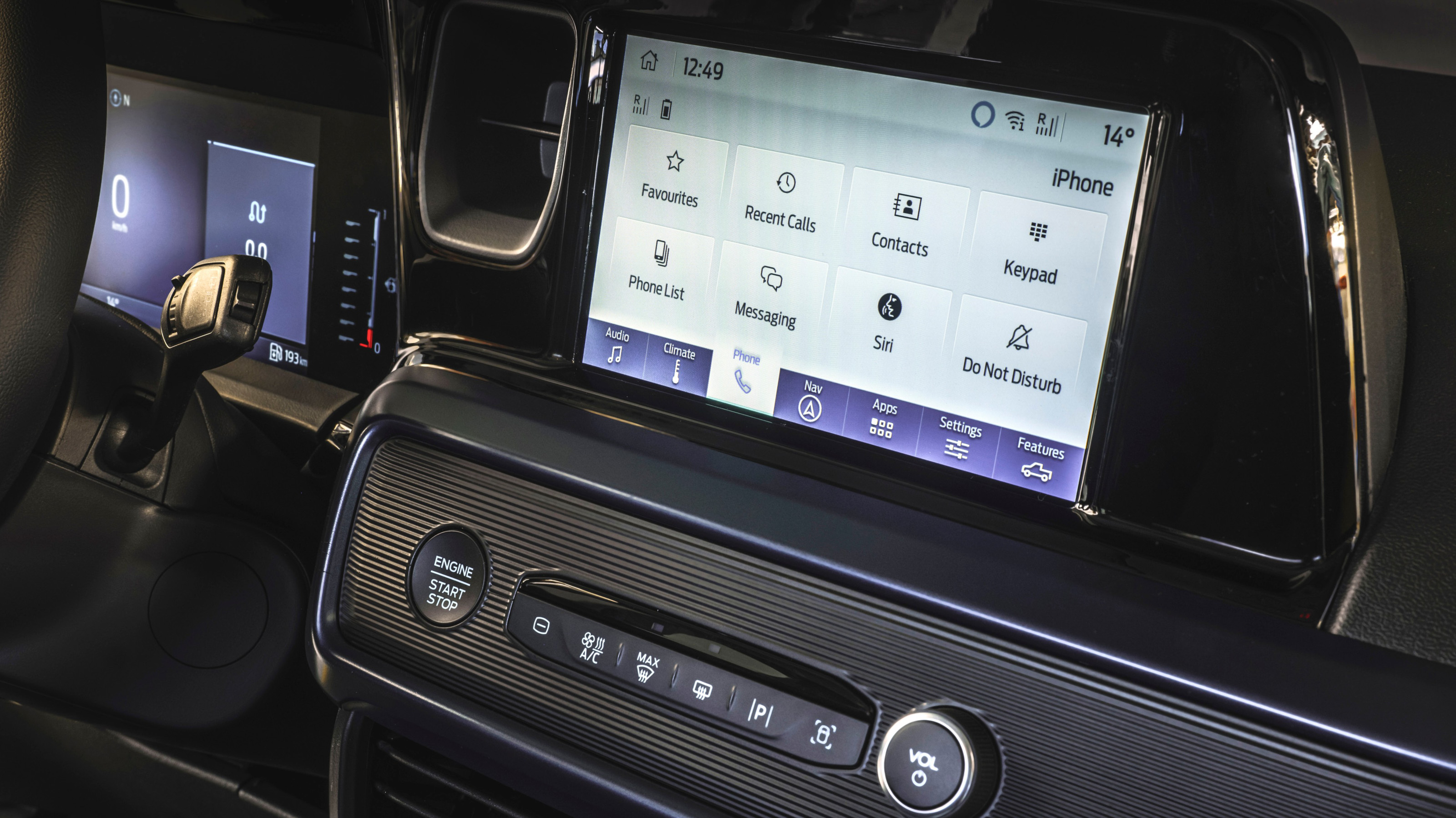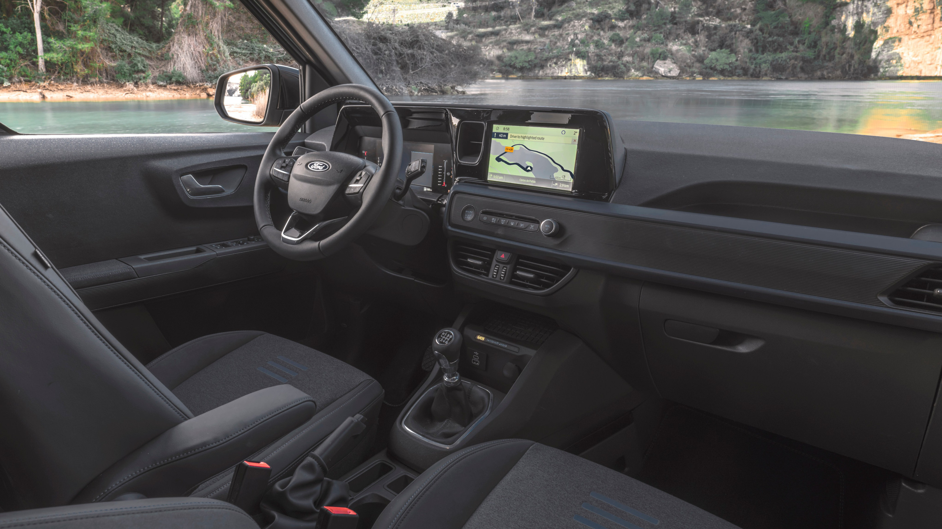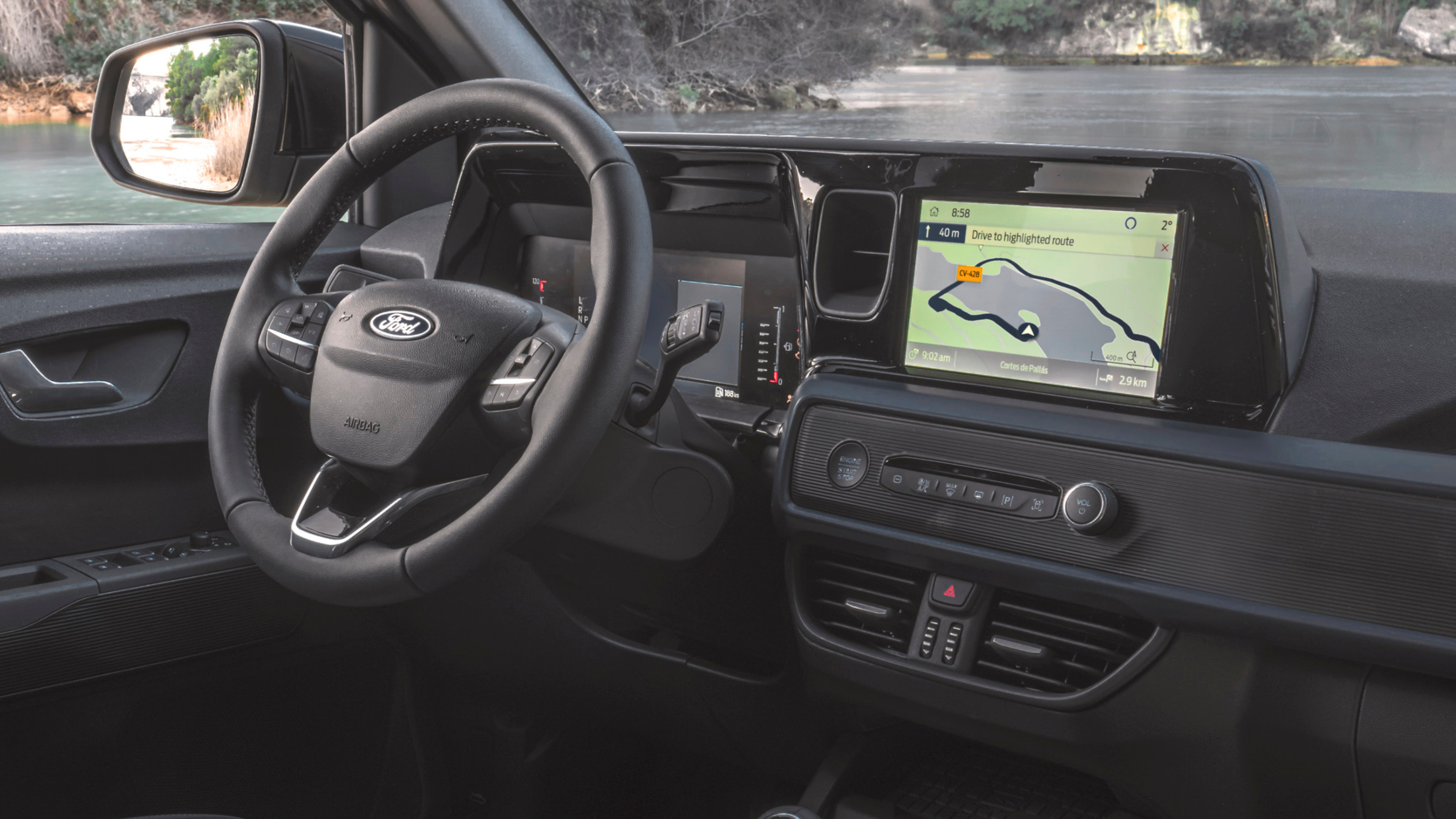Ford ha pasado a incluir los mandos de la climatización en la pantalla central, algo que no nos gusta tanto porque distrae más de la cuenta durante la conducción; solo queda una pequeña hilera de botones físicos para las funciones básicas. La instrumentación está compuesta por pantalla, además de dos barras indicadoras en los laterales, para la temperatura del motor y el nivel de combustible.