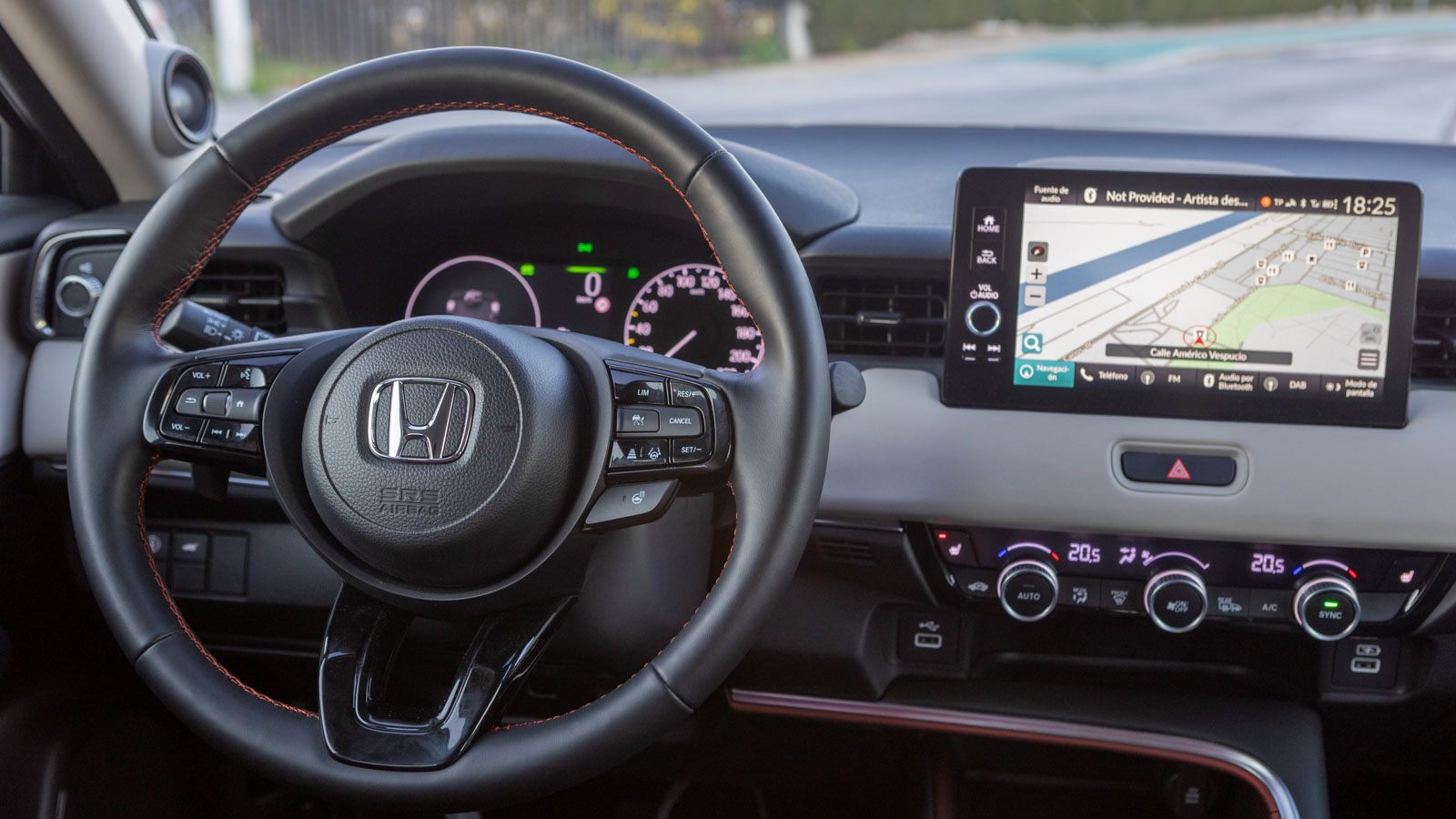 El sistema multimedia del Honda HR-V se controla mediante una pantalla táctil de 9 pulgadas −tiene botones físicos a su izquierda para facilitar el acceso a algunas funciones− , que incluye el sistema de navegación, una función de órdenes por voz que entiende un lenguaje más natural, una red Wifi que soporta la conexión de varios dispositivos y la integración inalámbrica de smartphone a través de Apple CarPlay, o por cable si es Android Auto. Una característica que lo hace más cómodo de manejar es que la forma del salpicadero permite reposar la mano mientras usamos la pantalla táctil. Además, la climatización se gestiona mediante controles físicos, lo cual evita distracciones al volante.