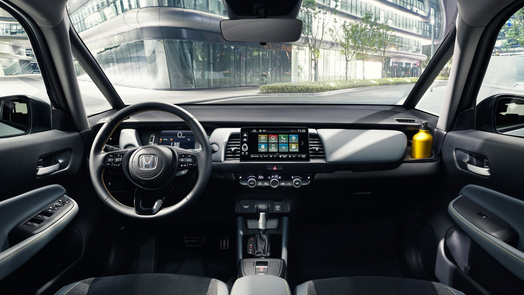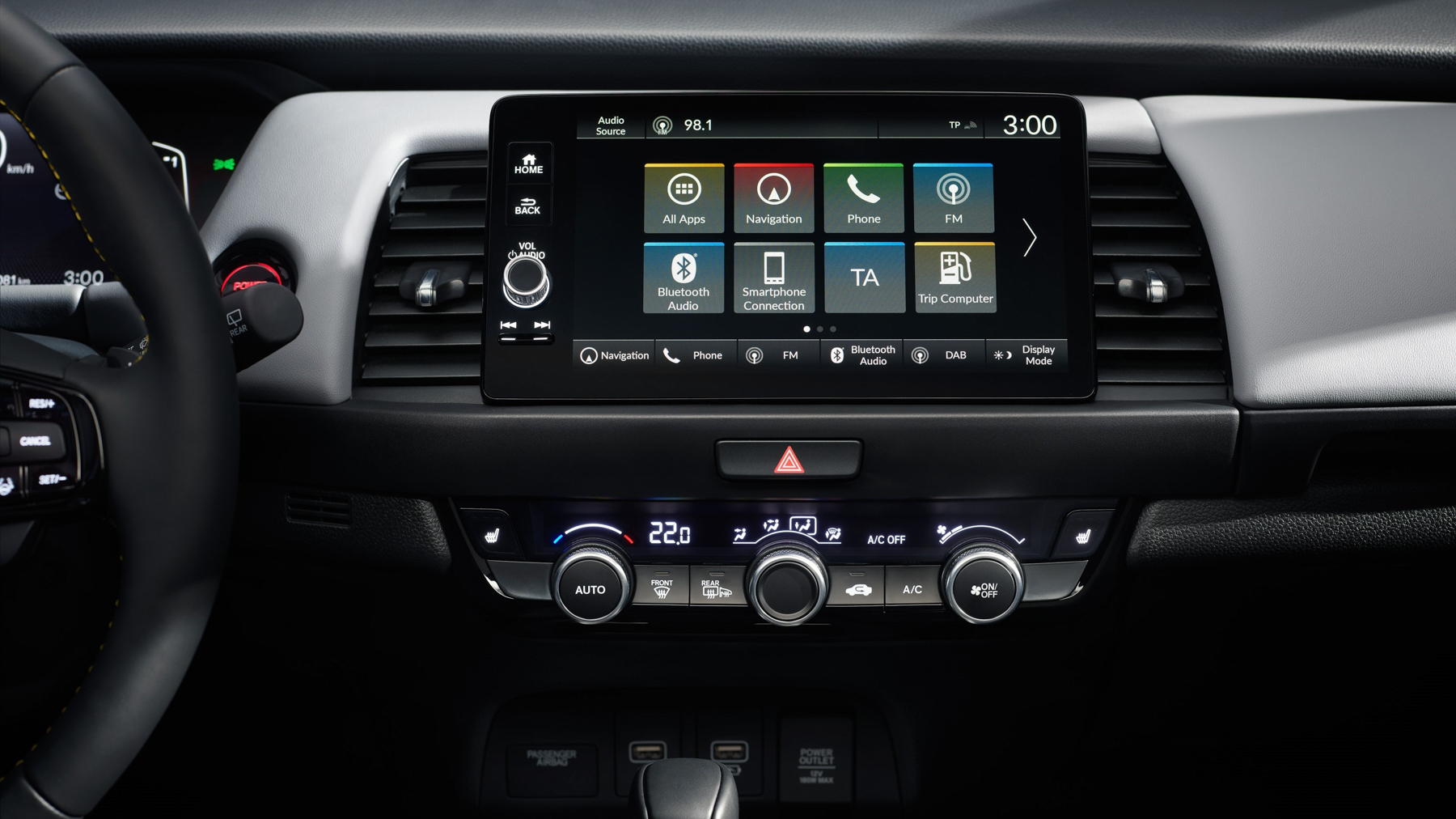 El sistema multimedia del Jazz está conectado a internet y va asociado a una pantalla táctil de 9 pulgadas, tiene un navegador incluido de la marca Garmin y es compatible con Android Auto y Apple CarPlay. La instrumentación también es por pantalla, con dos indicadores a ambos lados para el nivel de combustible y de carga de la batería.