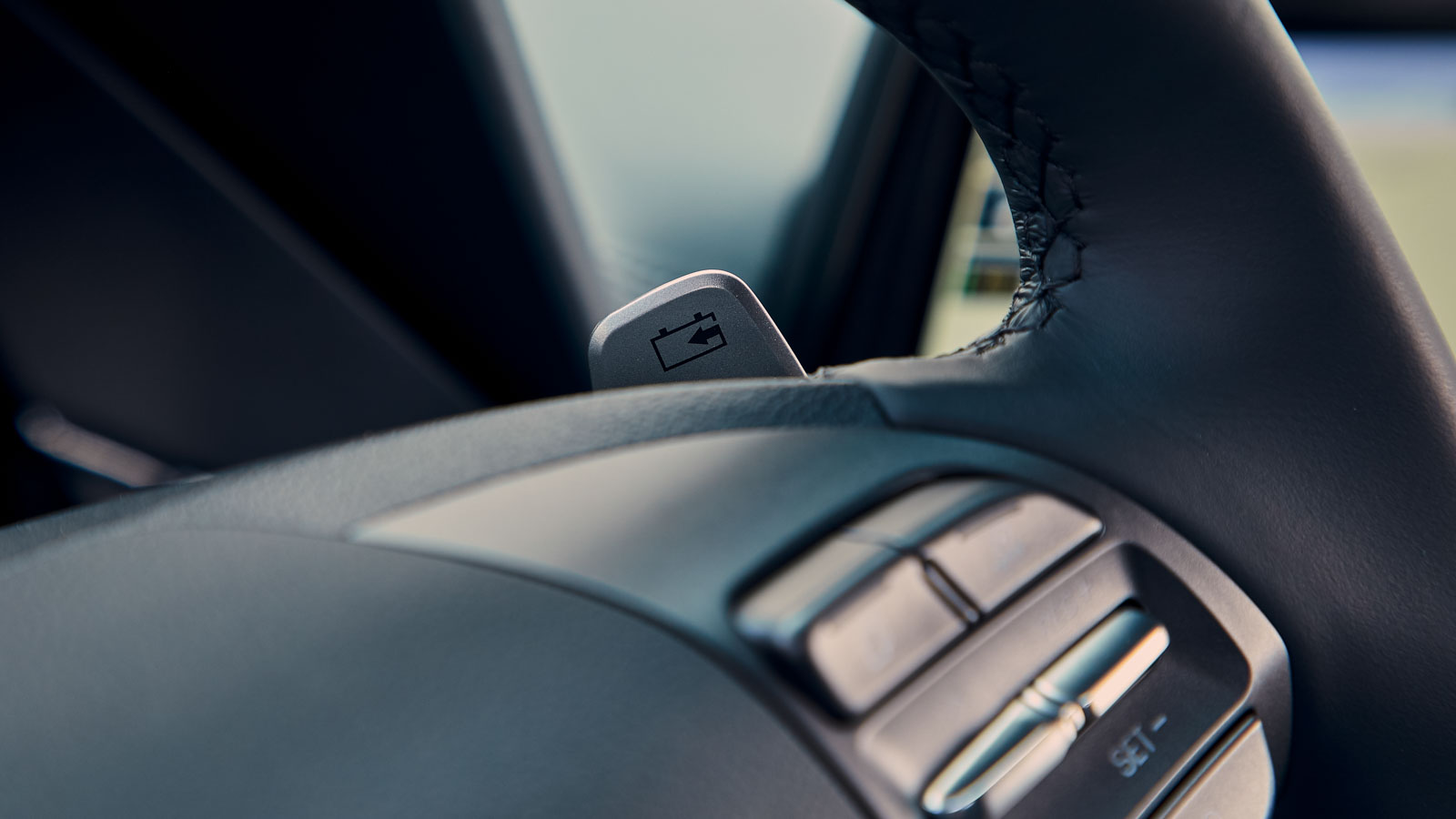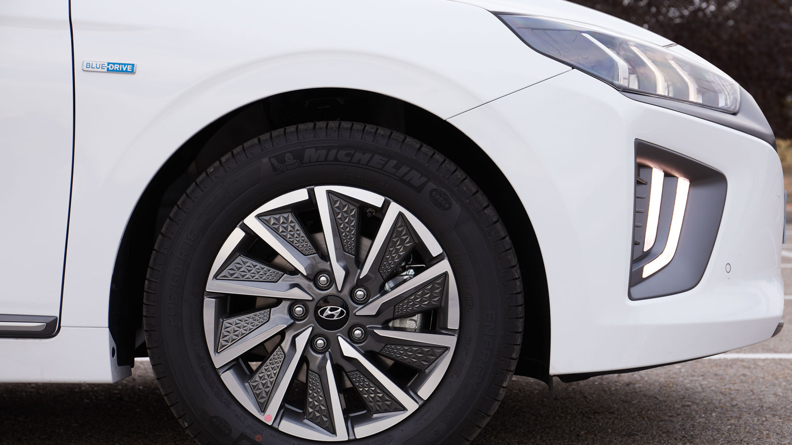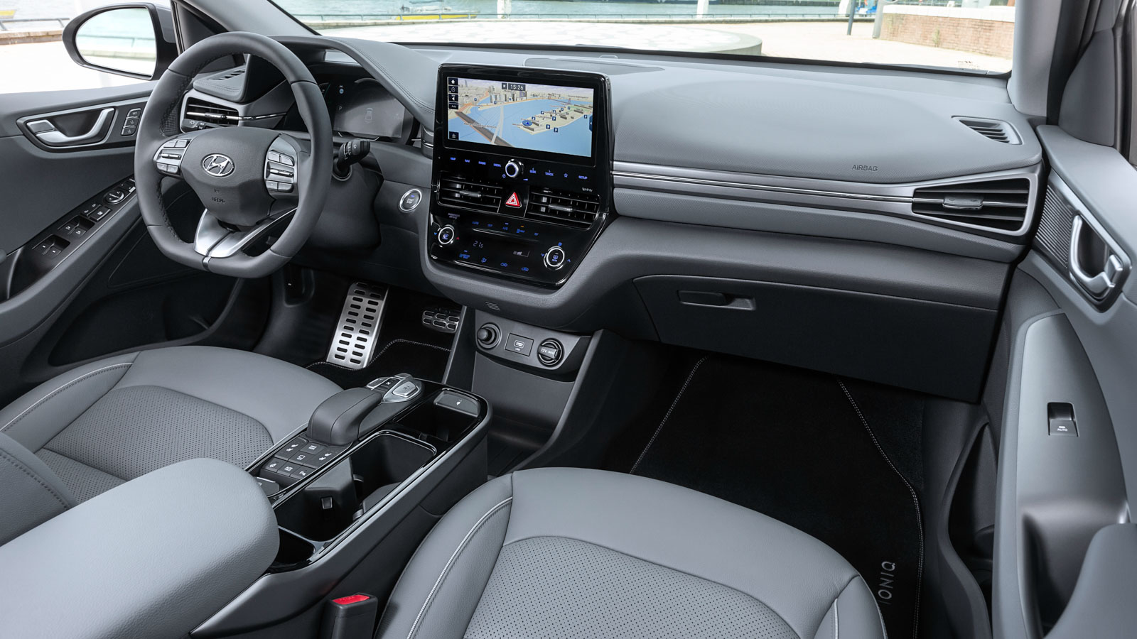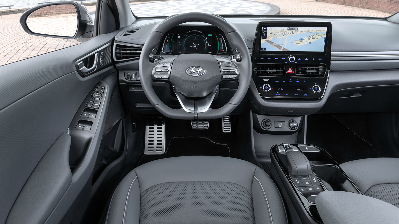 El Hyundai Ioniq eléctrico desarrolla una potencia máxima de 136 CV y 295 Nm de par y está alimentado por una batería de 38,3 kWh. Se puede controlar la intensidad de la frenada regenerativa sujetando la leva izquierda del cambio hasta detenerlo por completo, es decir, permite conducir el coche sin utilizar el pedal del freno. Además,la función de la frenada regenerativa inteligente ajusta de manera automática según las condiciones del tráficoo el desnivel de la carretera.
