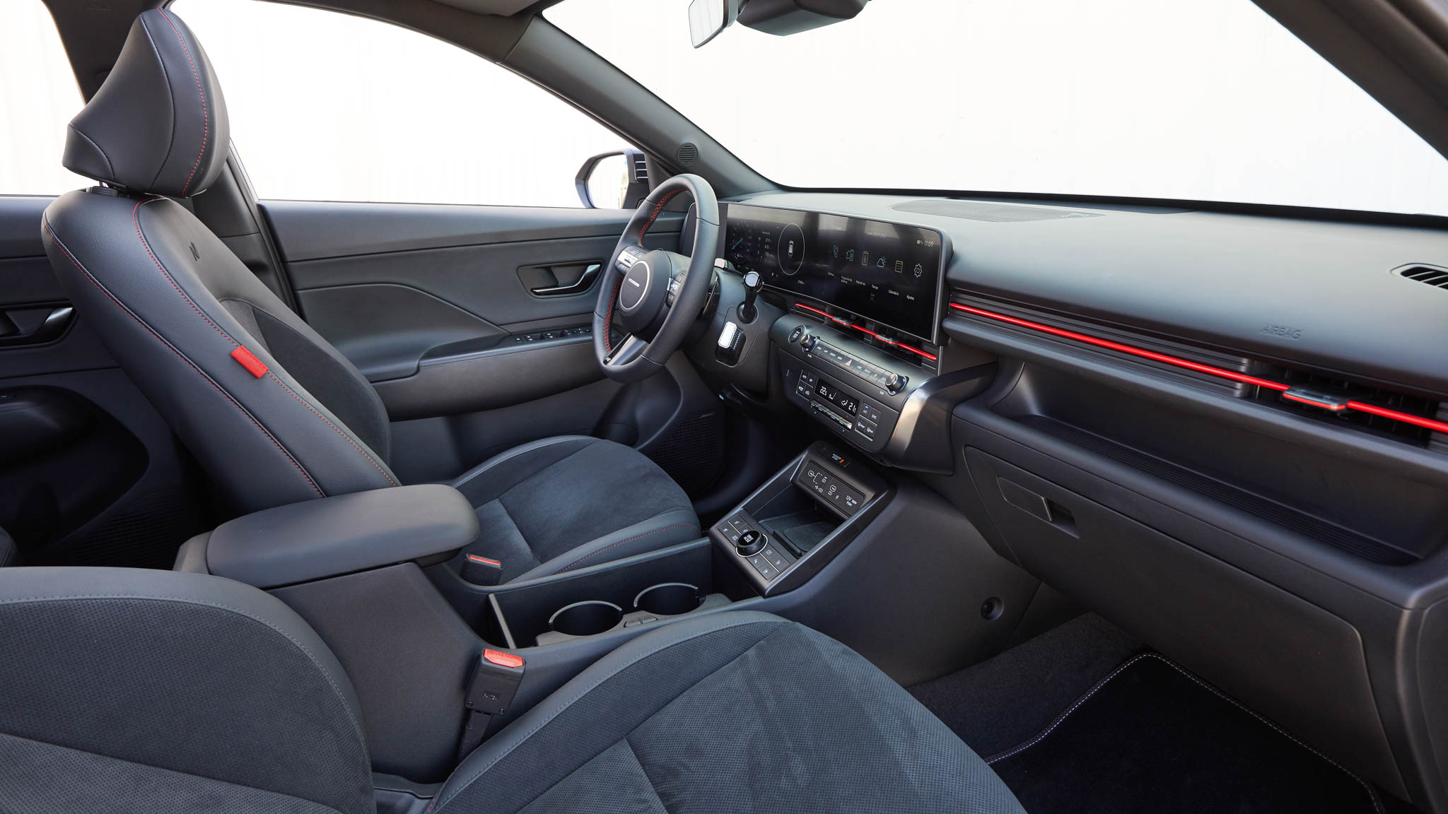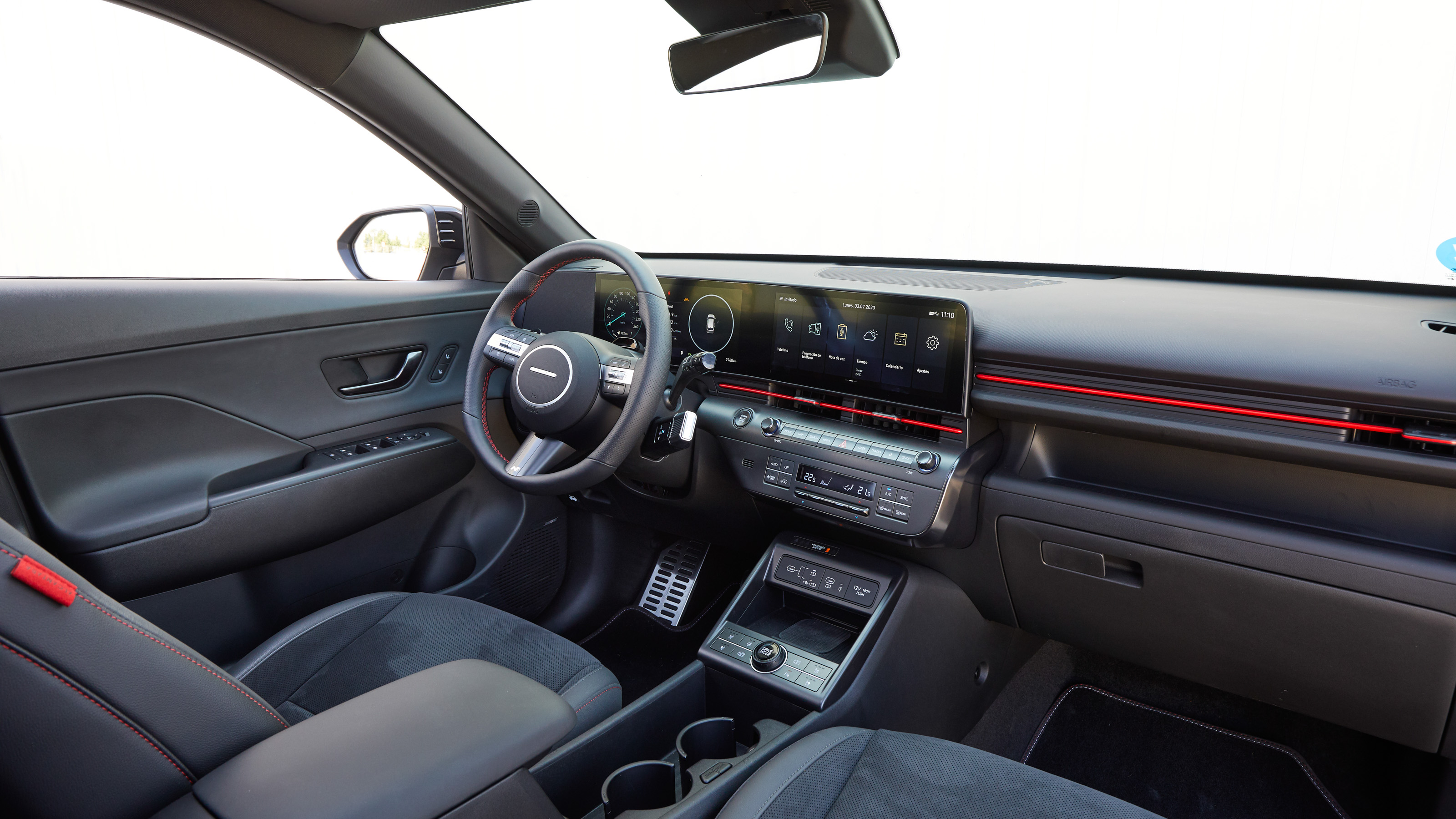 En el Kona tenemos dos pantallas curvas de 12,3" unidas, una para el cuadro de mandos y la otra para el sistema multimedia, aunque con el acabado de serie la pantalla para la instrumentación es de un menor tamaño (10,7"). El software es completamente actualizable Over-The-Air (OTA) y ofrece los servicios con conectividad Bluelink, por ejemplo para disponer de información a tiempo real en la navegación, la ya usual conectividad para móviles Android o Apple CarPlay sin cables y comandos por voz. Tiene unos gráficos visualmente claros y agradables.