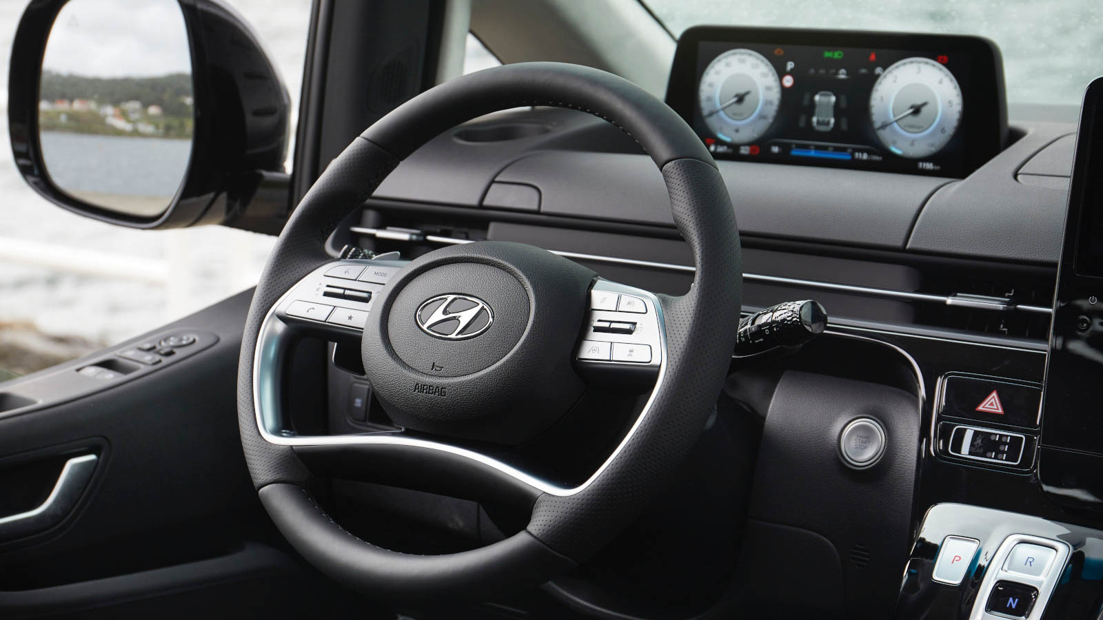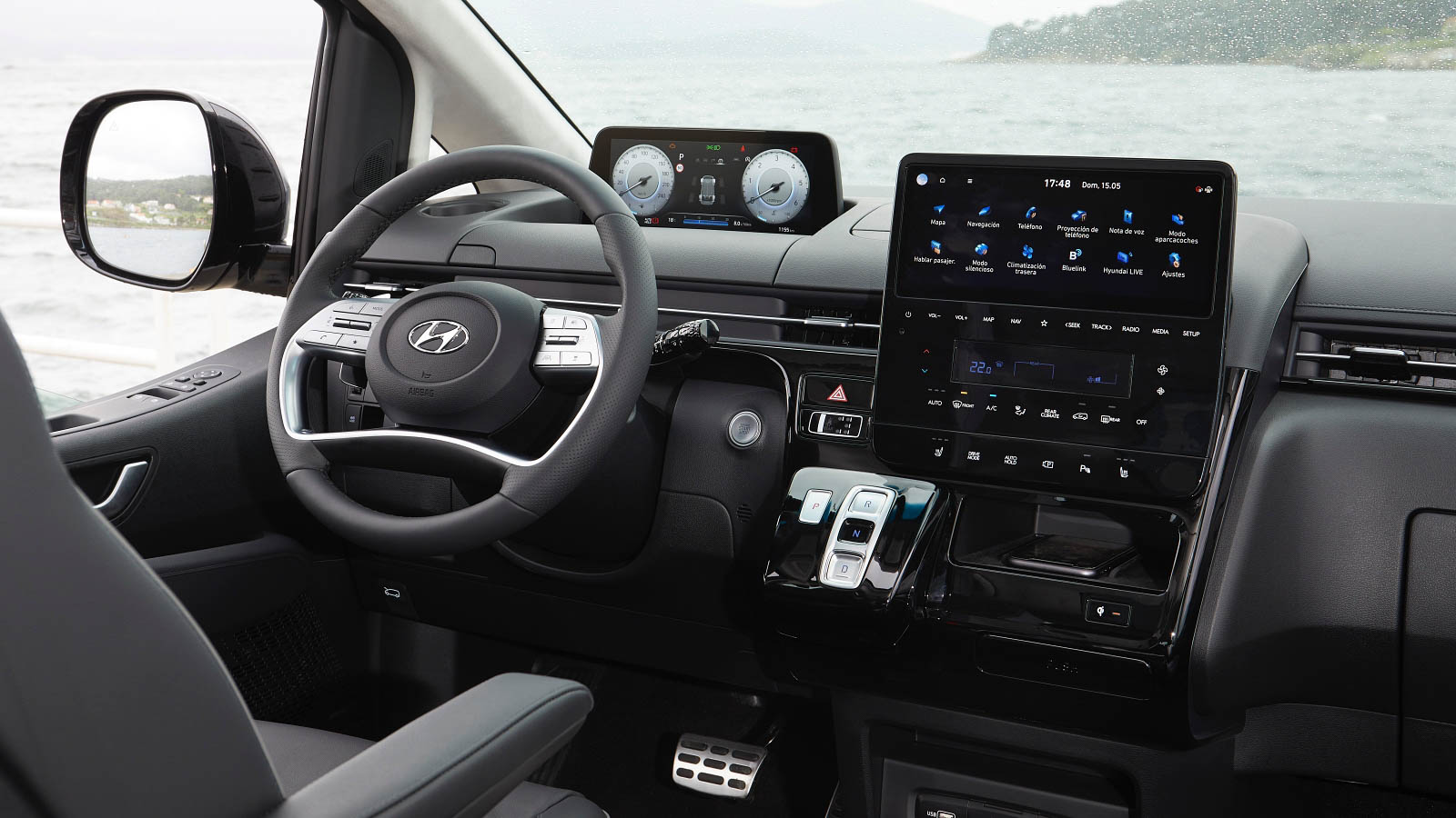 A la hora de equipar el Staria, Hyundai ha optado por la tecnología más actual de la casa. La digitalización toma el protagonismo gracias a dos pantallas. Una de ellas cumple las funciones de instrumentación, mostrando la información más importante relativa a la conducción con diferentes formatos de presentación. La segunda es la pantalla principal del sistema multimedia. Con 10,25 pulgadas el manejo táctil es rápido e intuitivo. Una barra de accesos rápidos reduce la distracción en marcha, aunque la pantalla queda algo alejada con respecto al volante.