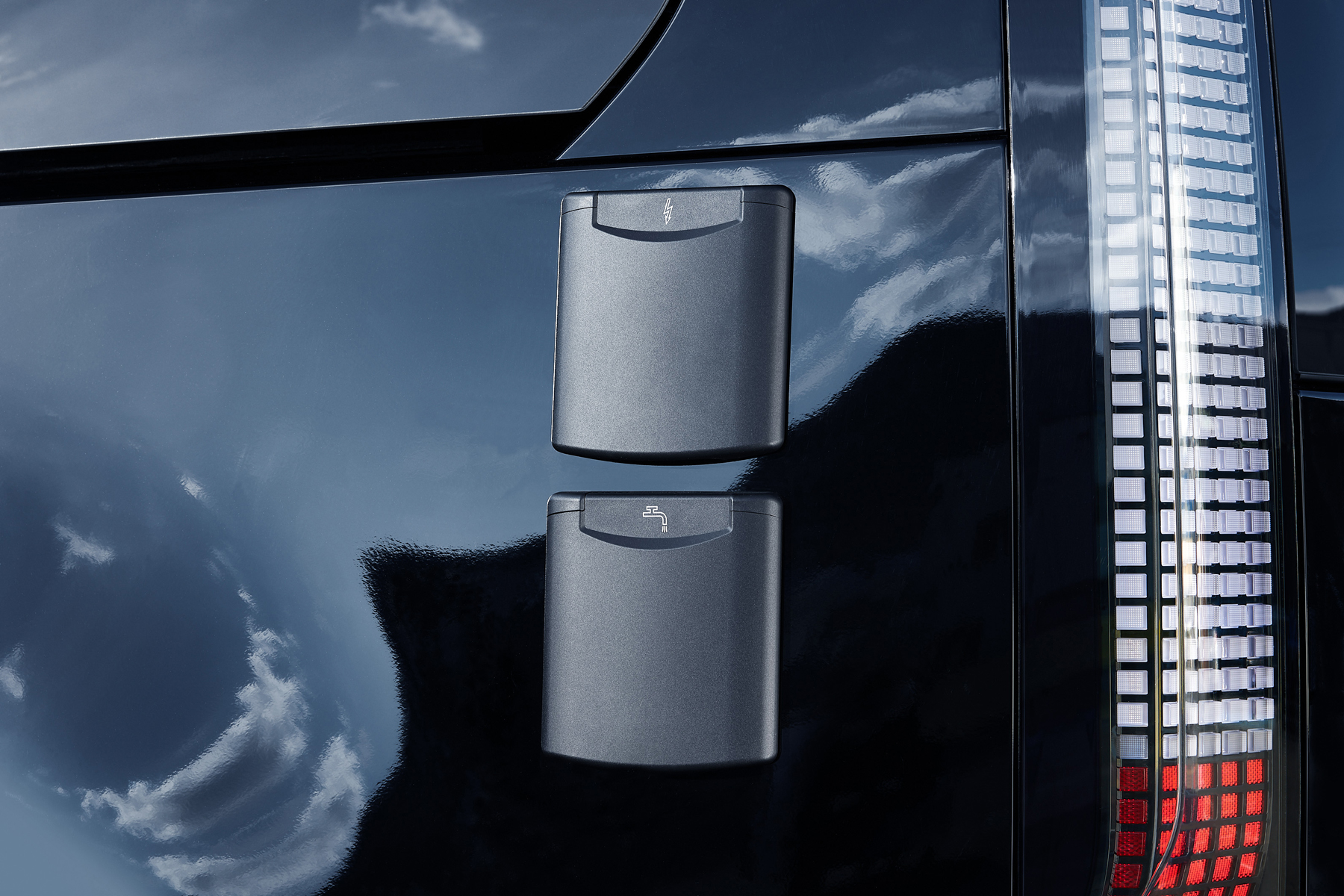 La caravana también incorpora cristales inteligentes en la parte trasera, ajustables electrónicamente para controlar la privacidad, la luz, el aislamiento térmico y acústico. Los asientos delanteros tipo butaca pueden girar 180 grados para formar una zona de descanso, y los traseros se pliegan con un botón, creando un espacio para dos personas.