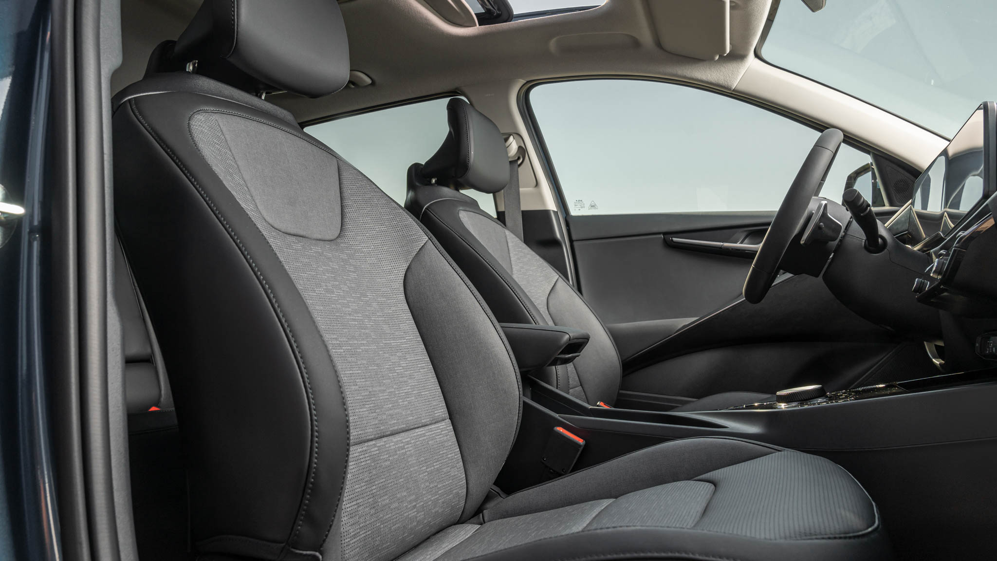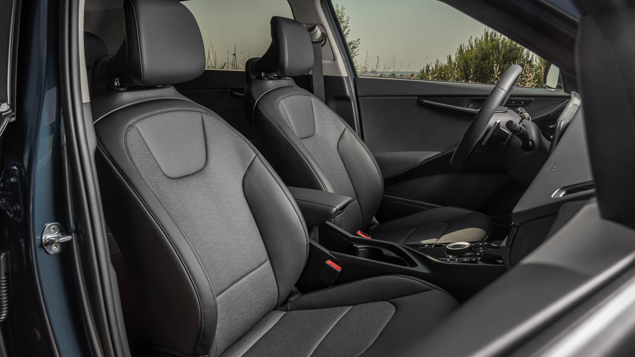 El interior del KIA Niro combina un diseño moderno con el uso de materiales reciclados y acabados veganos en telas y plásticos. El salpicadero tiene una puesta en escena muy similar a la de otros modelos recientes de la marca, con protagonismo para las pantallas y molduras en negro piano que, eso sí, se ensucian con facilidad. Los asientos delanteros son cómodos y pueden integrar reposacabezas con función de percha, un detalle práctico para el día a día.