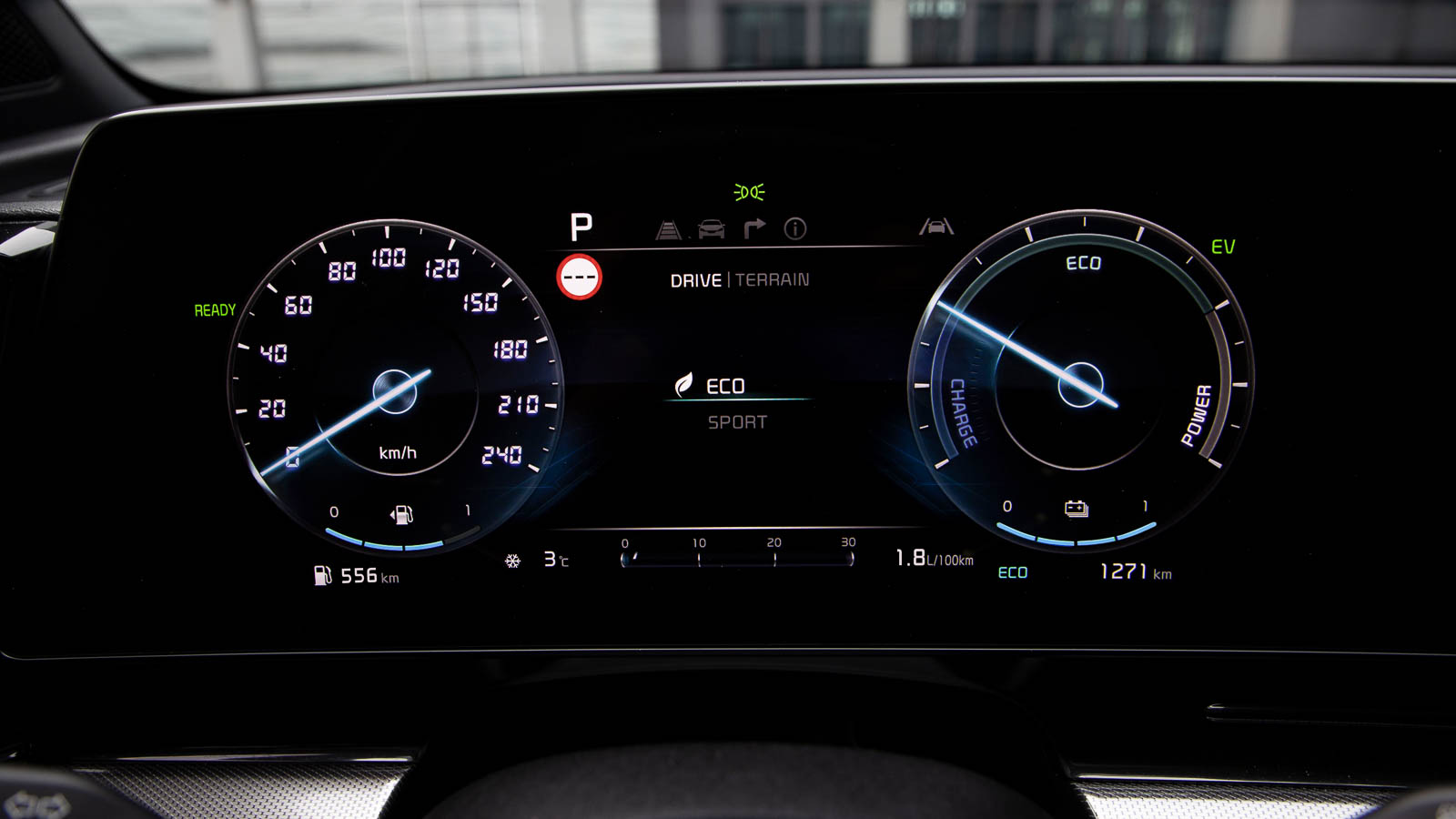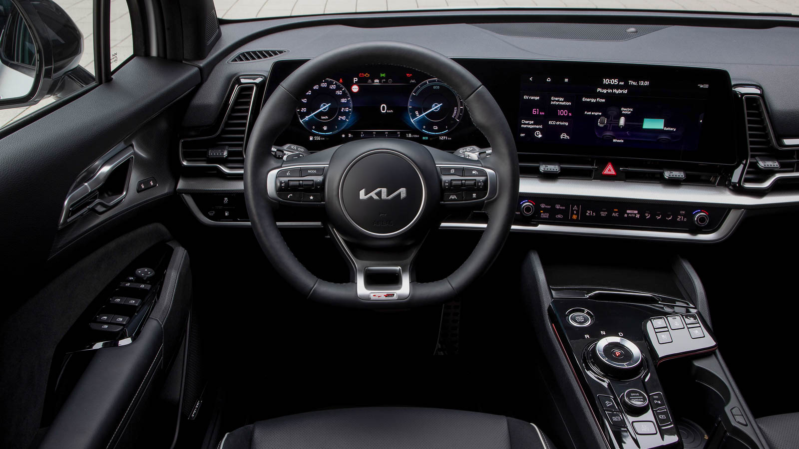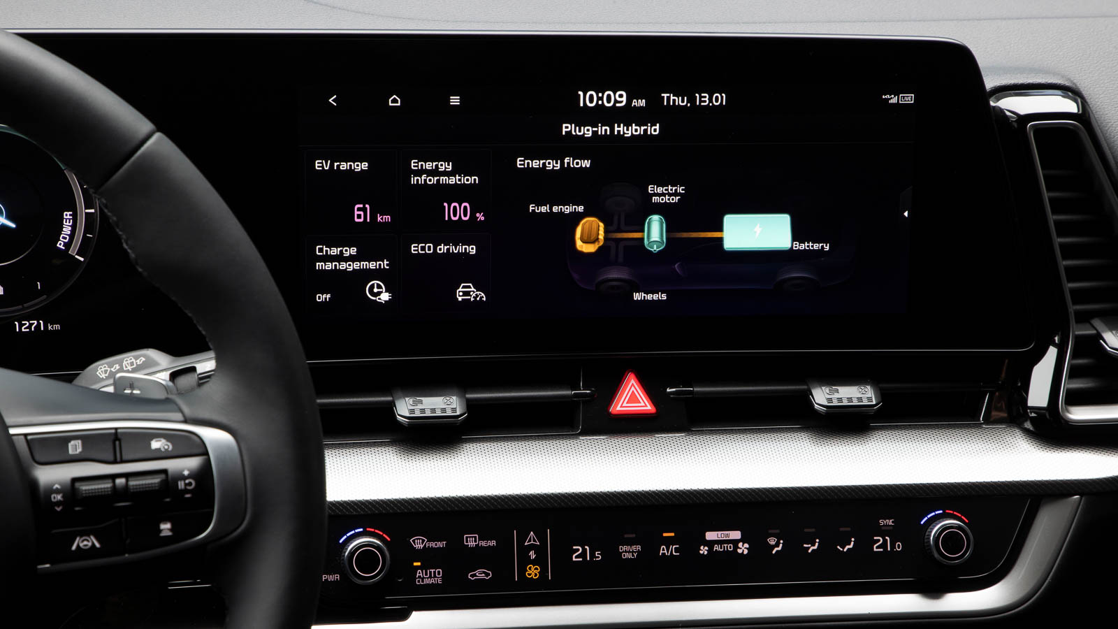 El KIA Sportage PHEV dispone de un sistema multimedia con pantalla táctil de 10 pulgadas de buena respuesta. Un peculiar sistema táctil alterna los mandos de acceso directo en un segundo panel táctil para que éstos sirvan para regular la climatización o bien el equipo de audio sin tener que entrar en los correspondientes menús en la pantalla táctil principal. Su uso es muy sencillo e intuitivo. En cuanto a conectividad, además de contar con Apple Car Play y Android Auto, estas versiones PHEV disponen de una aplicación para el teléfono móvil con la que podremos vigilar, programar, conectar y desconectar las recargas del sistema eléctrico, verifica la autonomía restante, etc. También es posible programar el sistema de climatización para que el vehículo esté ya a una temperatura de confort cuando lo vayamos a recoger. El cuadro de instrumentos es completamente digital y la información se puede ampliar en las versiones más equipadas con un head up display de gran tamaño que proyecta la información sobre el parabrisas.