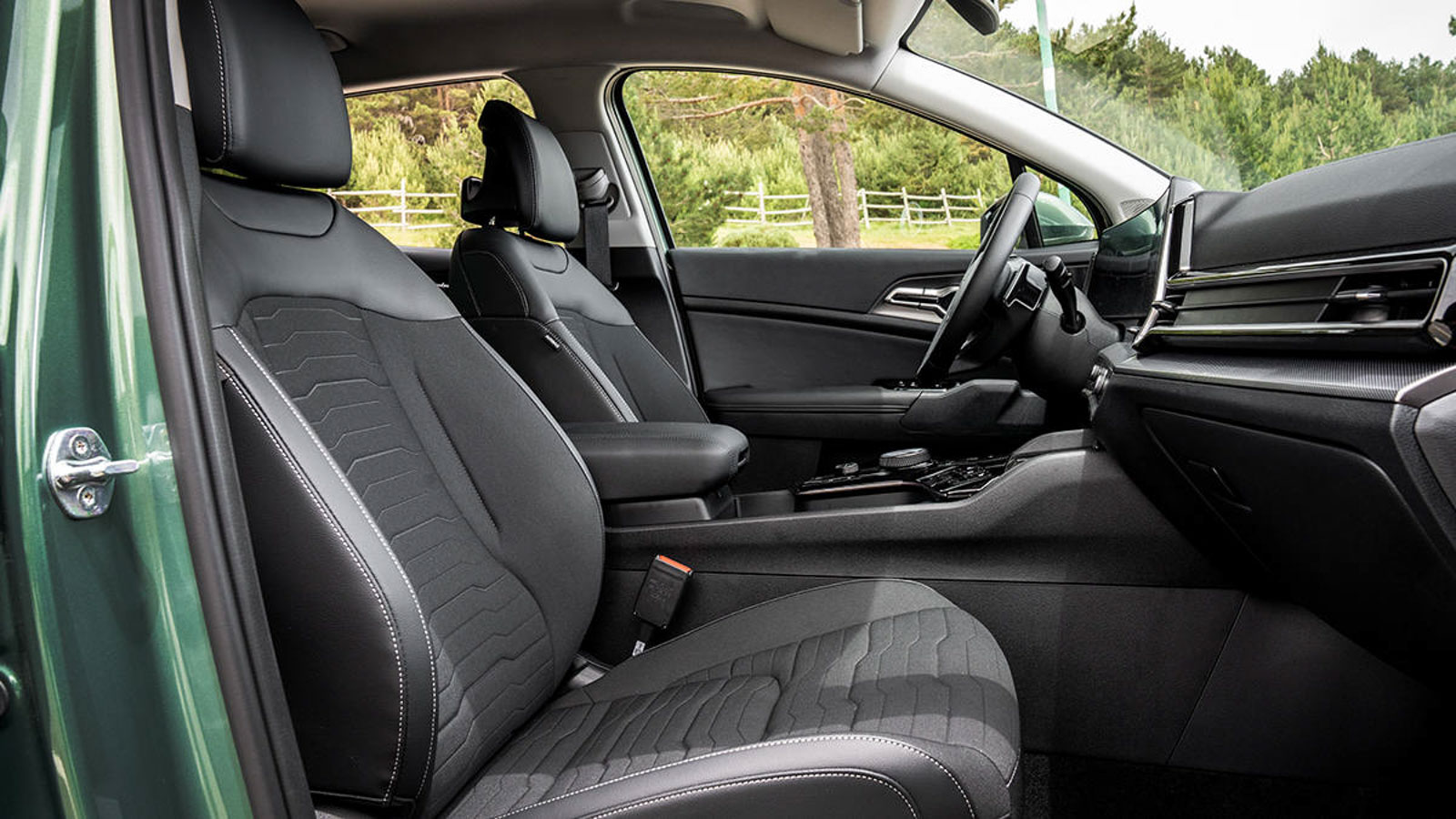 El KIA Sportage ofrece un interior espacioso para su tamaño, con unas plazas delanteras muy confortables gracias a los reglajes del asiento y de la columna de dirección y la ergonomía de los mandos. Los acabados y ajustes son correctos, aunque se usa el plástico negro piano en exceso en la zona de la consola, muy expuesta a marcas y rayazos. Las plazas traseras tienen una cota correcta en longitud para las piernas y muy buena en altura. La anchura es escasa para que 3 adultos viajen confortablemente, pero está dentro de la media de la categoría.