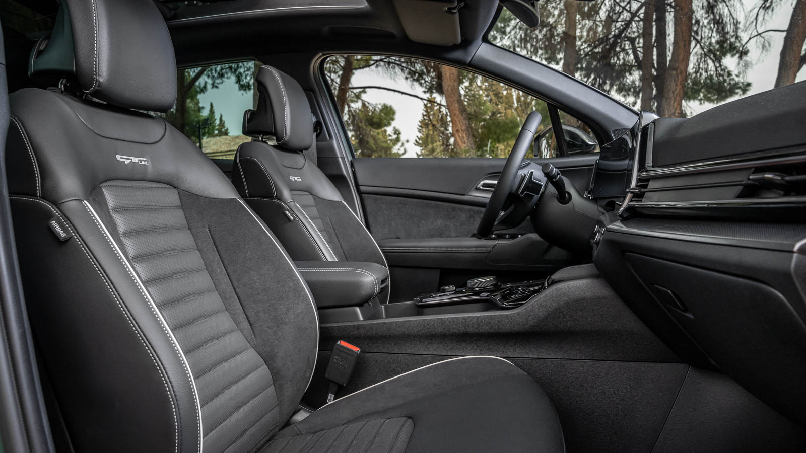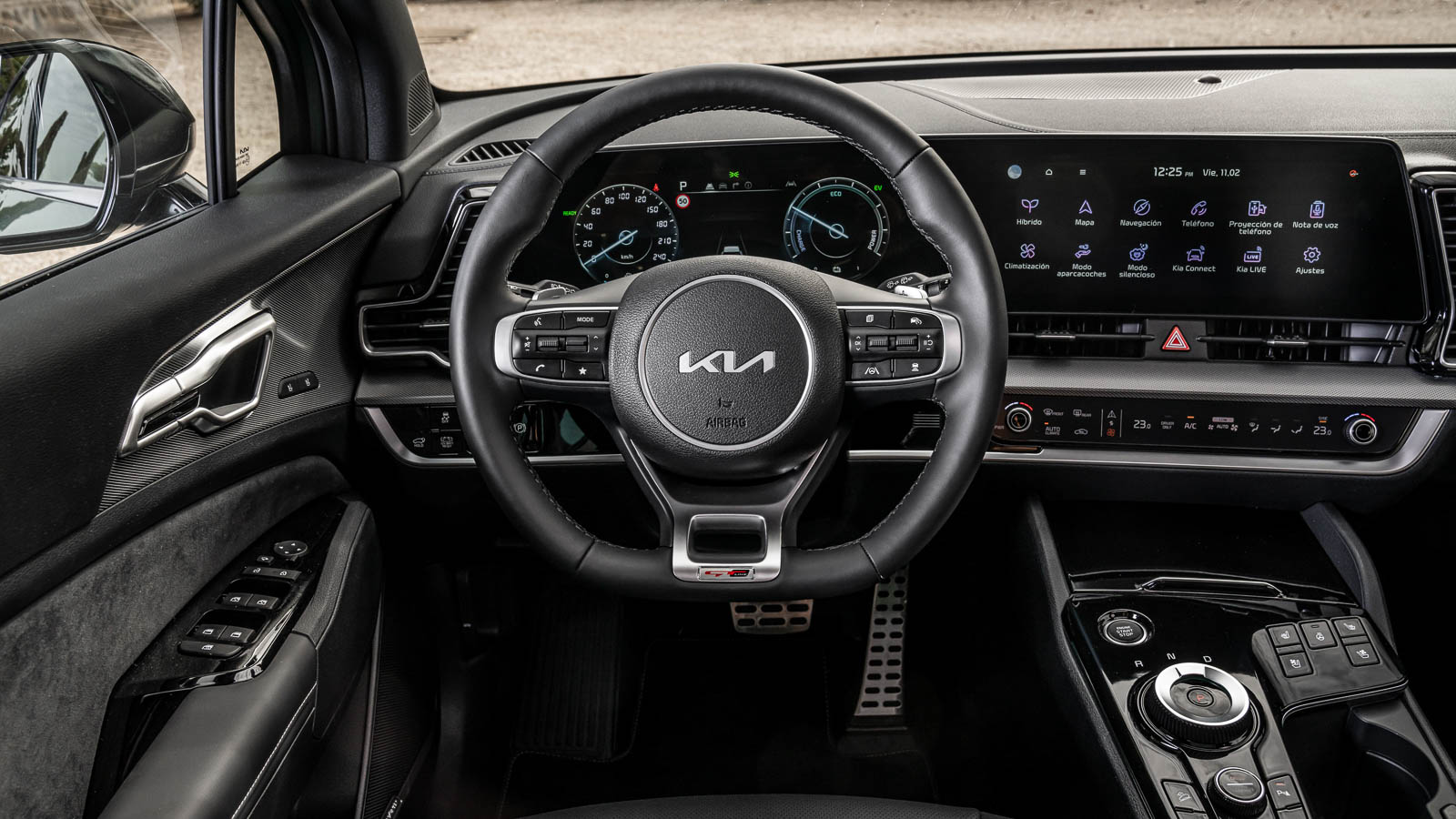 En combinación con el acabado GT-Line, que es el único que hemos podido probar, el Sportage dispone de una tapicería de cuero, un volante achatado forrado de piel fina con inserciones de aluminio, unos paneles de las puertas de ante y unas molduras decorativas en las puertas que simulan aluminio, material del que sí parecen estar construidos los tiradores de las mismas y los pedales.