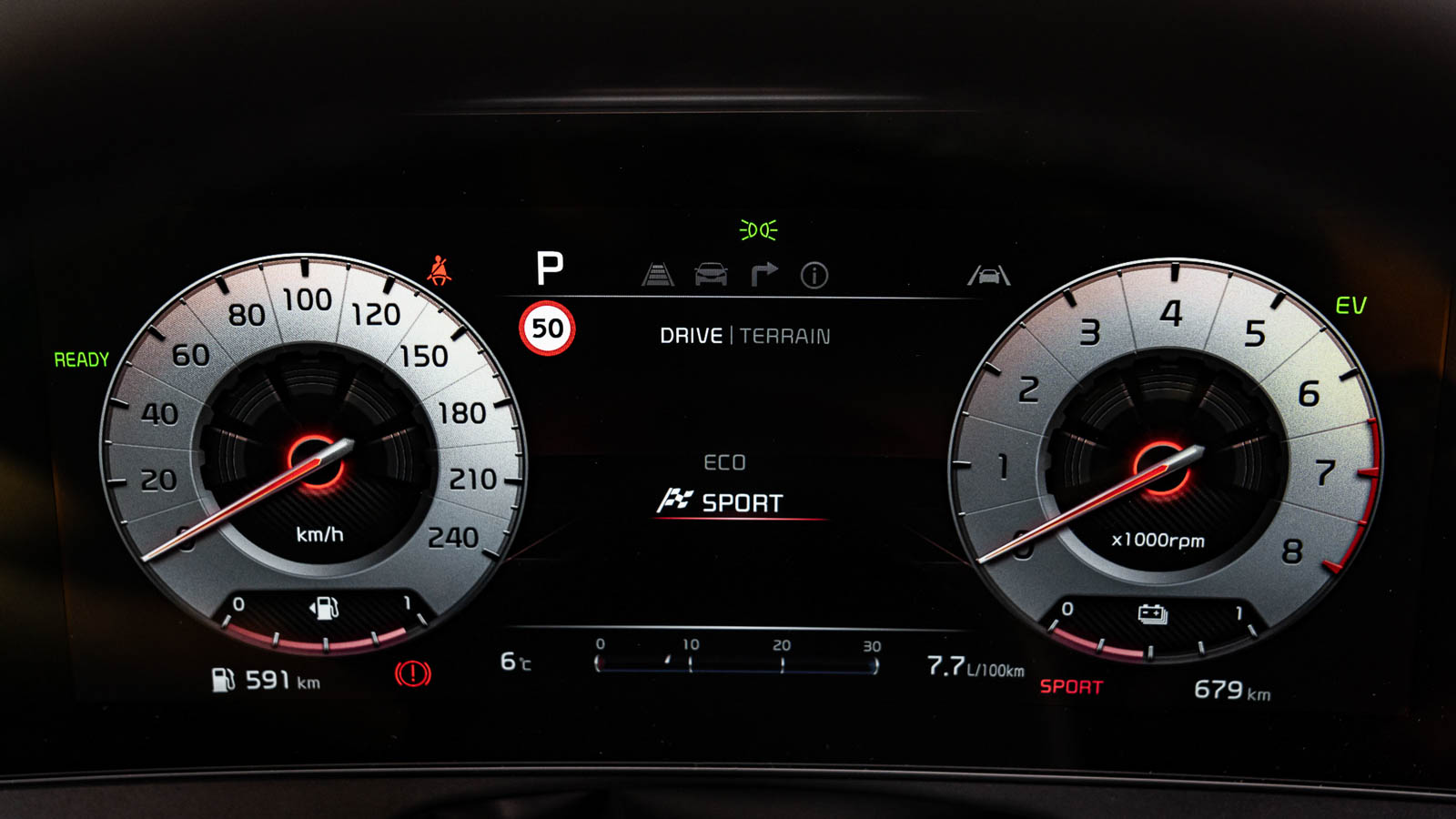 En el salpicadero hay dos pantallas, cada una de 12,3 pulgadas, integradas bajo un mismo cristal con cierta curvatura, lo que provoca que la más centrada, encargada de mostrar las funciones multimedia, quede ligeramente orientada hacia el conductor. La otra hace de cuadro de instrumentos. Este recurso de colocar dos pantallas iguales, una al lado de la otra, ha sido empleado por muchos otros fabricantes antes que KIA. La interfaz de infoentretenimiento es idéntica a la del KIA Sorento y parecida a la del Hyundai Tucson. Es compatible con Android Auto y Apple CarPlay mediante conexión inalámbrica como la mayoría de modelos nuevos de esta categoría.