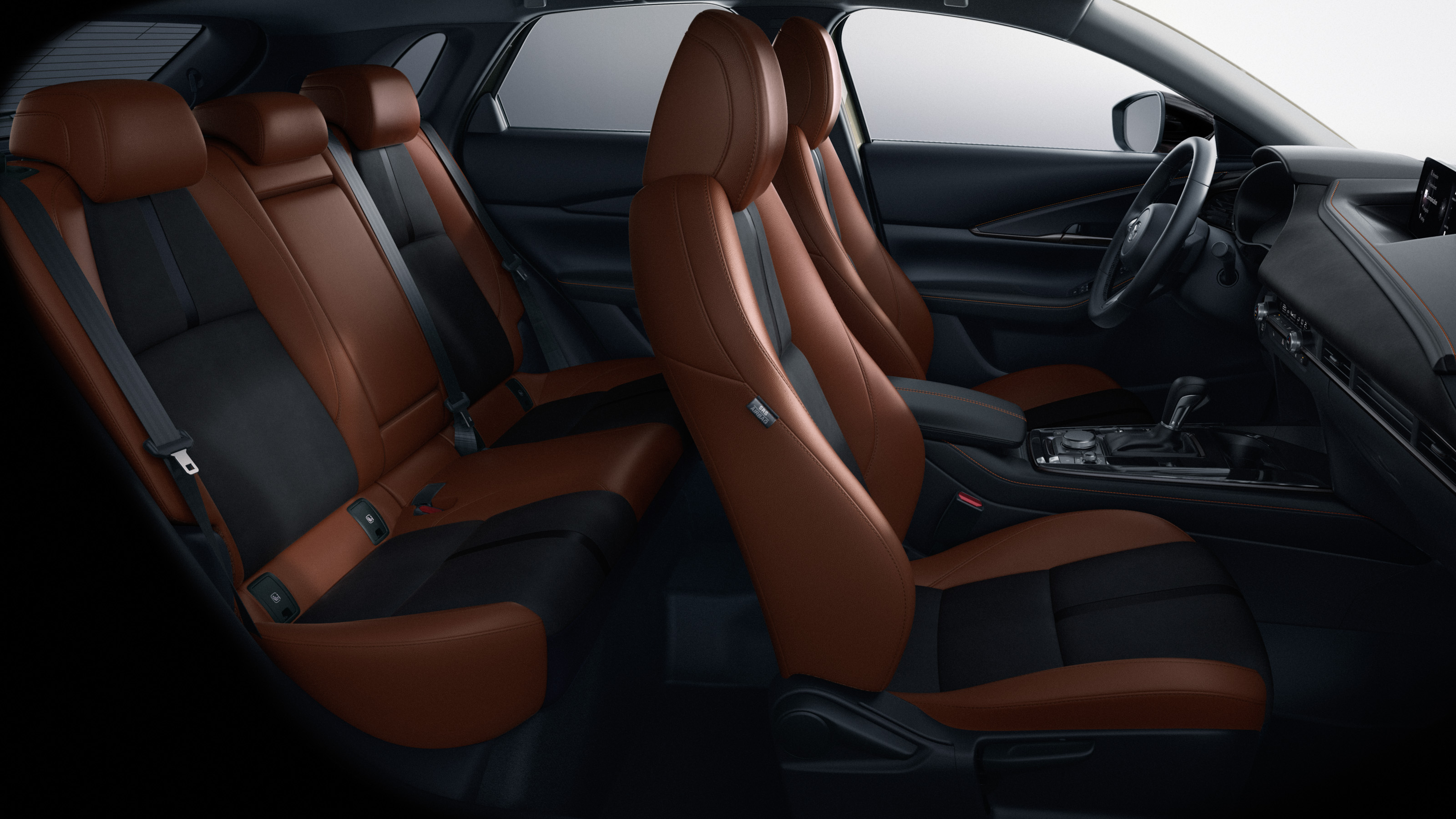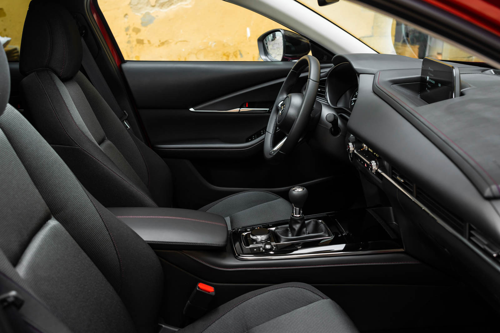 Por tanto, no tiene un aspecto exterior de coche tan todoterreno, pero sí que tiene algunas ventajas de los SUV como su mayor altura. En concreto, el asiento del conductor está situado 9 cm más alto con respecto a la carretera que en el Mazda 3 y 4,5 cm más con respecto al suelo del coche. Esto quiere decir que el acceso y la salida del habitáculo es más sencillo porque hay que flexionar menos las piernas, la postura de conducción es un poco más erguida y elevada con la cadera menos “estresada” y, al final, conduces más cómodamente y con mejor visión periférica del tráfico que nos rodea.