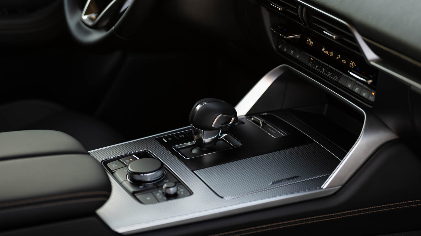 No hay prácticamente ningún detalle especial que distinga el habitáculo de esta versión del resto de la gama (del que tienes todos los detalles en la información del Mazda CX-60), salvo los mandos específicos del sistema híbrido de impulsión para cambiar los modos de conducción.
