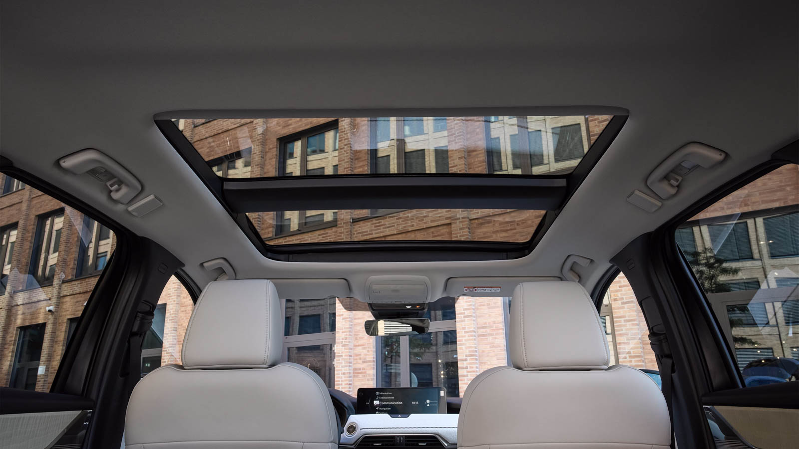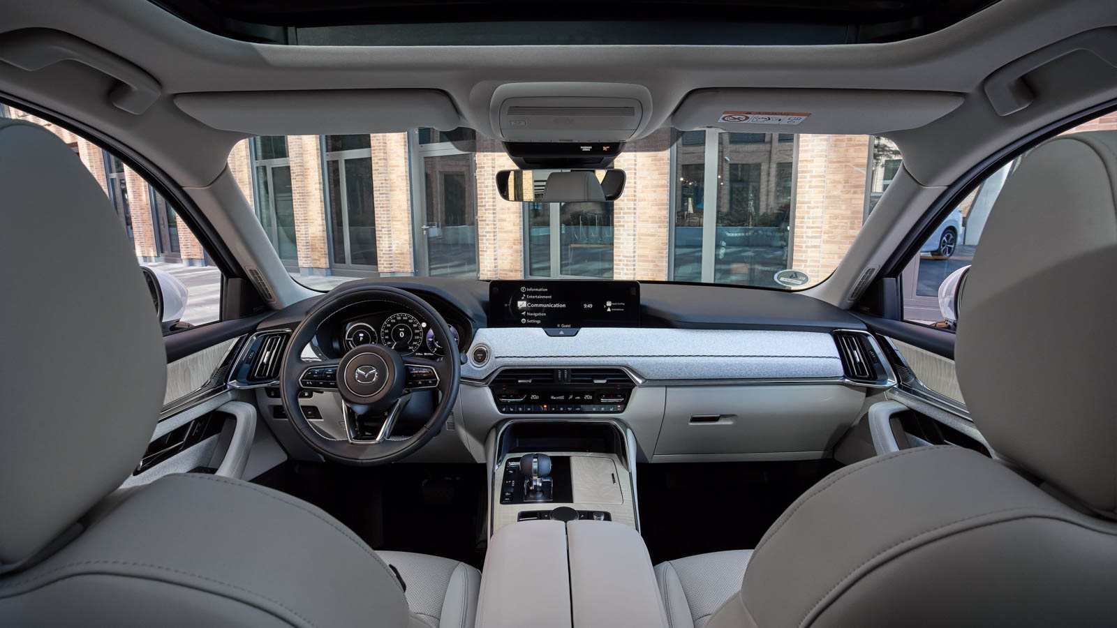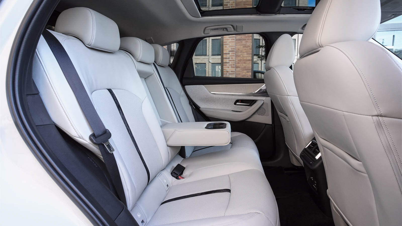El túnel de la transmisión sobresale poco del resto del piso. Aunque la altura libre hasta el techo es un poco menor debido al techo panorámico de cristal, el acceso a las plazas traseras es muy cómodo porque las puertas abren en un ángulo cercano a los 90 grados. En general, el Mazda CX-60 ofrece un interior de alta calidad y cómodo para sus pasajeros.
