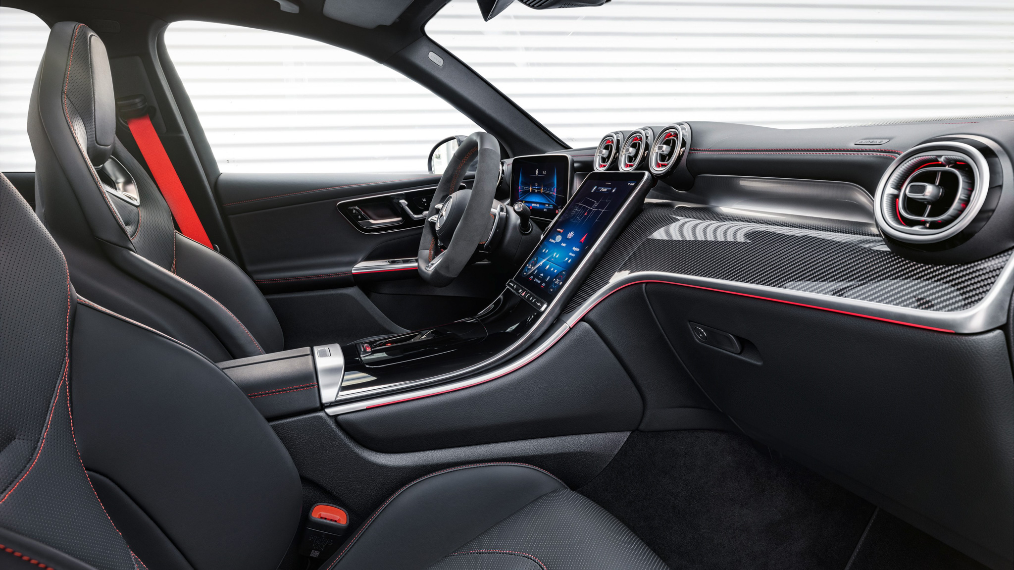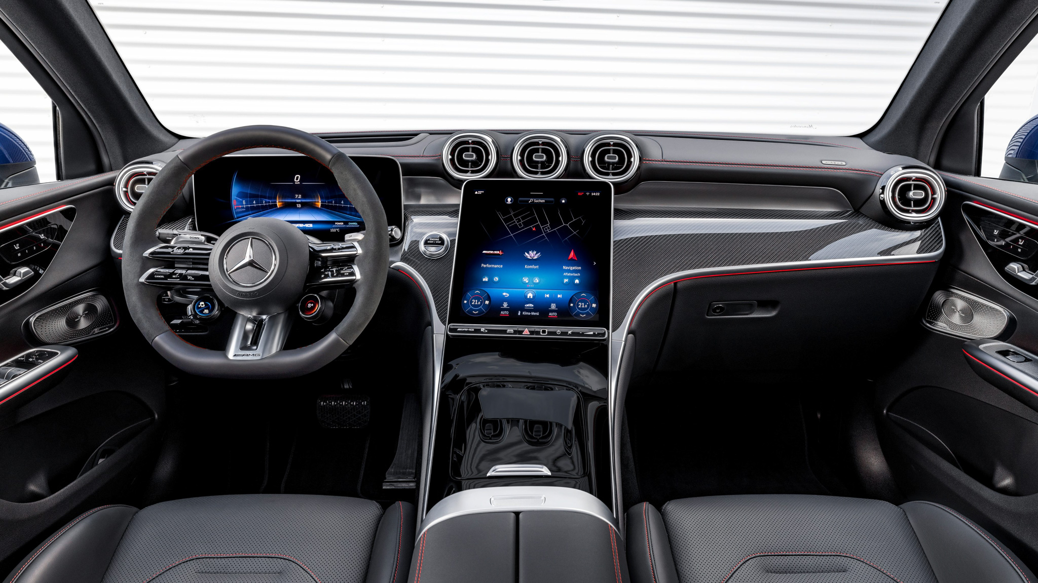 El sistema multimedia MBUX es similar al del resto de las versiones del GLC, del cual damos muchos detalles en su artículo específico. Hay dos pantallas de 12 pulgadas, una para la instrumentación y otra para el infoentretenimiento que va colocada en vertical. En esta versión incluye menús específicos de las versiones AMG que permiten consultar los datos relativos el sistema de propulsión, como la temperatura del motor y la transmisión, o la potencia y el par que se producen en cada momento.