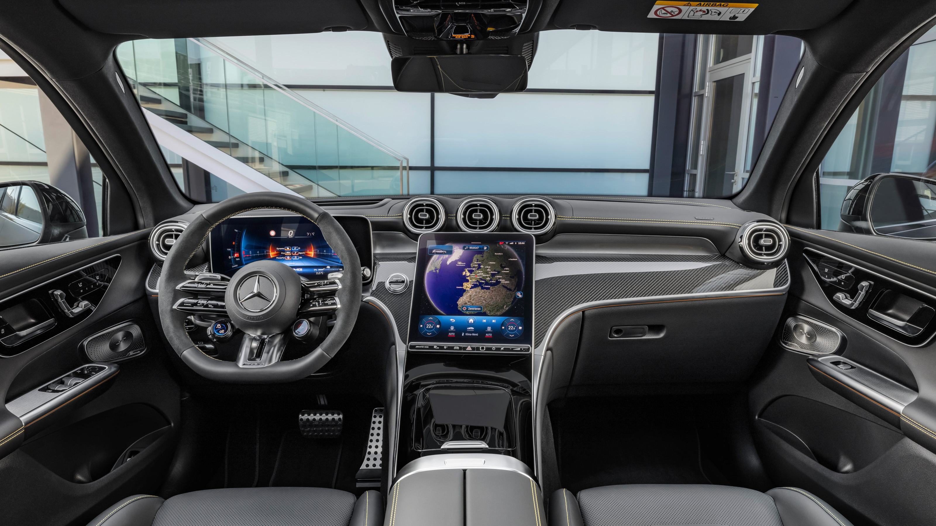 El sistema multimedia MBUX es similar al del resto de las versiones del GLC, del cual damos muchos detalles en su artículo específico. Hay dos pantallas de 12 pulgadas, una para la instrumentación y otra para el infoentretenimiento que va colocada en vertical. En esta versión incluye menús específicos de las versiones AMG que permiten consultar los datos relativos el sistema de propulsión, como la temperatura del motor y la transmisión, o la potencia y el par que se producen en cada momento.