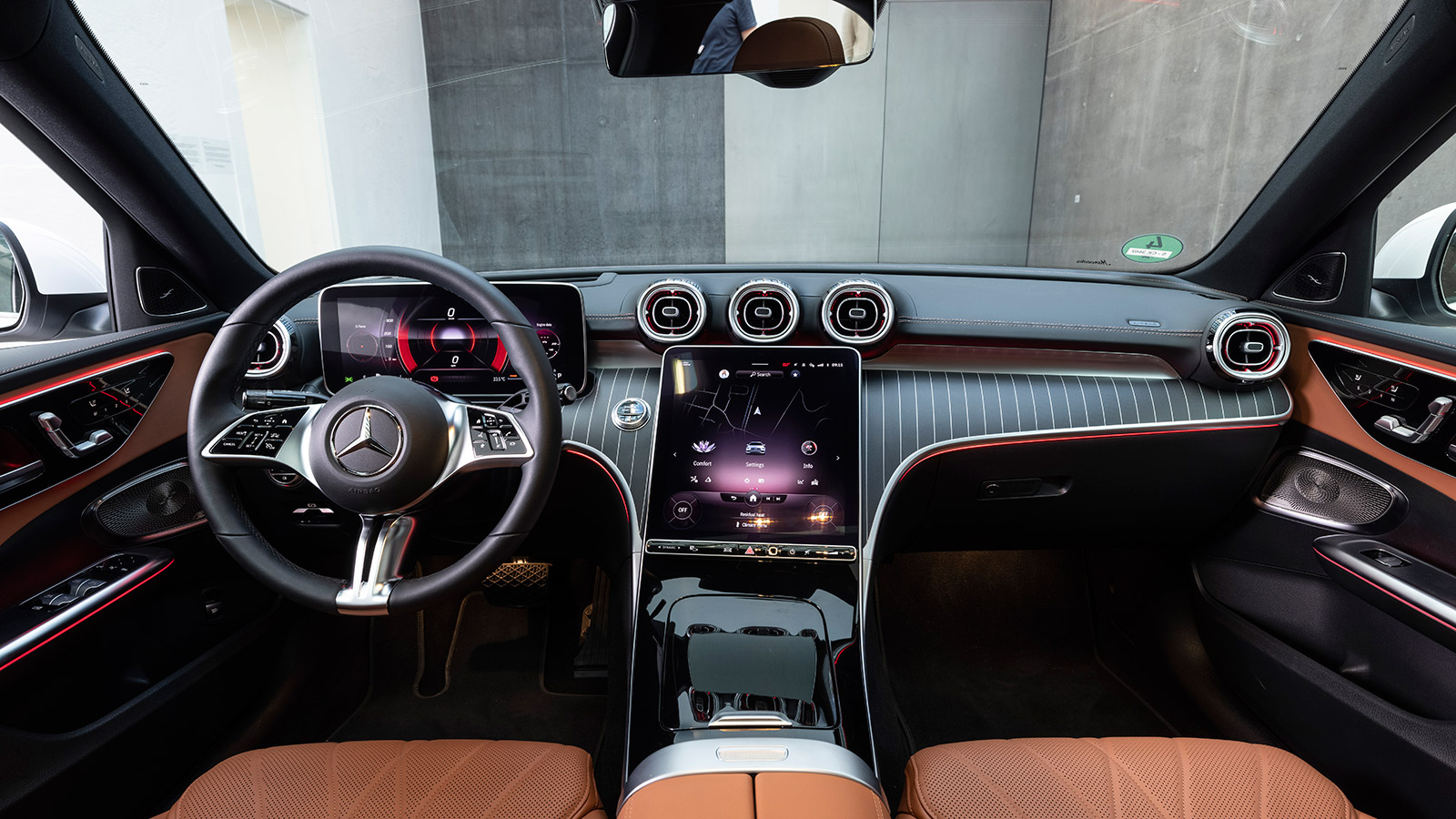 El habitáculo de esta generación del Mercedes-Benz Clase C es más “galáctico” que nunca. Las dos enormes pantallas que hay en el salpicadero (instrumentación y sistema multimedia) están colocadas para dar la sensación de estar flotando, una ilusión que queda reforzada con el sistema de iluminación ambiental. Este es un coche para clientes a los que les guste la tecnología, no tanto para los que busquen un diseño clásico.