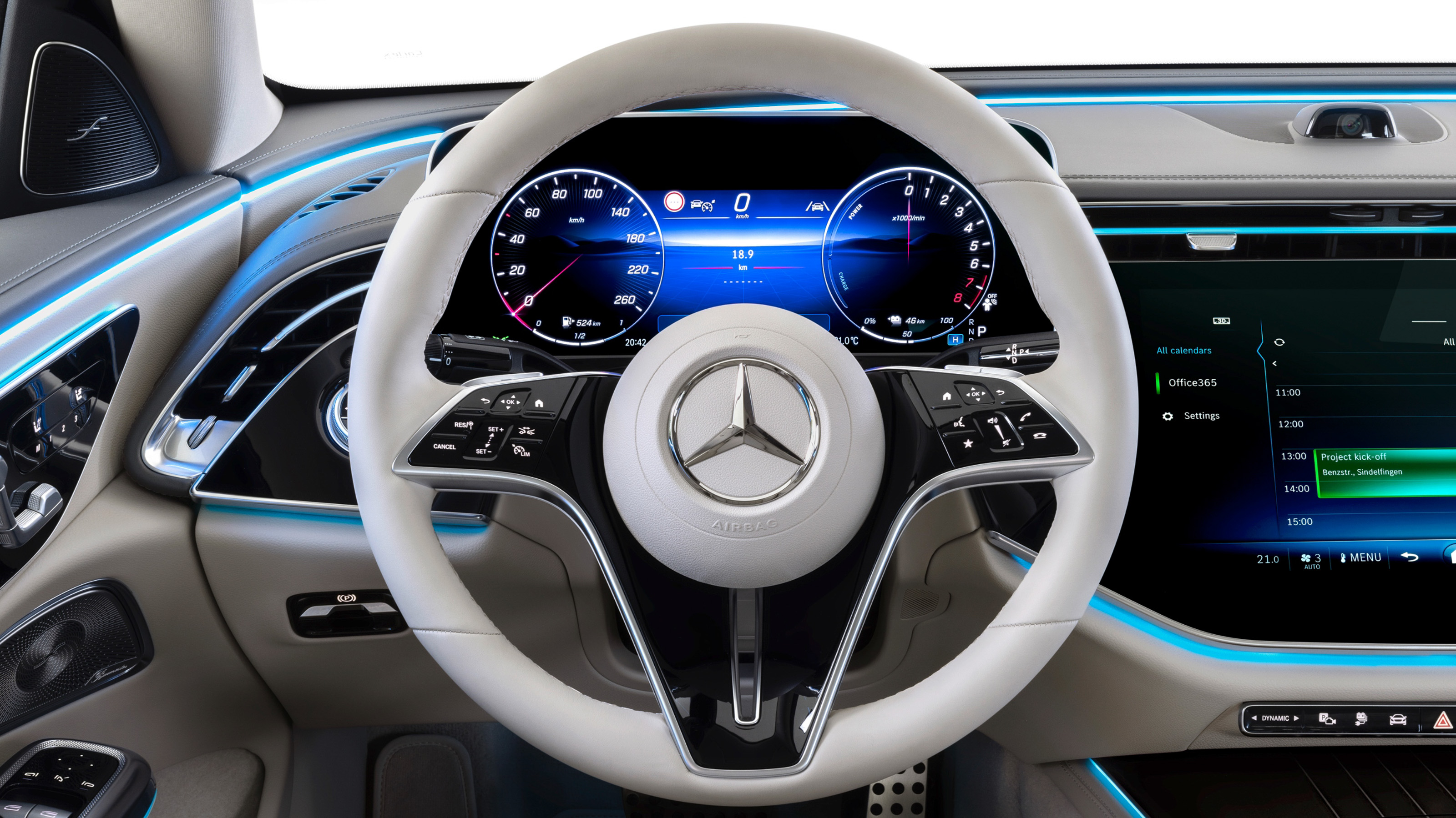 La configuración general es idéntica, con dos grandes pantallas en el salpicadero, de mucha calidad, que funcionan en base al sistema MBUX de última generación. La pantalla de la instrumentación tiene 12,3 pulgadas y la del centro de la consola, 14,4 pulgadas; esta sirve para manejar el sistema de infoentretenimiento y la climatización.
