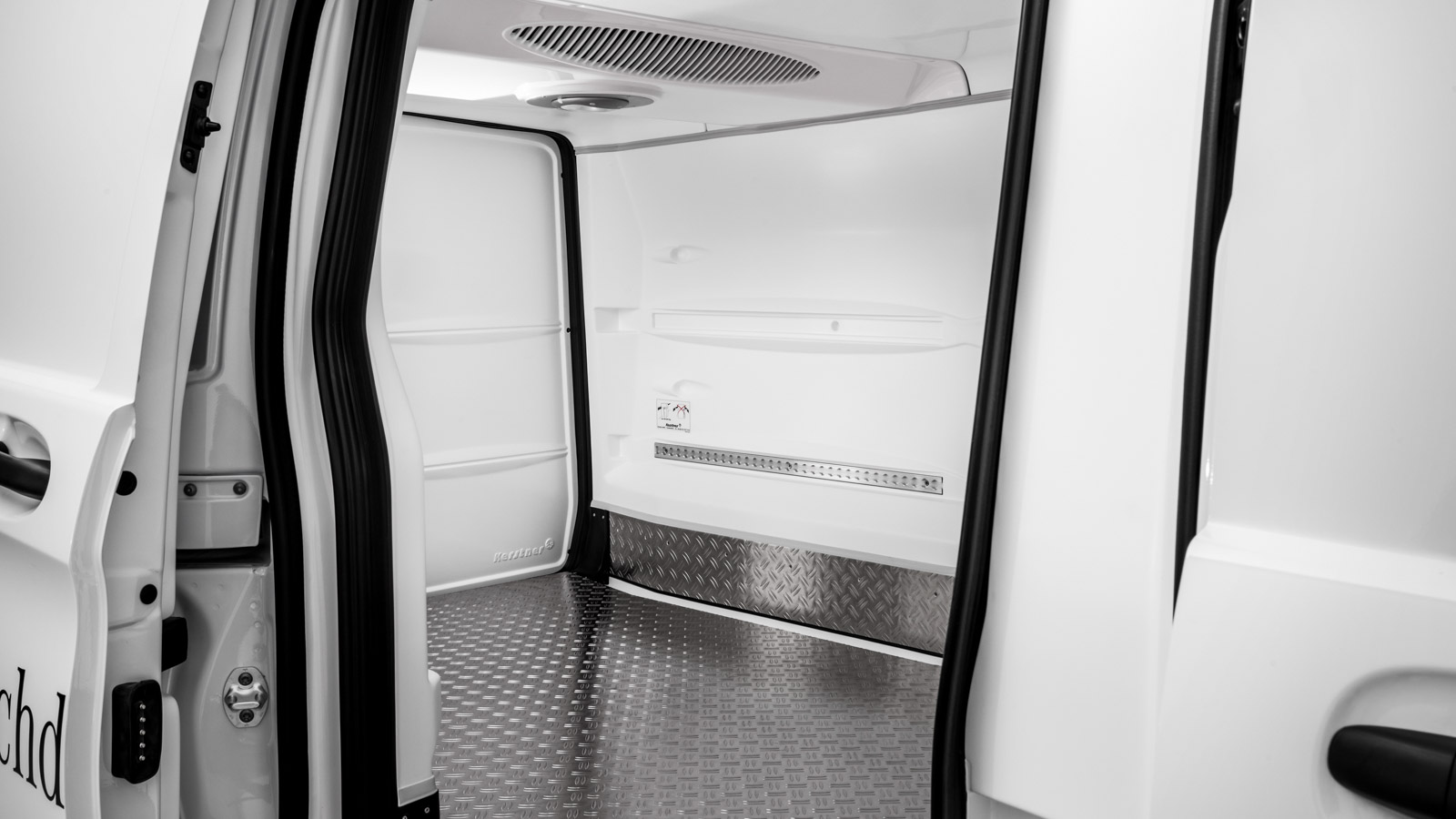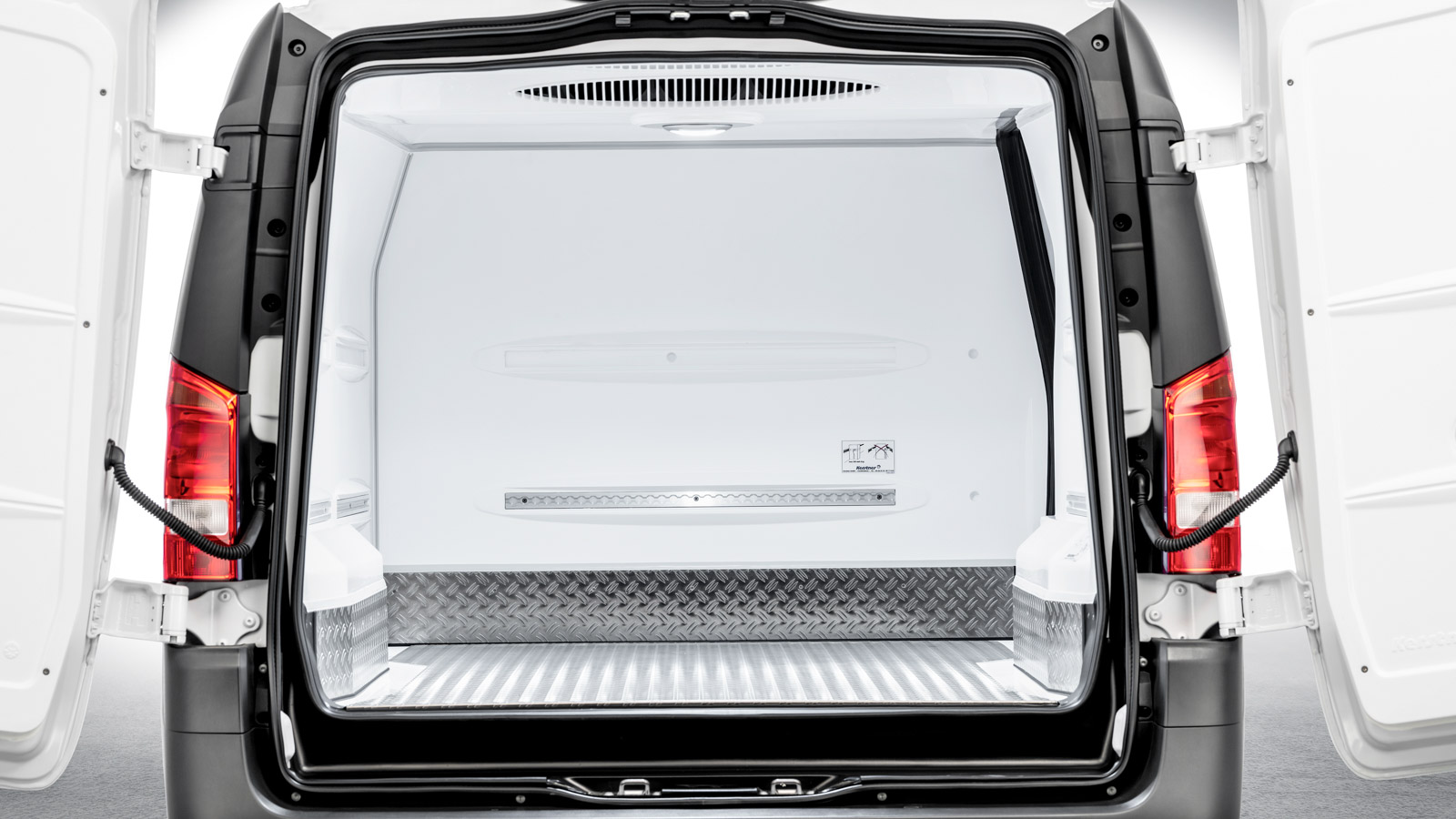 La eVito Furgón Extralarga ofrece un área de 3,06 m de longitud; 1,69 de anchura; 1,270 de anchura entre pasos de rueda; 1,39 de altura; 55,8 cm de altura hasta el nivel de la carga y 6.600 litros de carga, con 821 kg de carga útil.