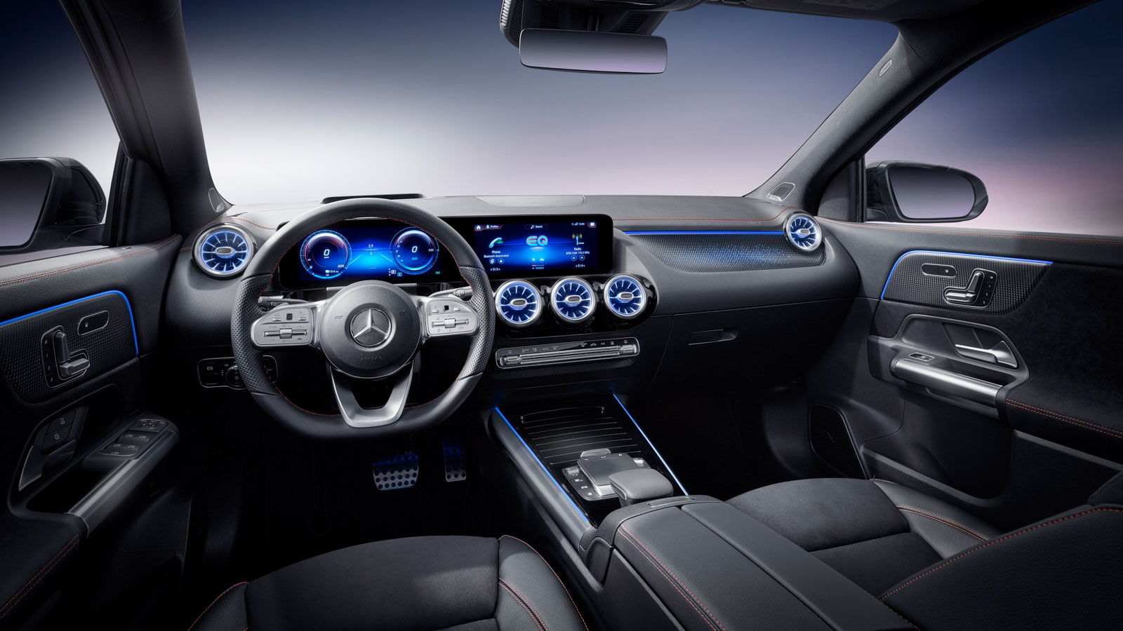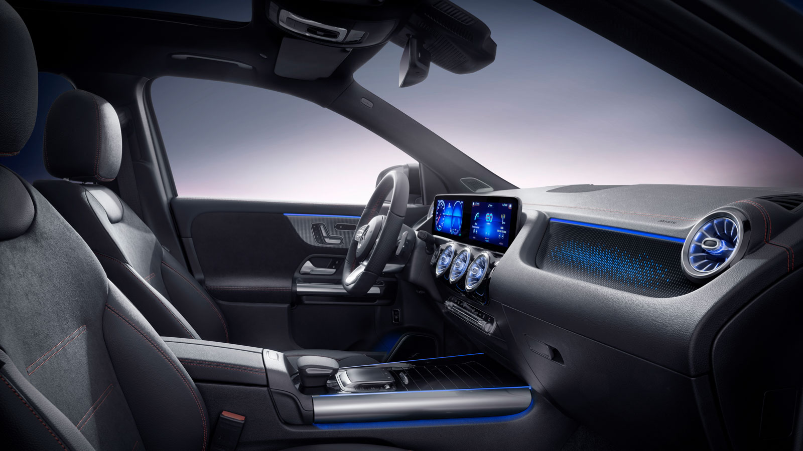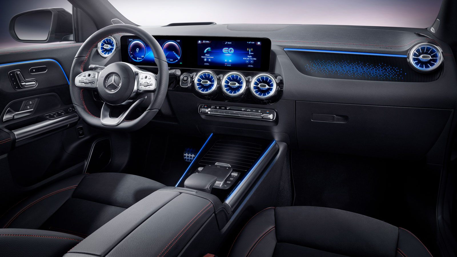 Dispone de dos pantallas de alta definición bajo un mismo cristal sin visera que se sitúa en la parte superior del salpicadero: una para el cuadro de instrumentos (detrás del volante) y otra táctil para el sistema multimedia (arriba de la consola central), con un tamaño de hasta 10,25 pulgadas en ambos casos (de serie son de 7,25 pulgadas). También, en combinación con el AMG Line, cuenta con asientos de cuero y poliéster con calefacción (y posibilidad de ventilación) en los delanteros, además de ajuste eléctrico en todas las vías y función de memoria opcional. Abunda el plástico inyectado, la piel y el aluminio para la ornamentación del salpicadero y las puertas.
