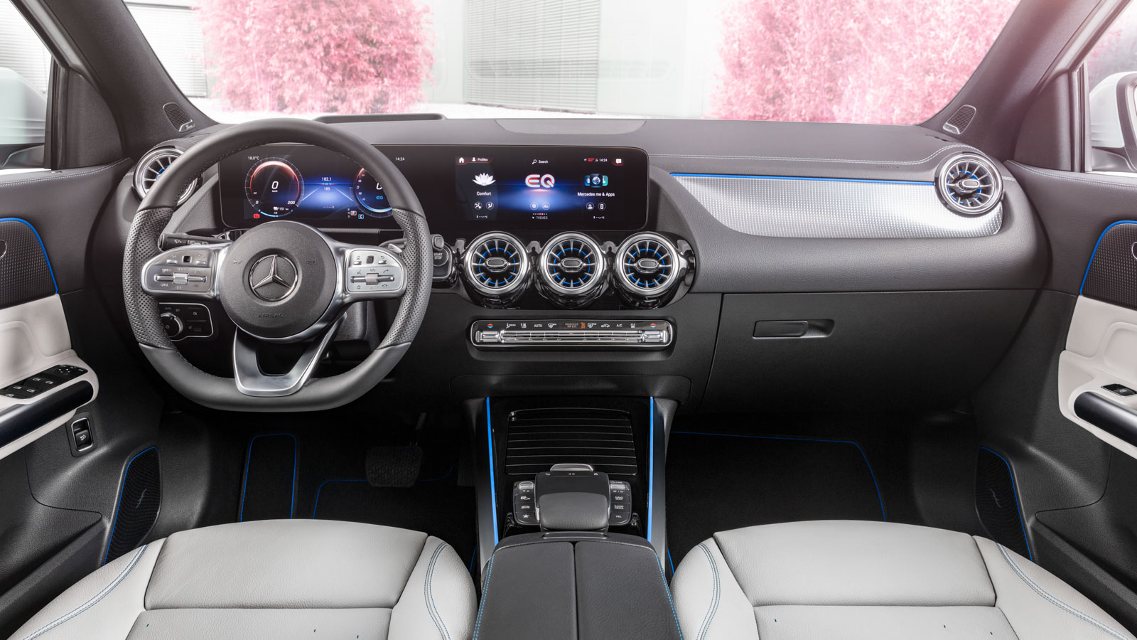 El equipo multimedia es compatible tanto con Apple CarPlay como con Android Auto. Admite varias conexiones de Bluetooth a la vez e integra radio digital (DAB), servicios con actualización remota y un navegador con GPS que, si se desea, puede tener realidad aumentada cuando se usa. Los controles para el climatizador son físicos, lo cual hace más fácil su uso mientras se conduce. También se pueden manejar mediante comandos de voz. Opcionalmente, el EQA dispone de carga inalámbrica para teléfonos móviles y equipos de sonido de alta fidelidad: uno intermedio, denominado Advanced, o el superior, Surround Burmester.