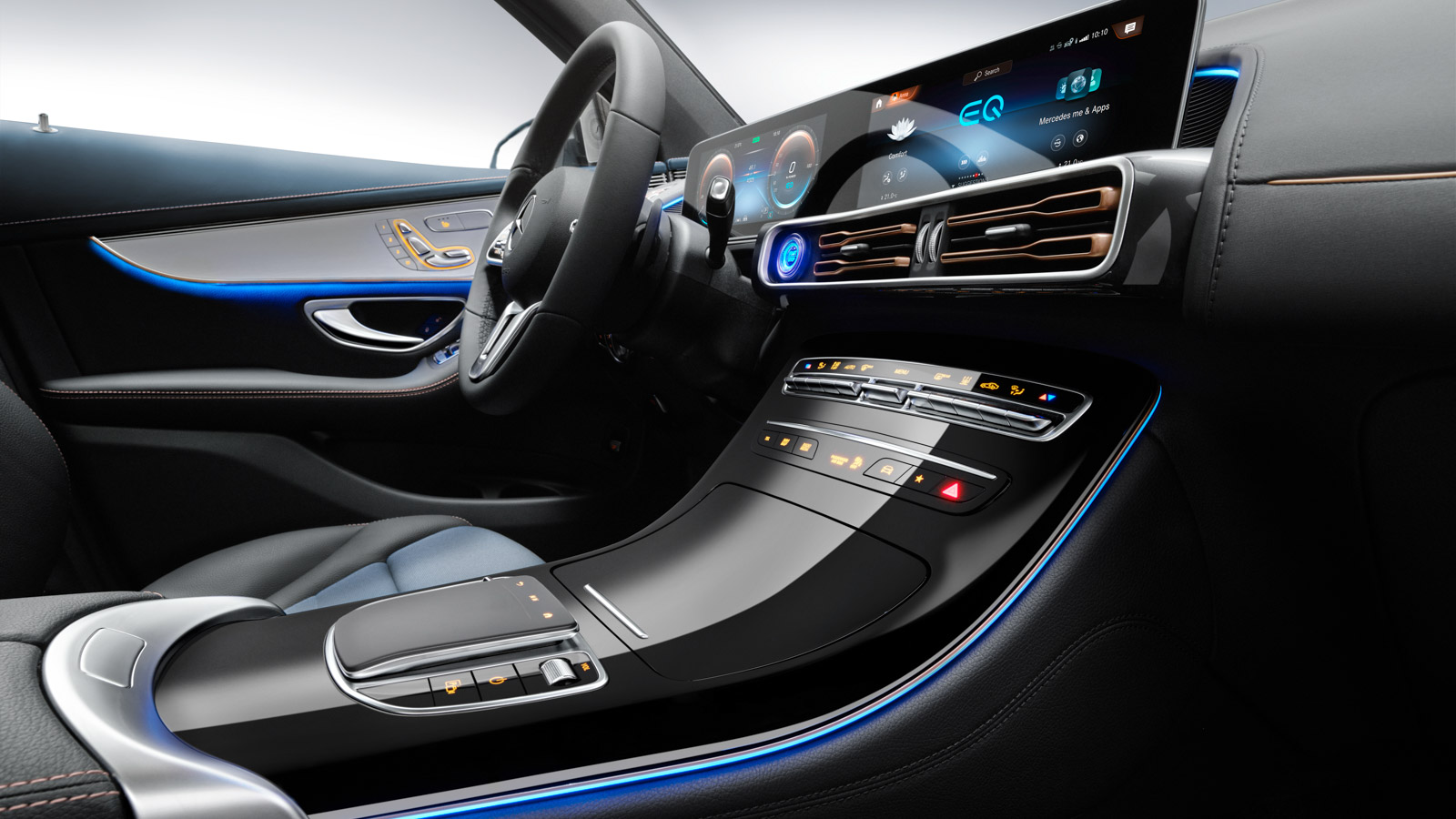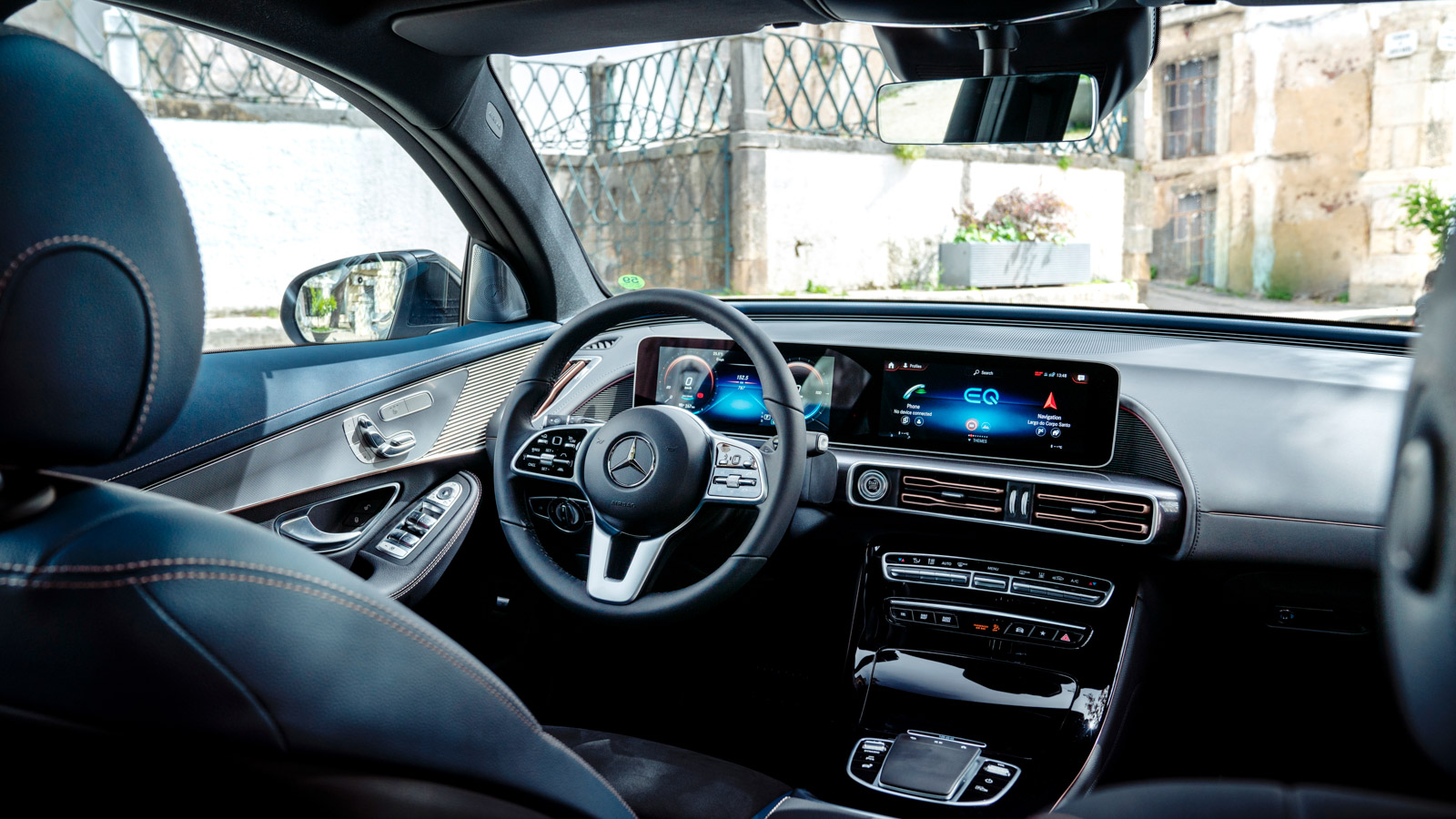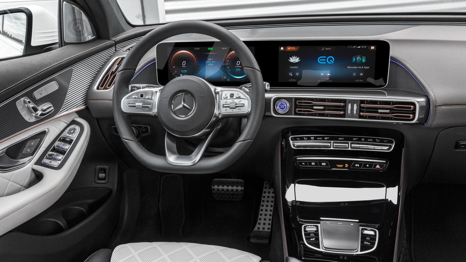 El Mercedes-Benz EQC dispone del puesto de conducción widescreen −dos pantallas de 10,25 pulgadas cada una− ,con un manejo y visualización de la instrumentación y el infoentretenimiento a través delsistemaMBUX, que gracias a su inteligencia artificial puede aprender para adaptarse y anticiparse a las acciones del usuario. Incluye un control por voz de reconocimiento de voz natural más avanzado, y el navegador tiene en cuenta para calcular la ruta más rápida las paradas necesarias para cargar la batería, mediante simulaciones permanentes de la autonomía. De forma opcional, está disponible un navegador con tecnología de realidad aumentada, un asistente que reconoce los gestos y compatibilidad con Apple Car Play y Android Auto.