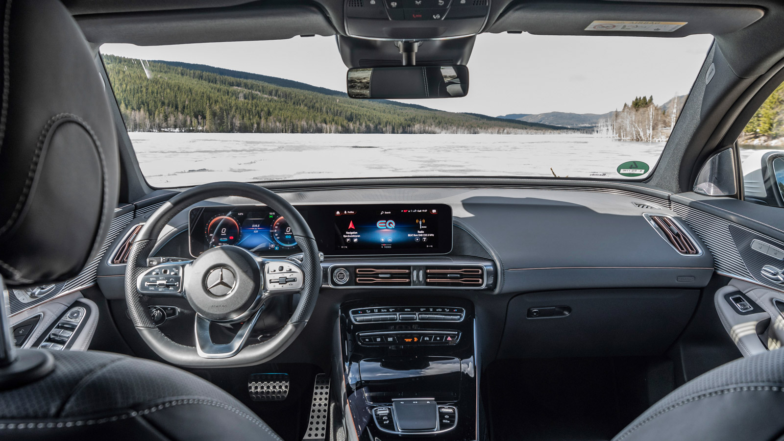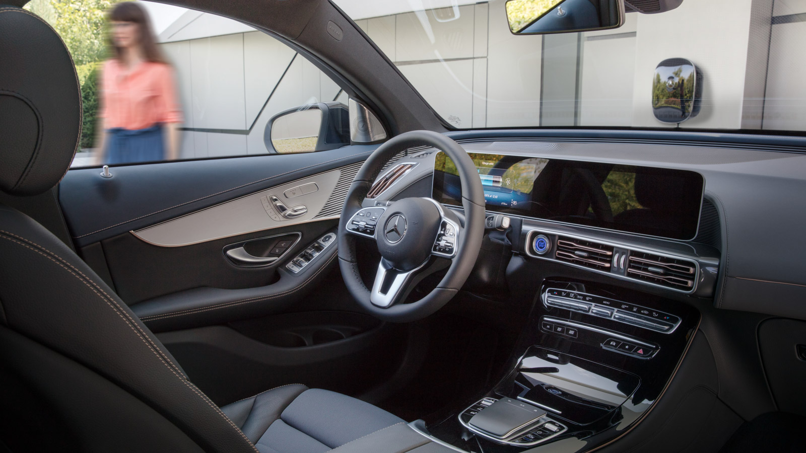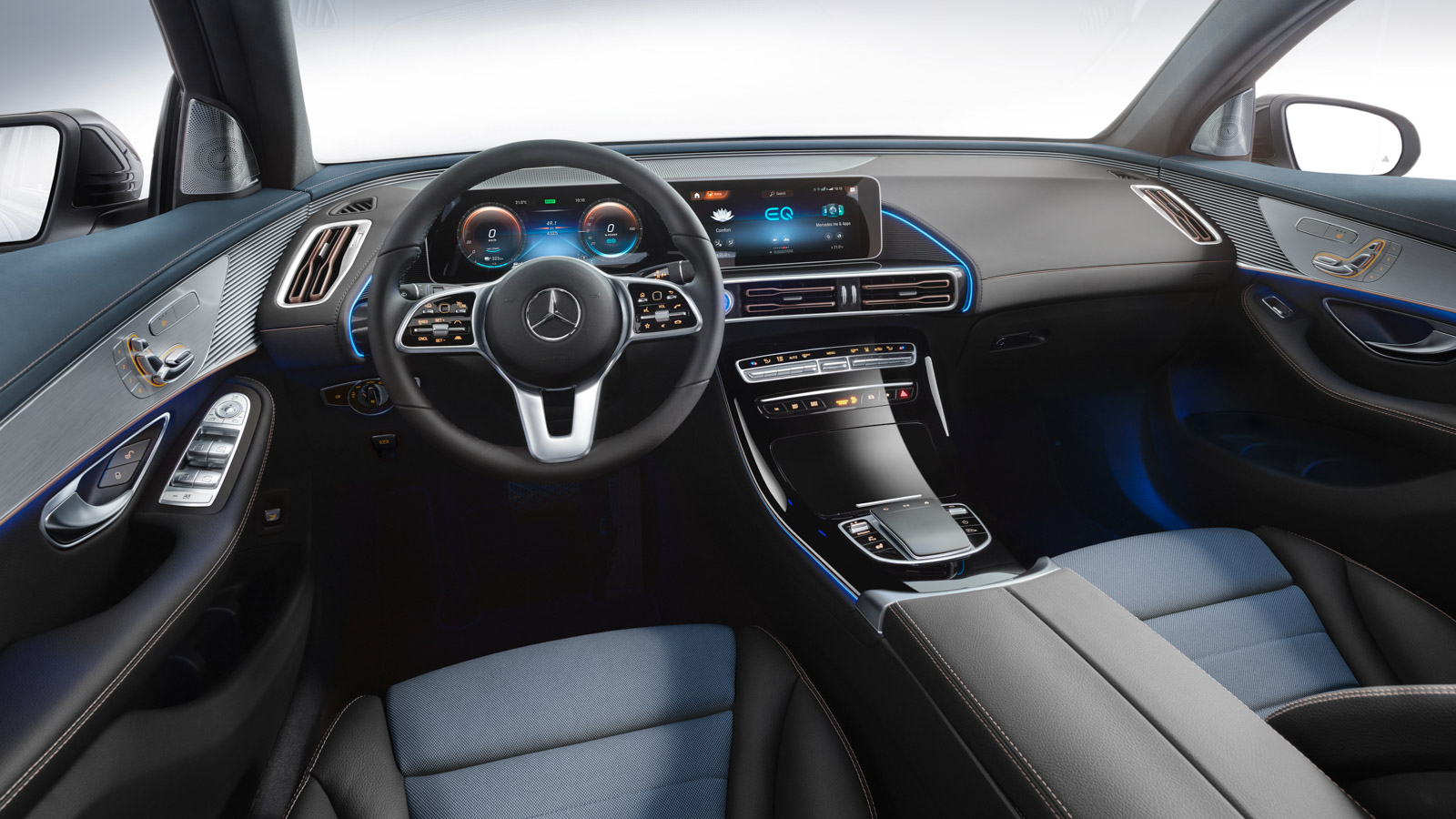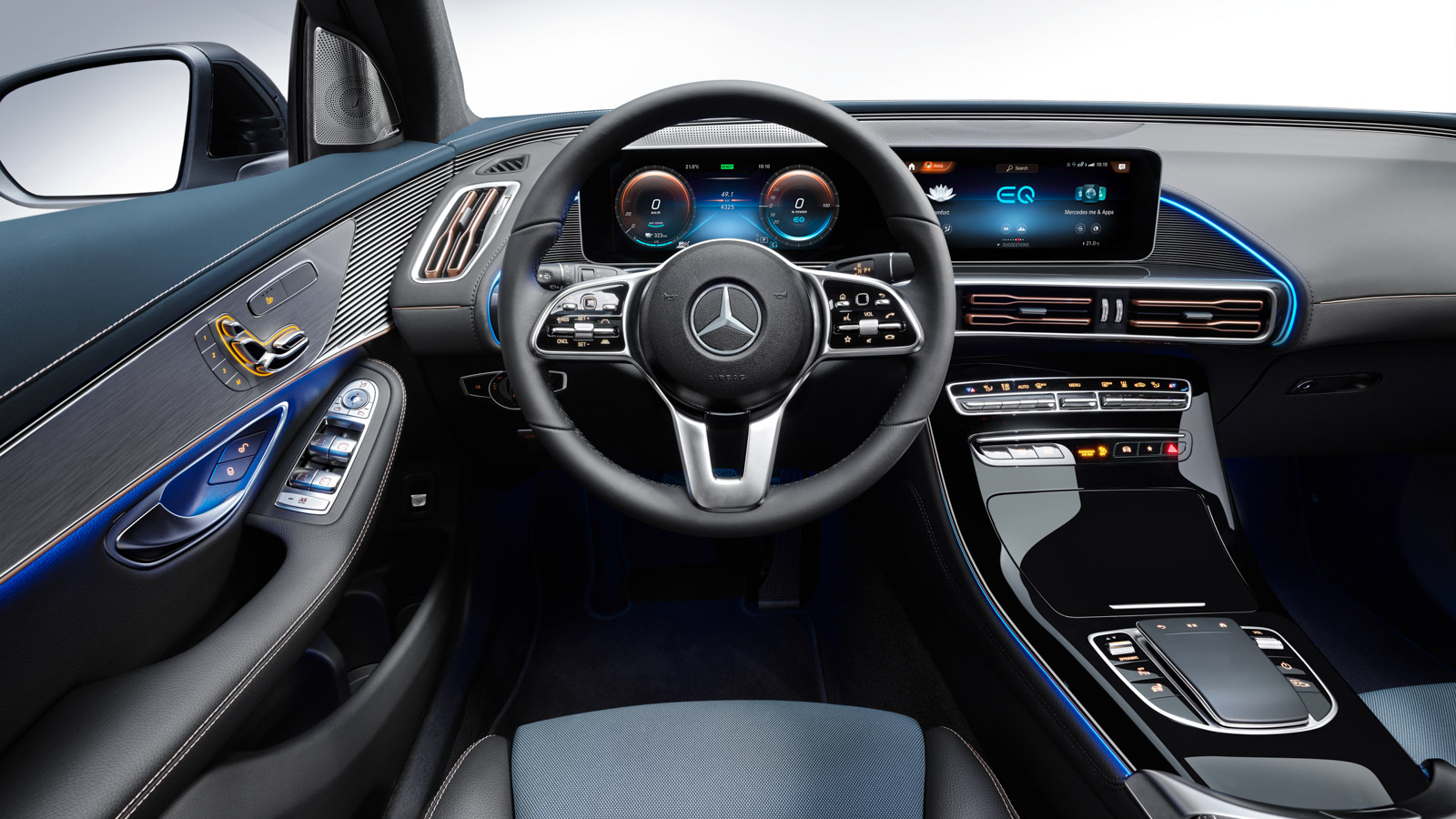 El Mercedes-Benz EQC dispone del puesto de conducción widescreen −dos pantallas de 10,25 pulgadas cada una− ,con un manejo y visualización de la instrumentación y el infoentretenimiento a través delsistemaMBUX, que gracias a su inteligencia artificial puede aprender para adaptarse y anticiparse a las acciones del usuario. Incluye un control por voz de reconocimiento de voz natural más avanzado, y el navegador tiene en cuenta para calcular la ruta más rápida las paradas necesarias para cargar la batería, mediante simulaciones permanentes de la autonomía. De forma opcional, está disponible un navegador con tecnología de realidad aumentada, un asistente que reconoce los gestos y compatibilidad con Apple Car Play y Android Auto.